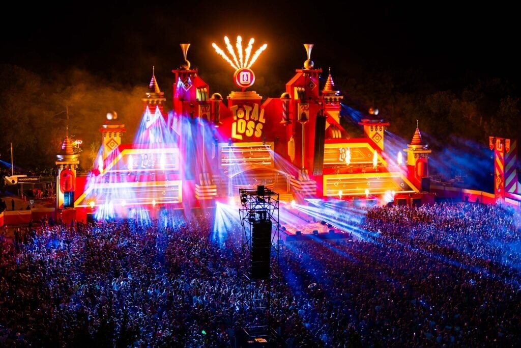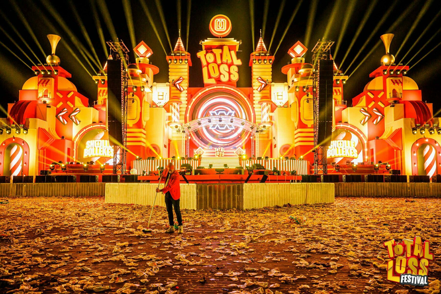 El ambiente es enérgico y espectacular, con una mezcla vibrante de luz y color. El amarillo de las luces se combina con las estructuras rojas del escenario, mientras que toques de lila dan una atmósfera única. Aunque es de noche, el ambiente está lejos de ser oscuro, gracias a la intensidad de la iluminación que llena todo el espacio.