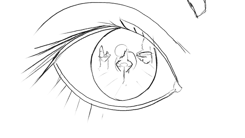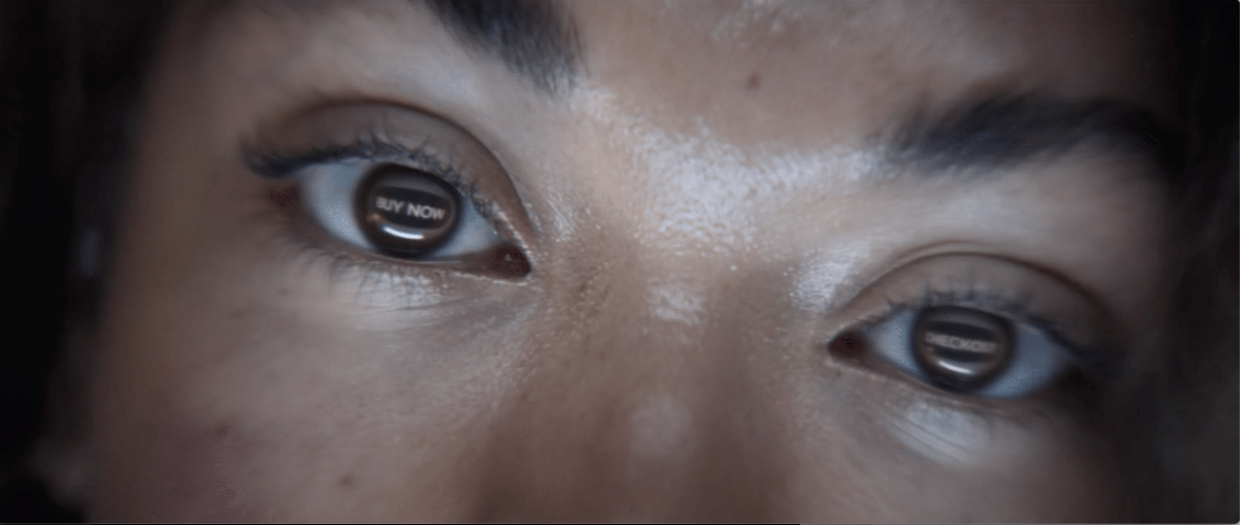 En un plano cercano de sus ojos, muy expresivo, vemos la app reflejada en su pupila.. La luz tiene un toque sutilmente mágico. Ella abre los ojos, cautivada por lo que está viendo. Vemos un icono de la app reflejado.