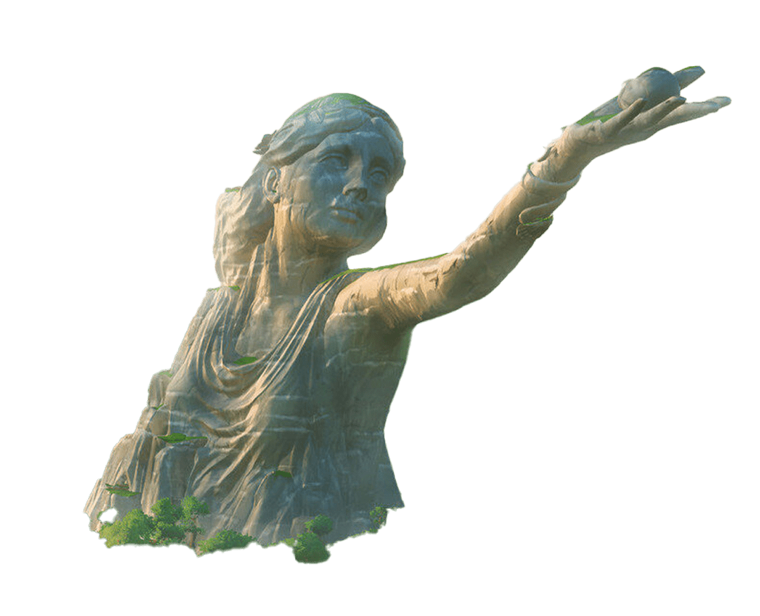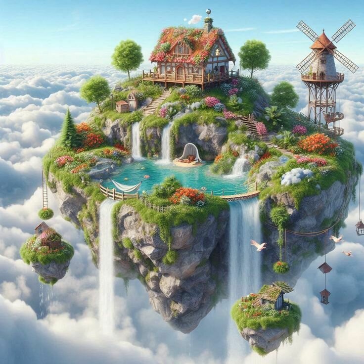 Entramos en el siguiente universo: un conjunto de islitas flotantes. Entre ellas, patatas fritas en forma de pájaros vuelan como si fueran gorriones. Algunas islas están cubiertas de nieve, otras son desiertos con pirámides, y otras están llenas de vegetación y hermosas cascadas. A lo lejos, reconocemos estatuas conocidas y monumentos icónicos, como la Torre Eiffel o el Arco del Triunfo, sobresaliendo del agua, como si hubieran sido sumergidos en este mundo surrealista.