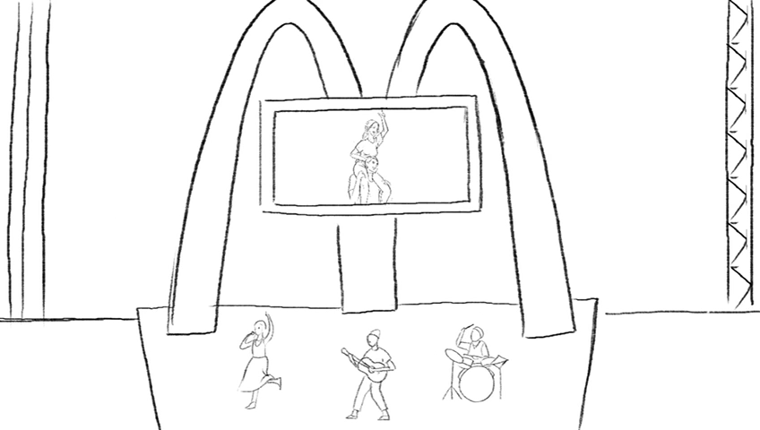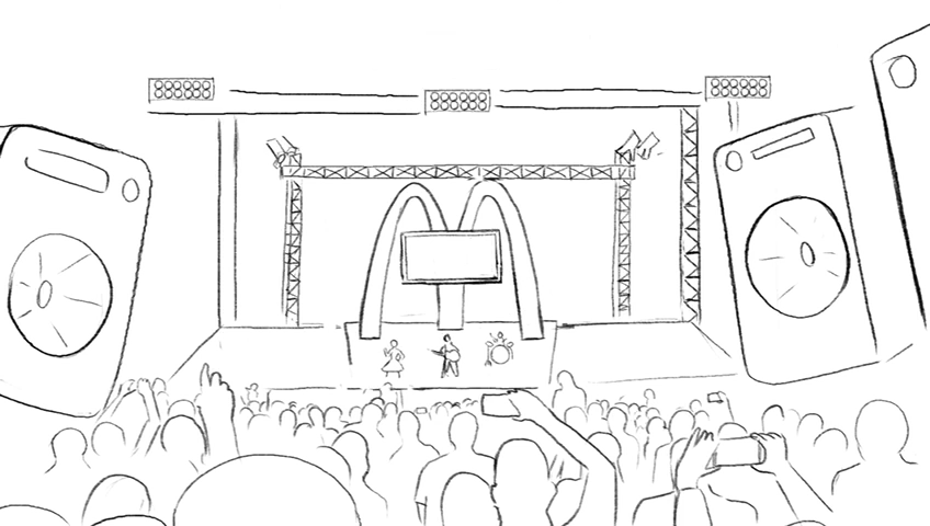 Entramos en un microestadio donde se está celebrando un concierto, viajando por encima de manos y cabezas que se mueven enérgicamente al ritmo de la música. Al fondo, se erige un escenario con una gigantesca "M" de McDonald's. Los altavoces tienen la forma de bolsas de patatas fritas, en colores rojo y amarillo. La torre central de los técnicos es una bebida gigantesca de McDonald's. A los lados, pequeños escenarios colgantes con el resto de la banda, baterías, guitarras eléctricas, de donde salen, como chispas, monedas disparadas. También hay pantallas gigantes típicas de un gran estadio de fútbol americano, donde vemos de cerca las caras de los músicos. Notas musicales flotan por el aire.