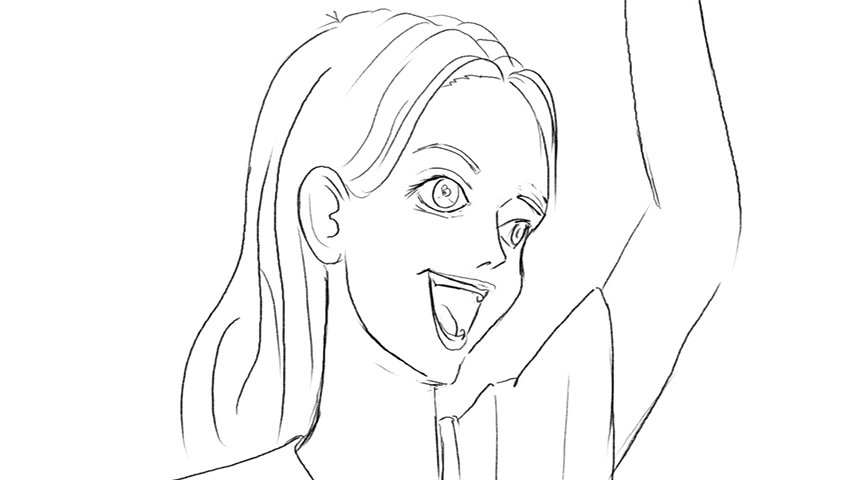 Vemos el contraplano: Alicia grita de emoción. En un momento, mira hacia arriba y la cámara hace un rápido tilt-up.