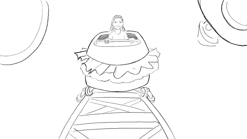 La primera idea es incluir a Alicia en algún otro punto de la acción, mostrando cómo su versión 2D reacciona a este maravilloso universo que descubre junto al espectador. Esto no solo reforzaría la experiencia emocional del público, sino que también nos permitiría incorporar acciones que aporten dinamismo y variedad a la narrativa.