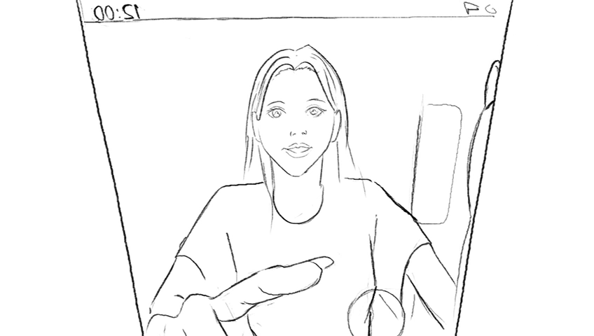 Vemos a la Alicia real desde el interior del móvil. Su expresión es idéntica a la de la Alicia 2D del vagón. Entonces, ella hace un movimiento de zoom in con los dedos.