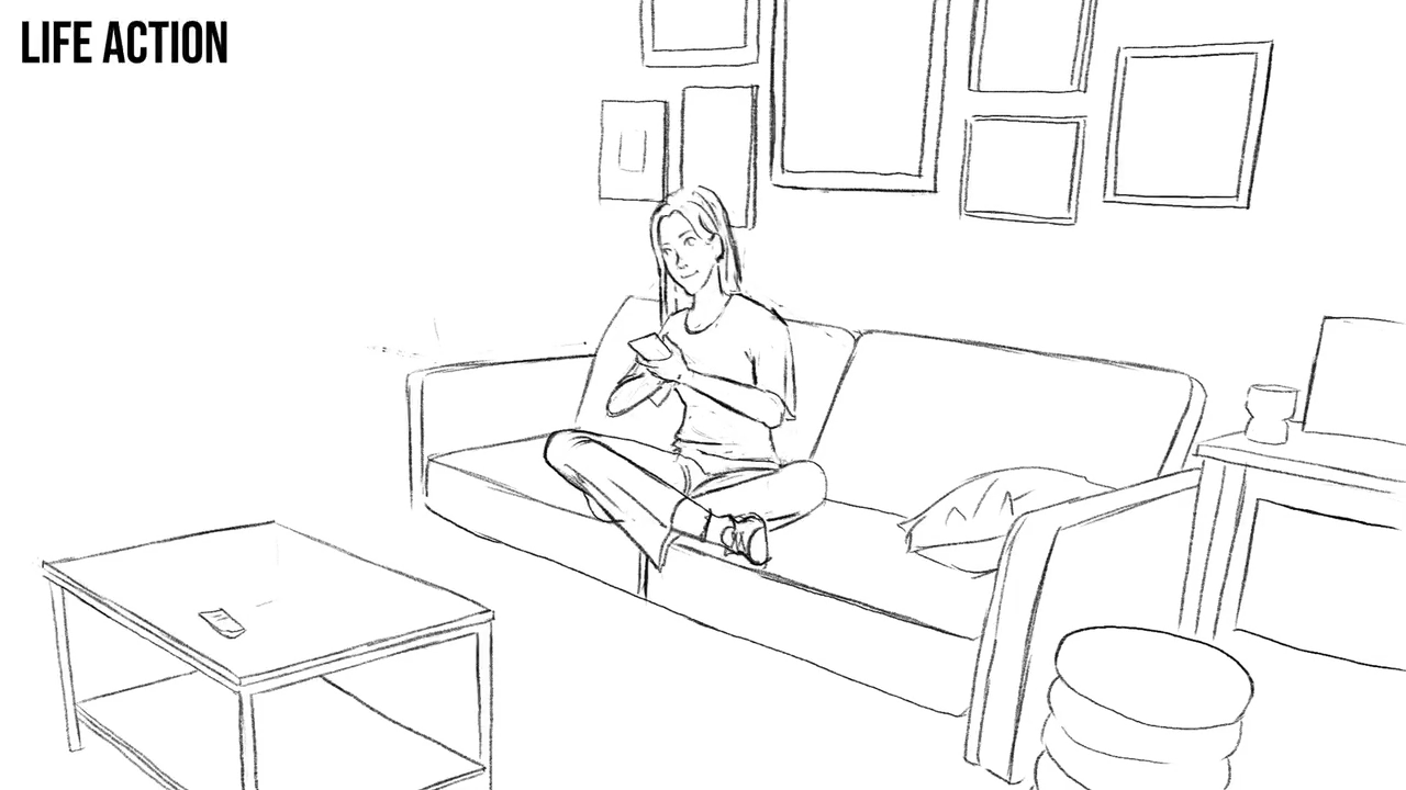 Empezamos en el salón de casa de Alicia. Ella está sentada en el sofá, relajada, scrolleando en su móvil. La cámara se acerca en un movimiento fluído de steadycam. Entonces, Alicia se incorpora un poco más, como si estuviera tomando una decisión.