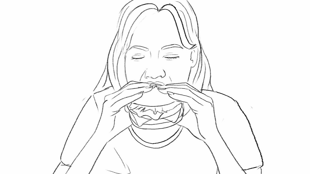 La cámara hace un movimiento circular alrededor de ella mientras contempla ilusionada su hamburguesa...