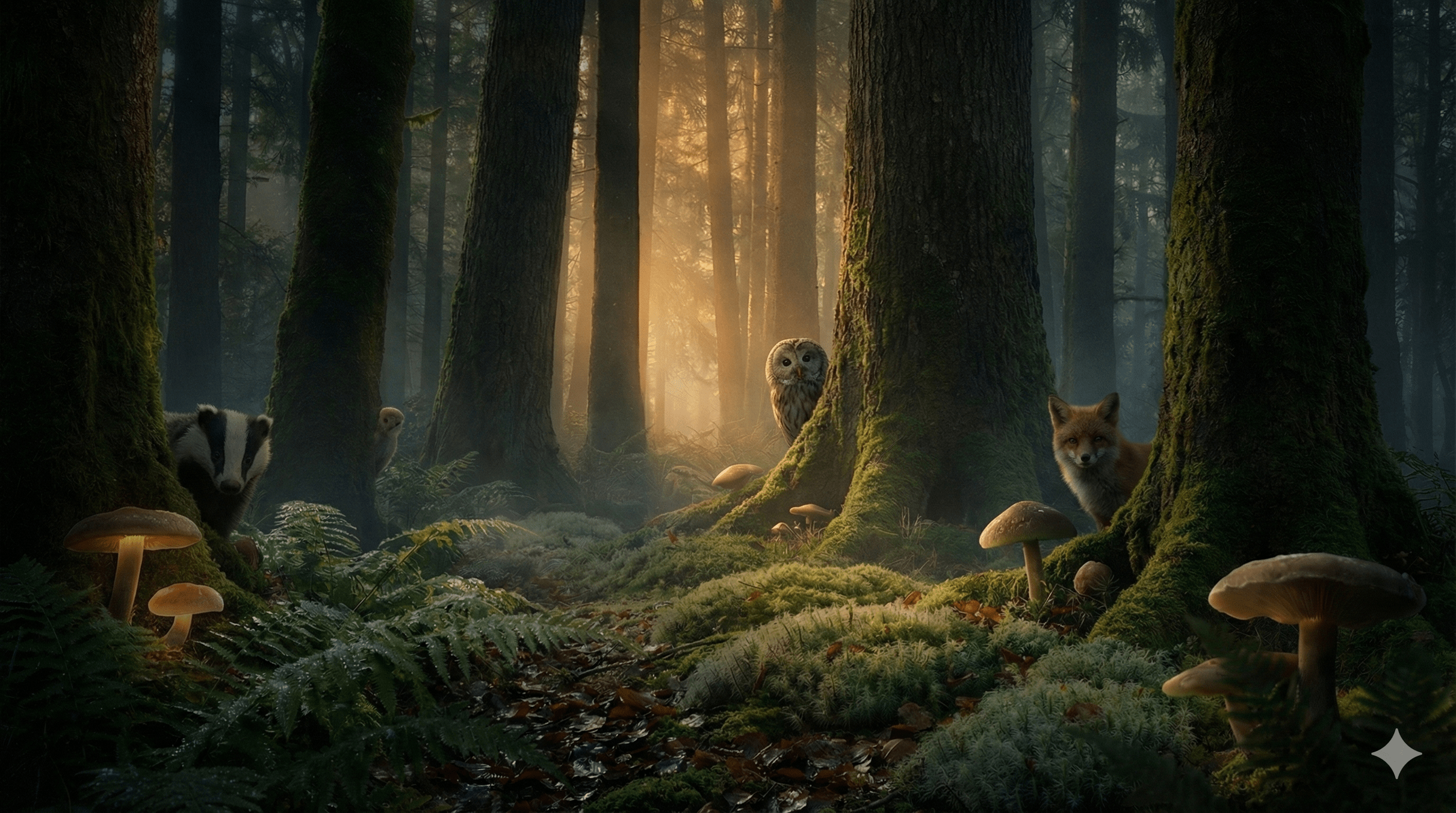 It looks dark, but there are some bright and shiny places between the trees. I can see furry animals and soft-looking plants around me. It is quiet, and the sounds are very faint. It smells fresh, but sometimes the smell is strong. The ground feels wet and is a little rough-looking, but the air feels clean.