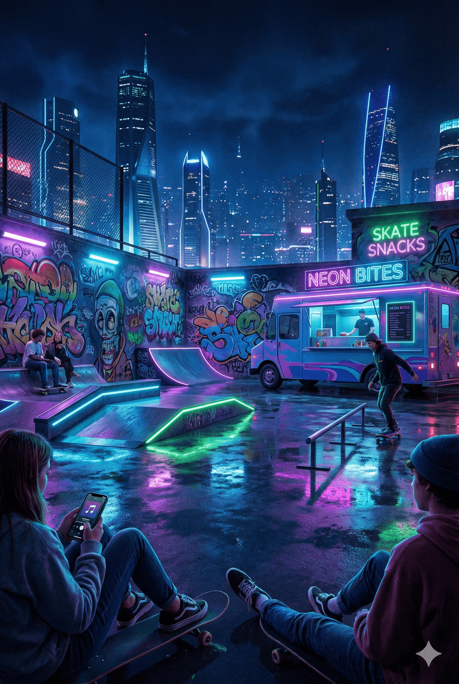 I I’m in a neon rooftop skate park.