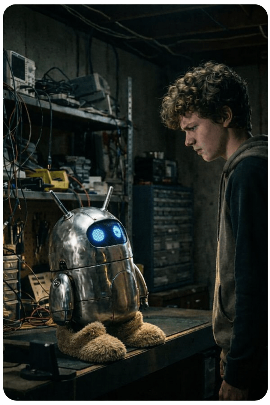 2. He looks a bit confused because he created a fresh/strange robot.