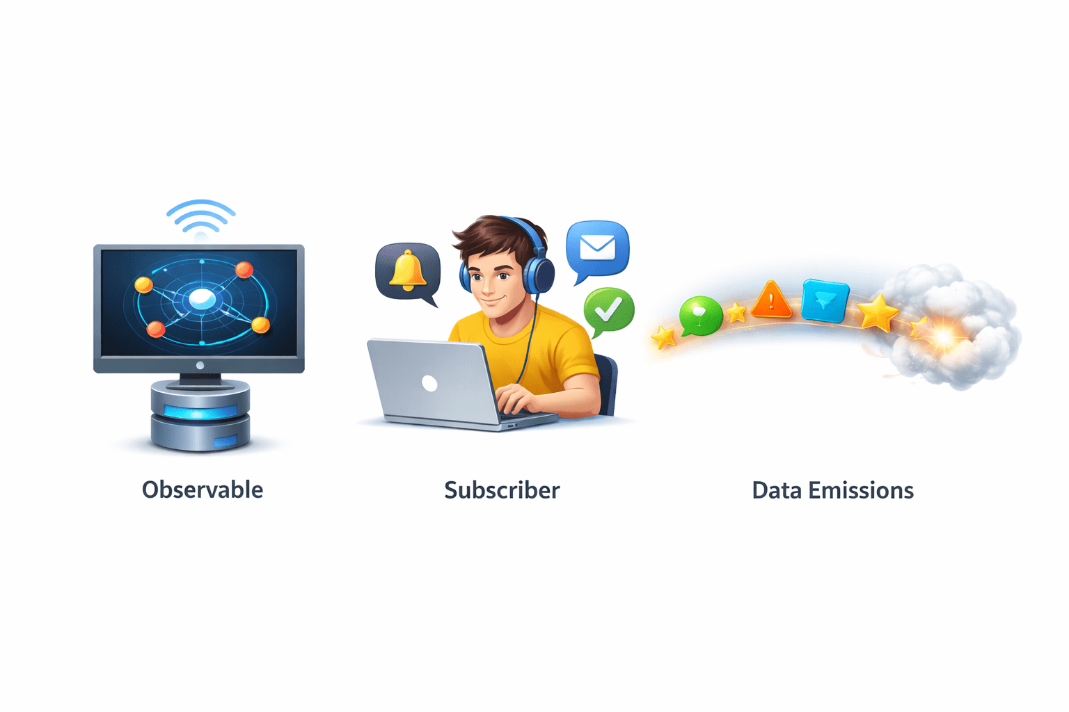 Observable → Emits Data → Subscriber ReactsCreating Observables