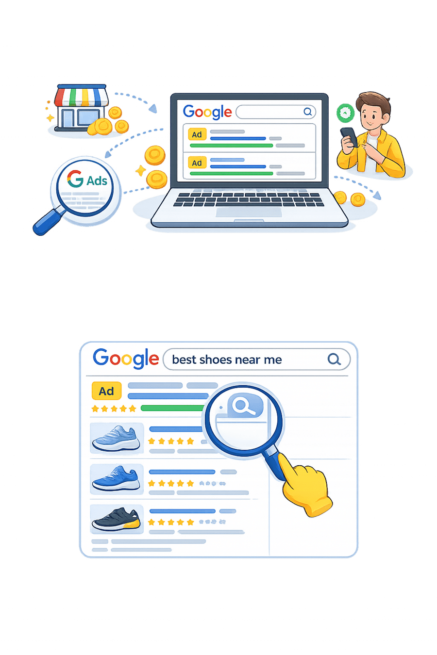 If you search “best shoes near me”, the top results marked “Ad” are from Google Ads