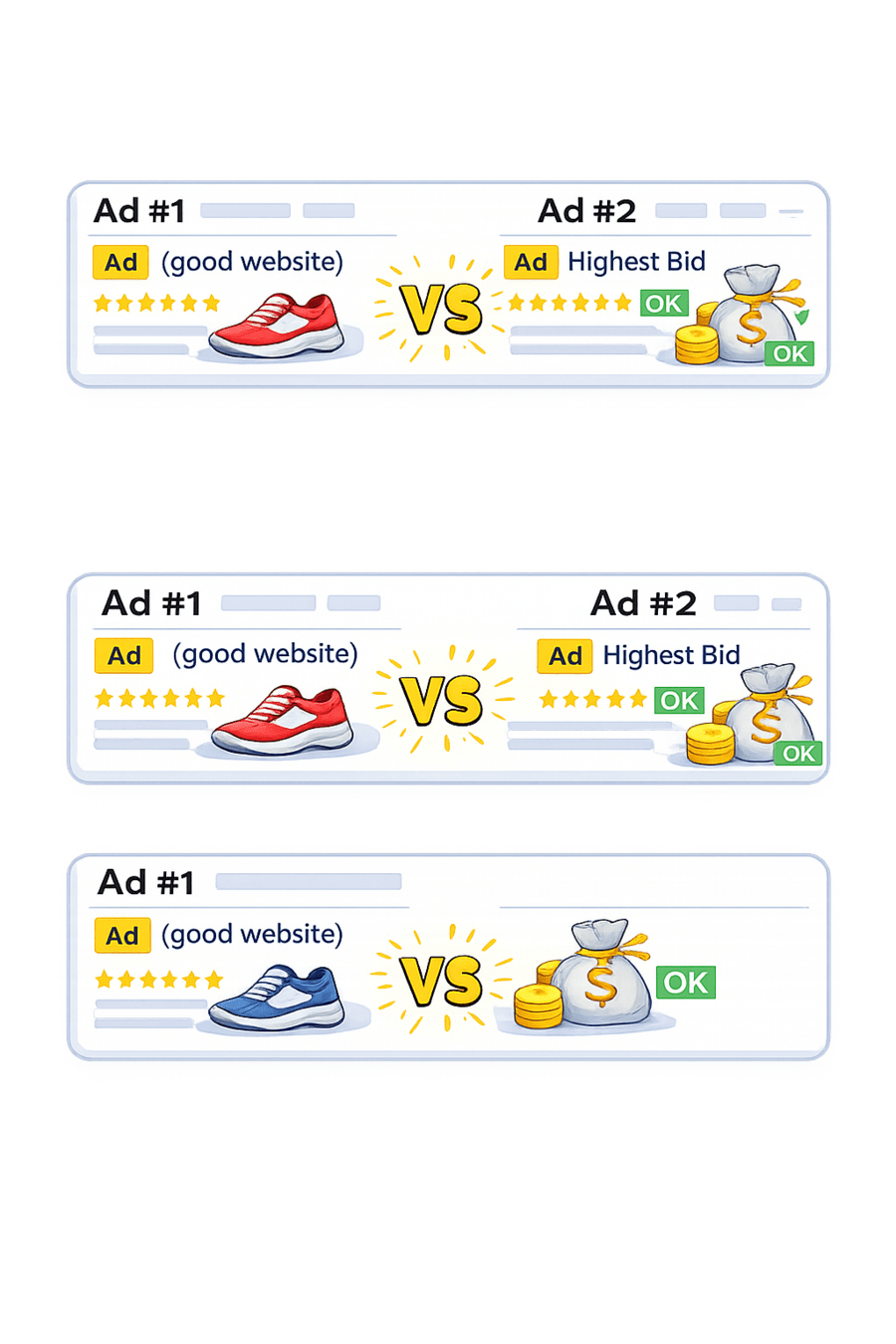 The one with better ad + good website can appear higher (not just highest money)