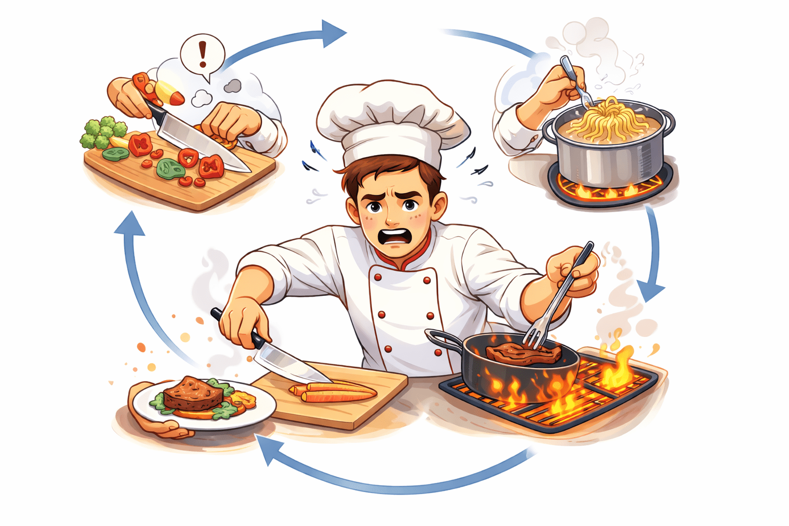 chopping vegetables, boiling pasta, grilling, plating — customers would wait forever. Chaos. Delays. Complaints.