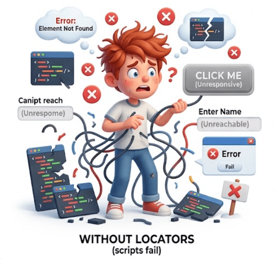 Without locators, the script is like a visitor wandering aimlessly, unable to perform any meaningful action.