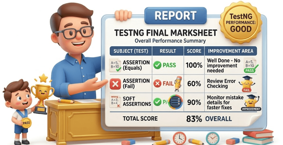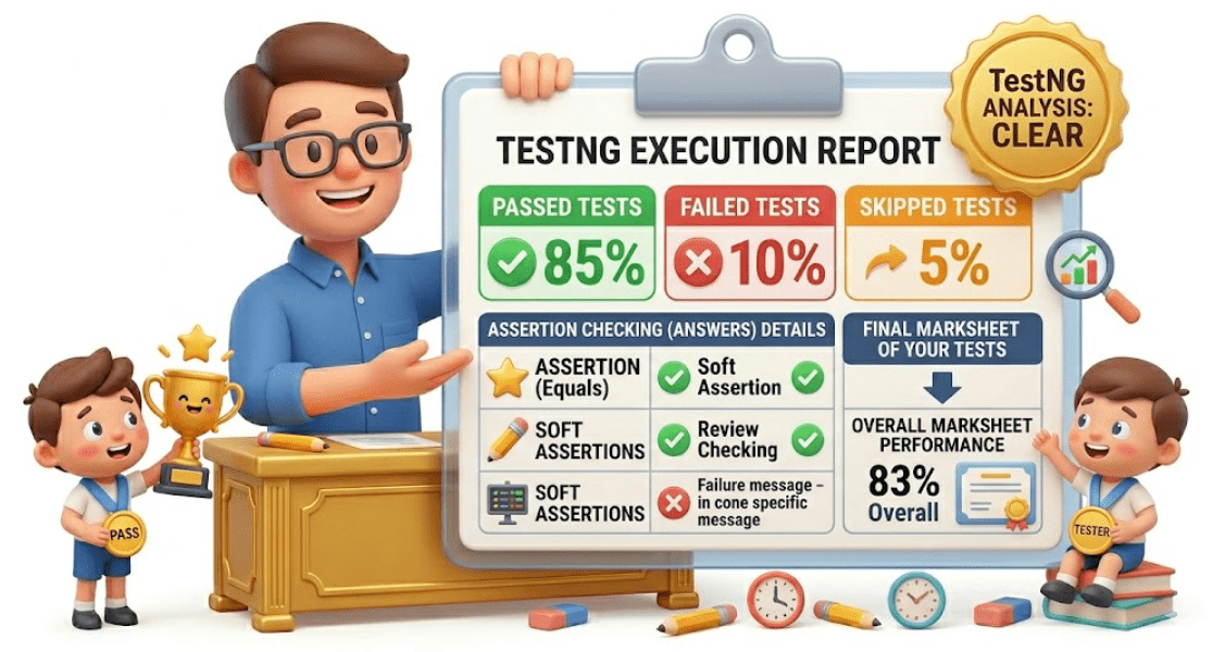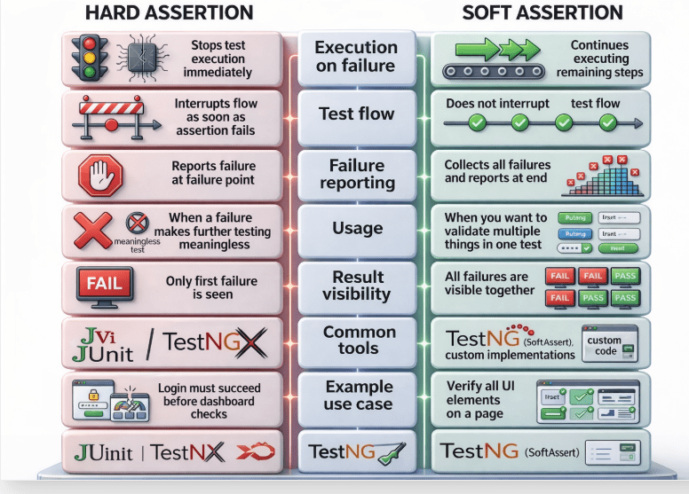 If the condition is false, TestNG raises an AssertionError, and the test is marked FAILED (for hard assertions)