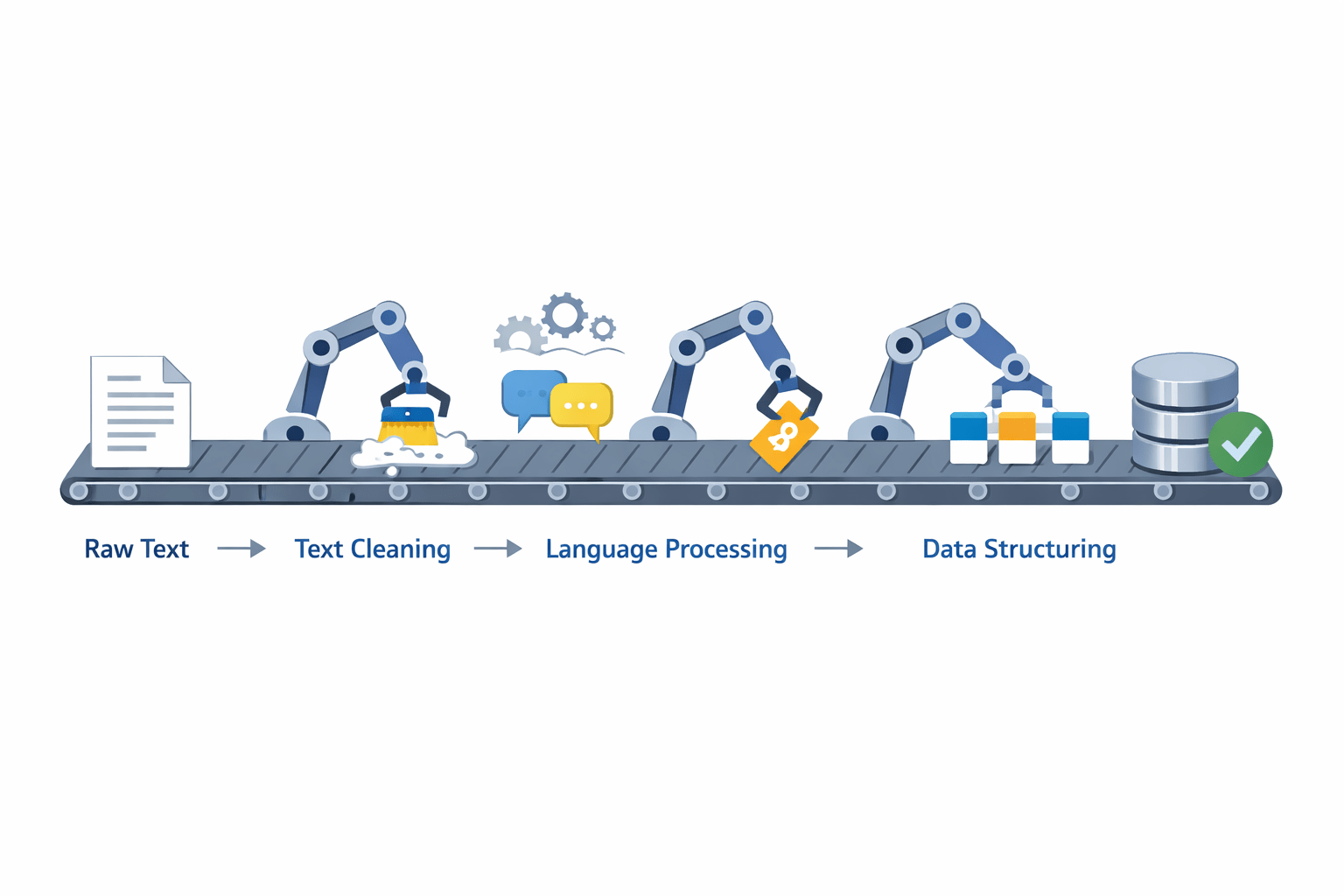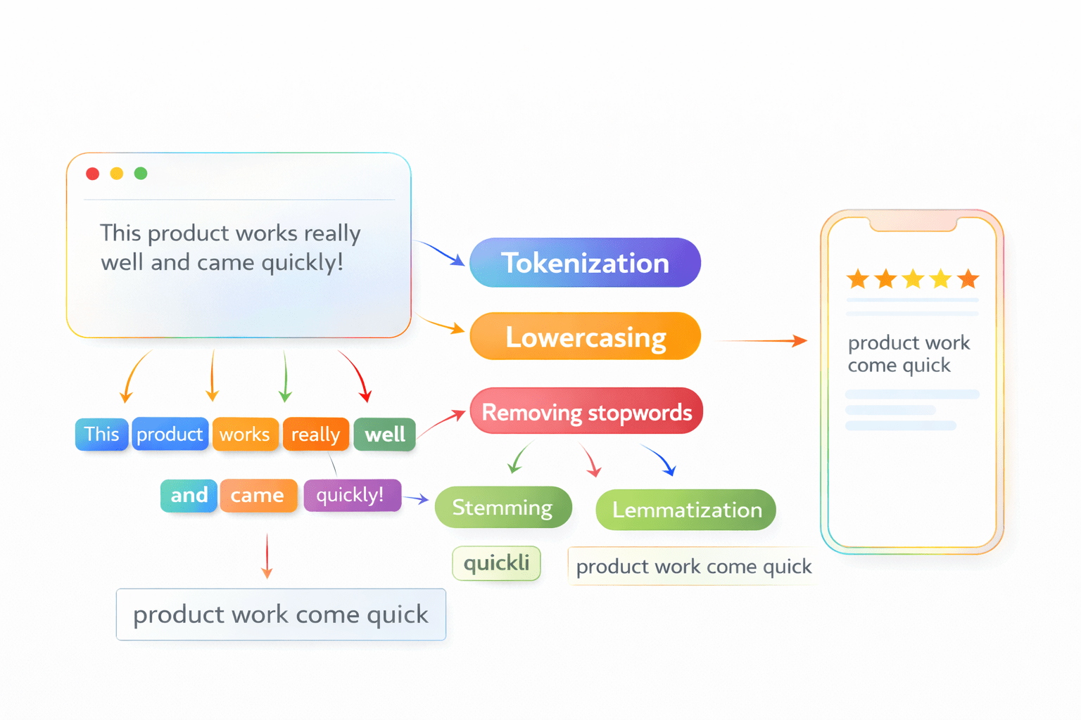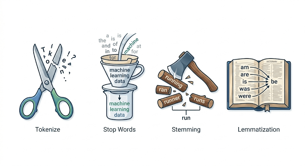 Text preprocessing is not just one action; it is a step-by-step assembly line.