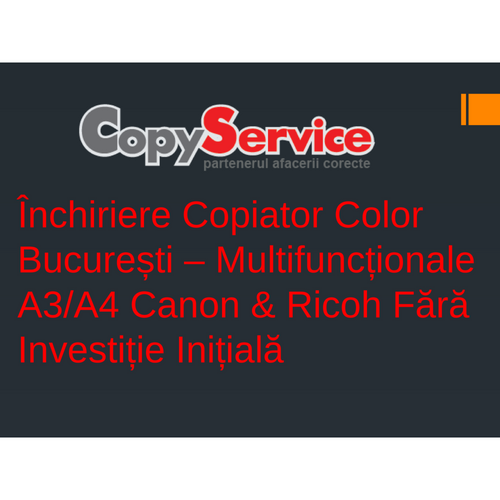 Cauți Închiriere Copiator Color în București la cel mai bun raport calitate-preț? CopyService îți pune la dispoziție imprimante și multifuncționale color profesionale Canon și Ricoh (format A4/A3), cu viteze de până la 40 pagini/minut, rezoluție 1.200 dpi și scanare duplex automată. Abonamentul lunar include mentenanță completă, toate consumabilele (toner original, cilindru, piese de schimb), suport tehnic prioritar și înlocuirea gratuită a echipamentului în caz de defecțiune. Plătești doar costul pe copie – fără investiție inițială și fără costuri ascunse! Optimizează-ți fluxul de documente și redu costurile operaționale. Sună acum la 021 610 28 32 sau vizitează https://www.copyservice.ro/inchirieri-copiatoare-bucuresti/ pentru o ofertă personalizată! Performanță color superioară și fiabilitate 100% garantată.