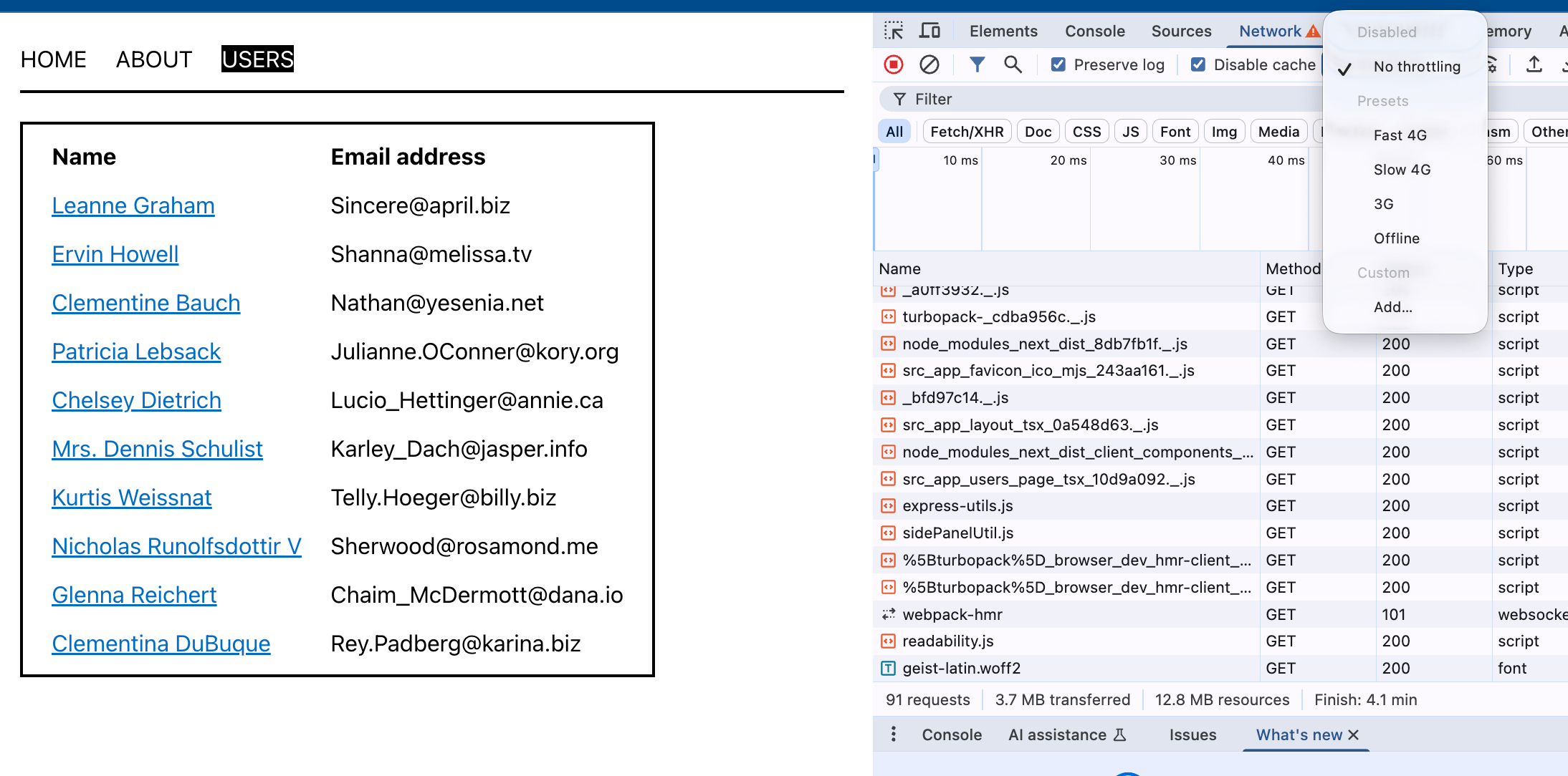 - /users → tabel met name + email (https://jsonplaceholder.typicode.com/users)