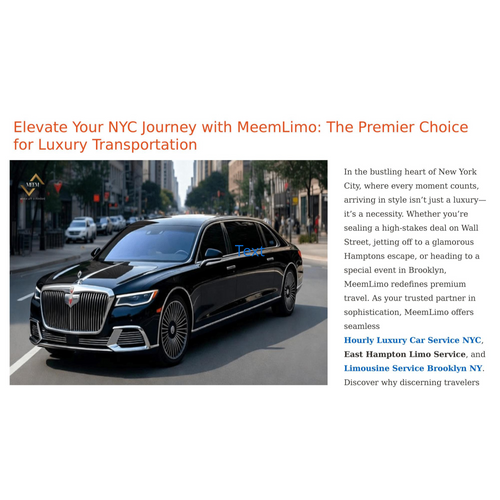 In the bustling heart of New York City, where every moment counts, arriving in style isn’t just a luxury—it’s a necessity. Whether you’re sealing a high-stakes deal on Wall Street, jetting off to a glamorous Hamptons escape, or heading to a special event in Brooklyn, MeemLimo redefines premium travel. As your trusted partner in sophistication, MeemLimo offers seamless Hourly Luxury Car Service NYC, East Hampton Limo Service, and Limousine Service Brooklyn NY. Discover why discerning travelers choose us for an unmatched blend of elegance, reliability, and personalized service.
