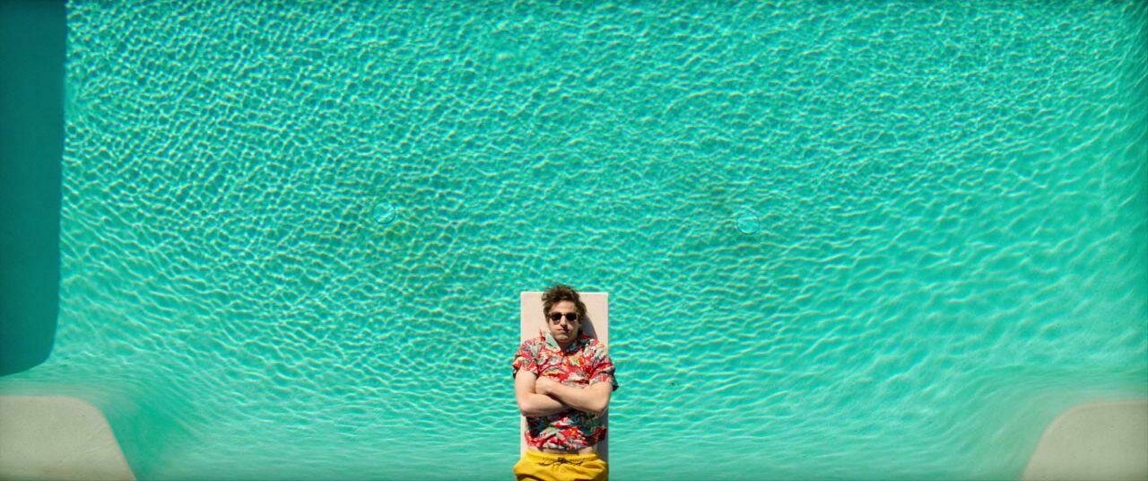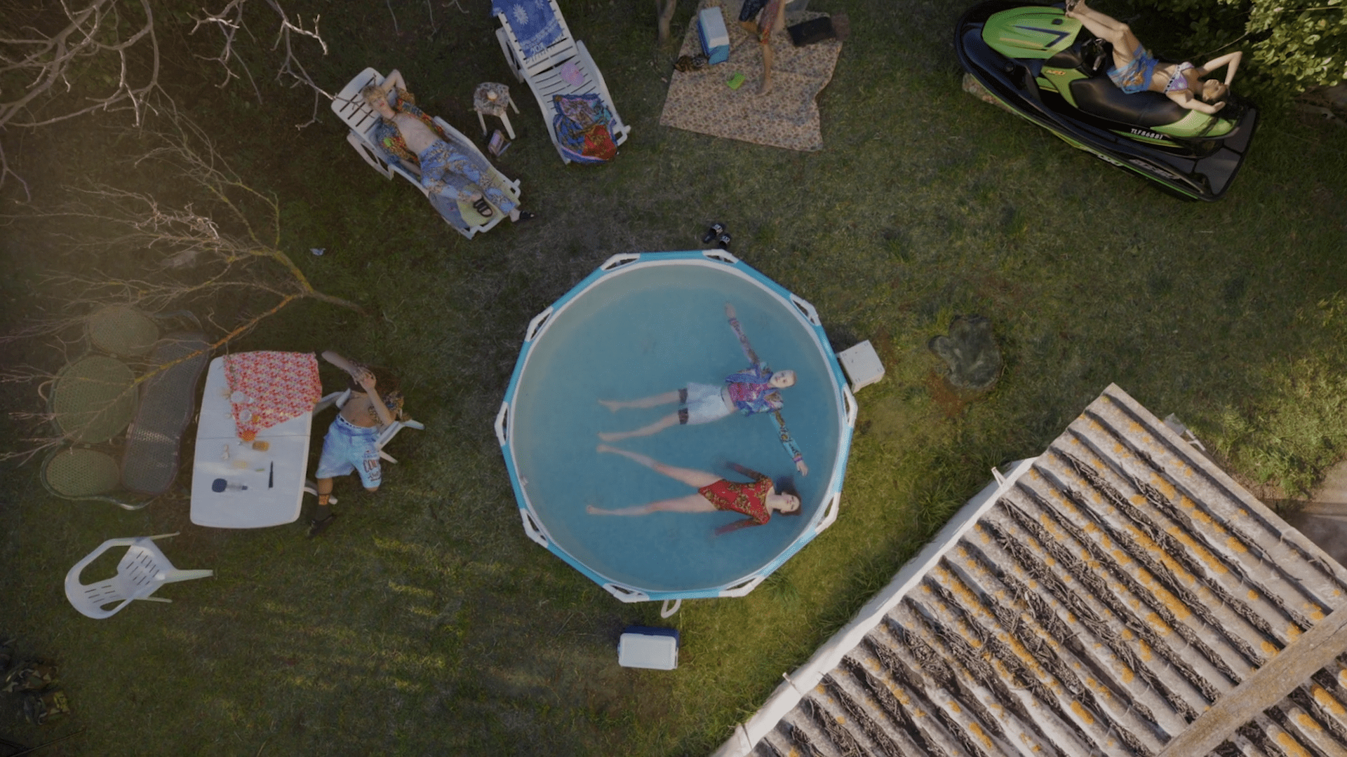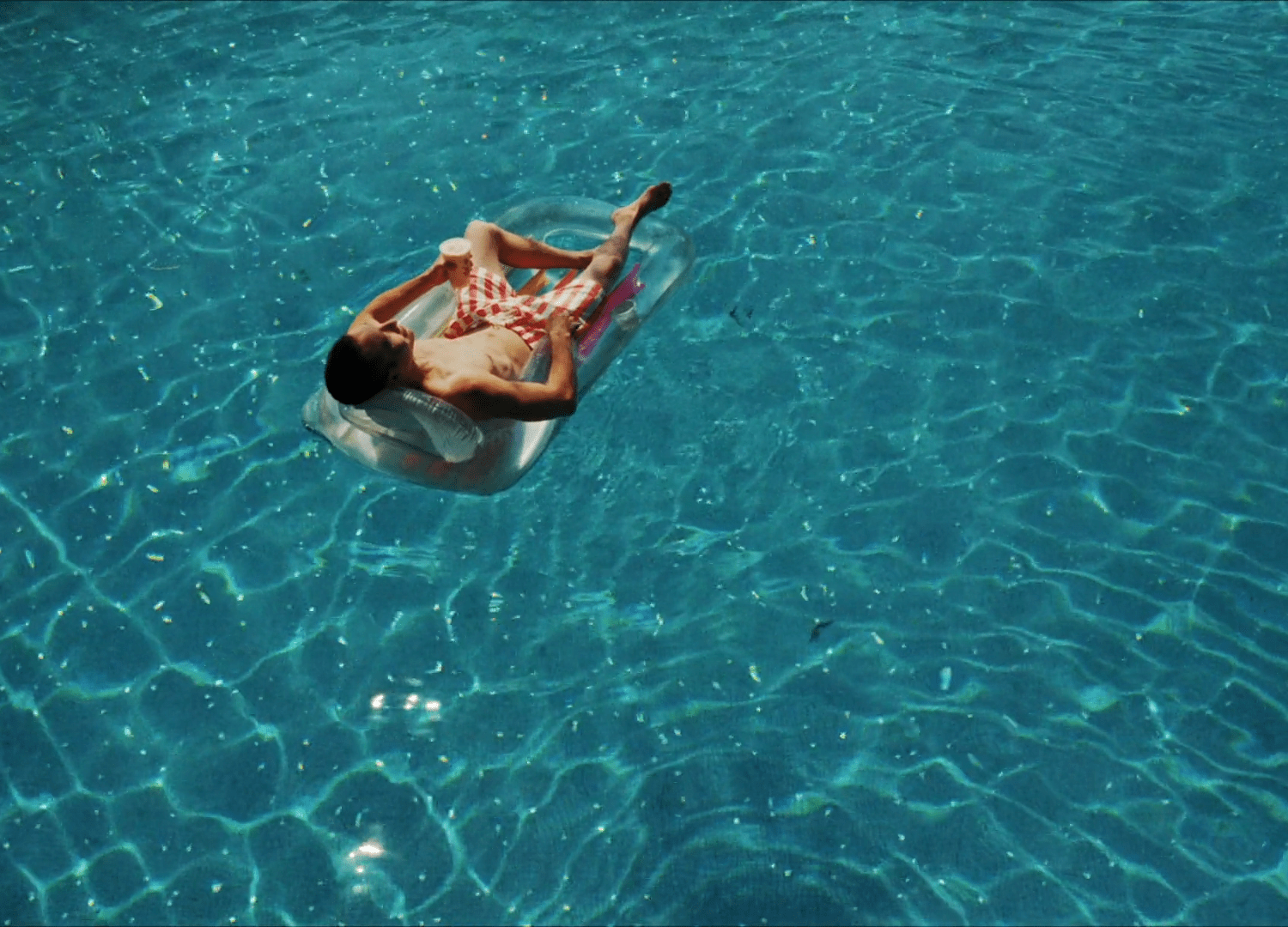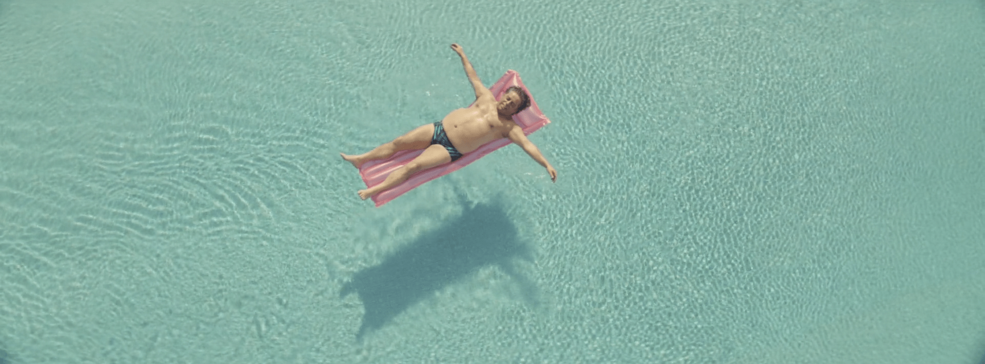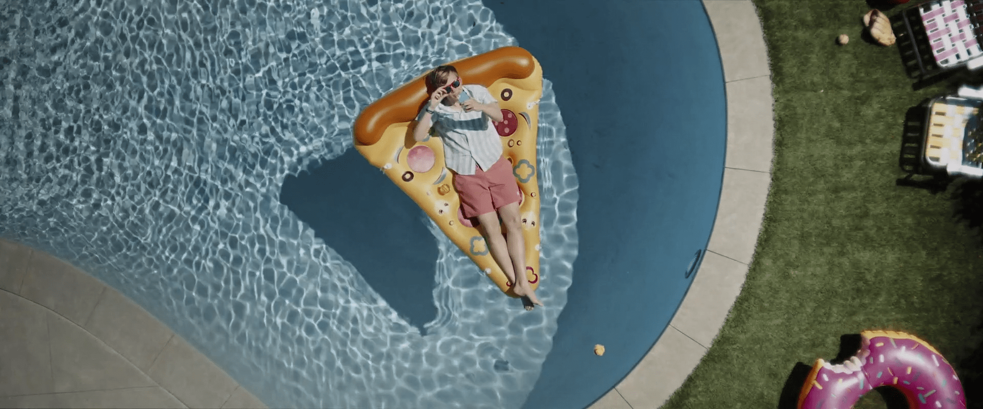 2-Con un plano aéreo, hacemos un zoom out que nos muestra una vista general de la piscina. Los flotadores tienen forma de X y O, moviéndose por el agua. En un momento, se forma una línea clara de flotadores en forma de O sobre el agua, y en uno de ellos está Víctor rascando su boleto. Un paneo nos traslada a otra localización.
