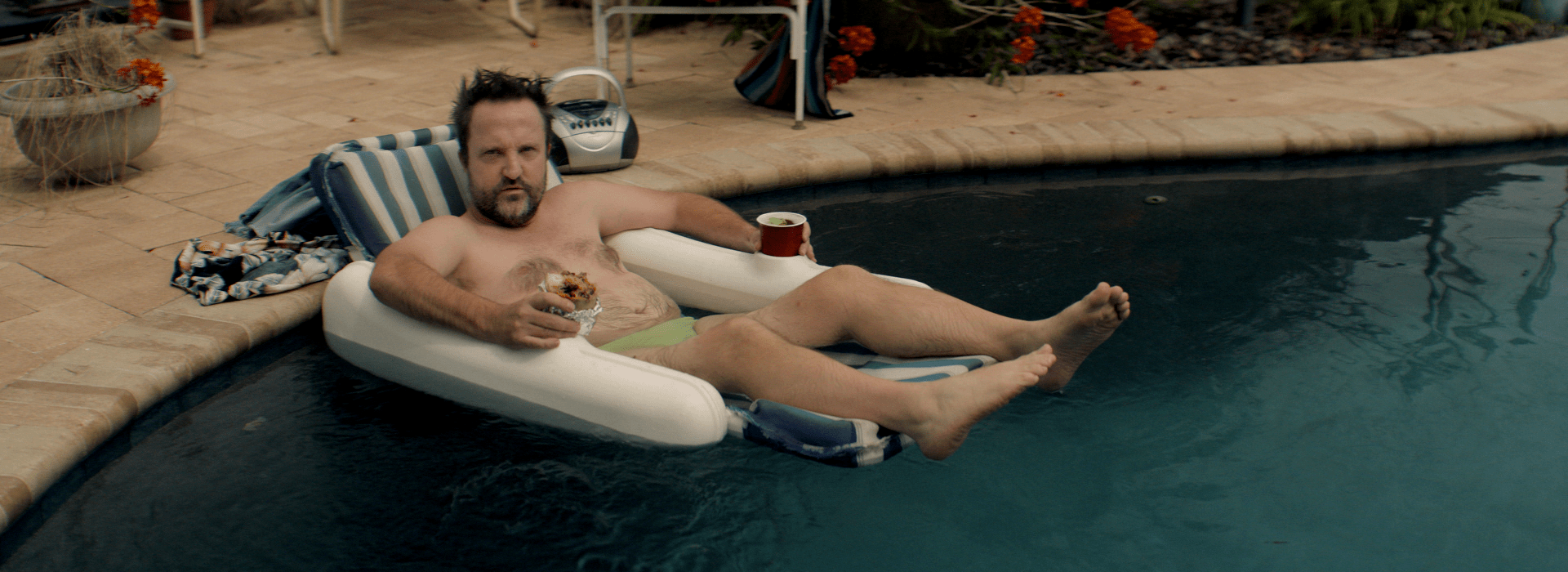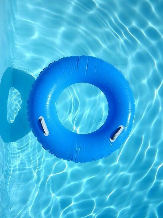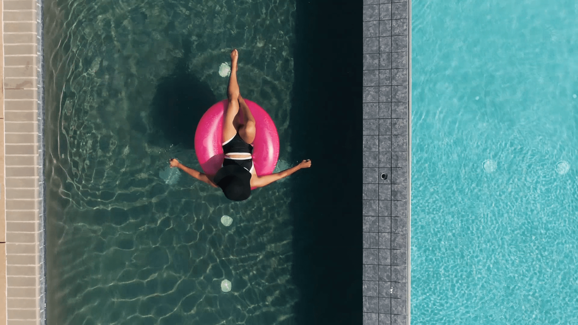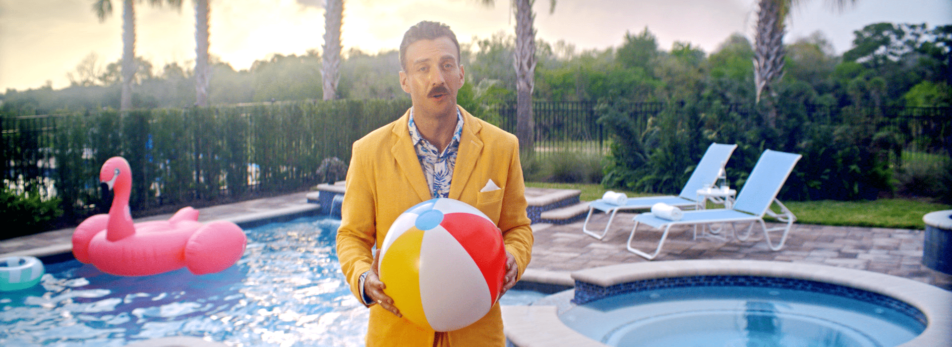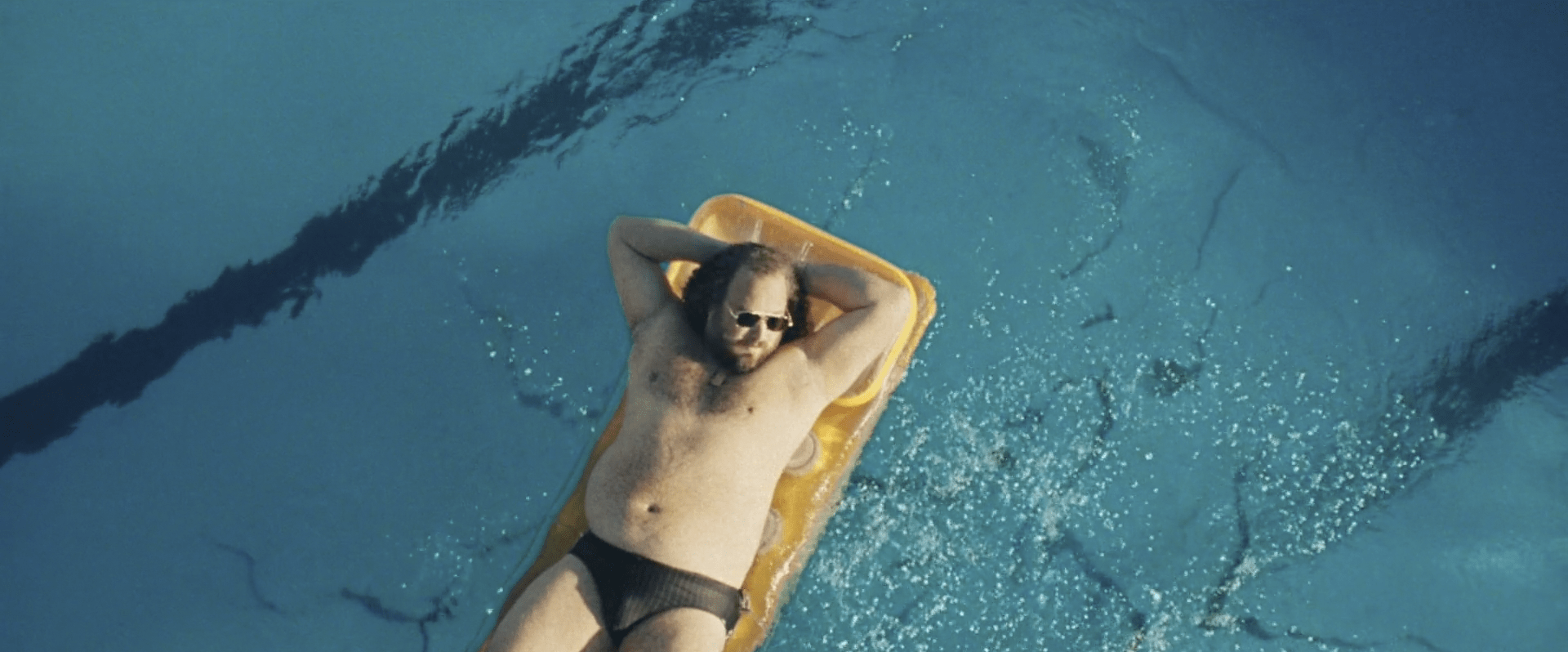 2-Con un plano aéreo, hacemos un zoom out que nos muestra una vista general de la piscina. Los flotadores tienen forma de X y O, moviéndose por el agua. En un momento, se forma una línea clara de flotadores en forma de O sobre el agua, y en uno de ellos está Víctor rascando su boleto. Un paneo nos traslada a otra localización.