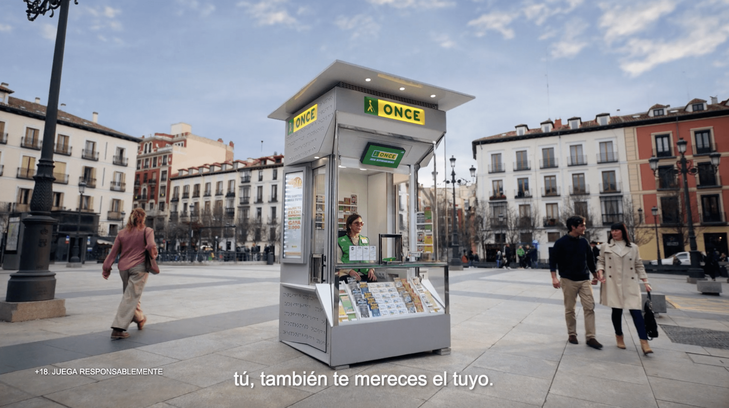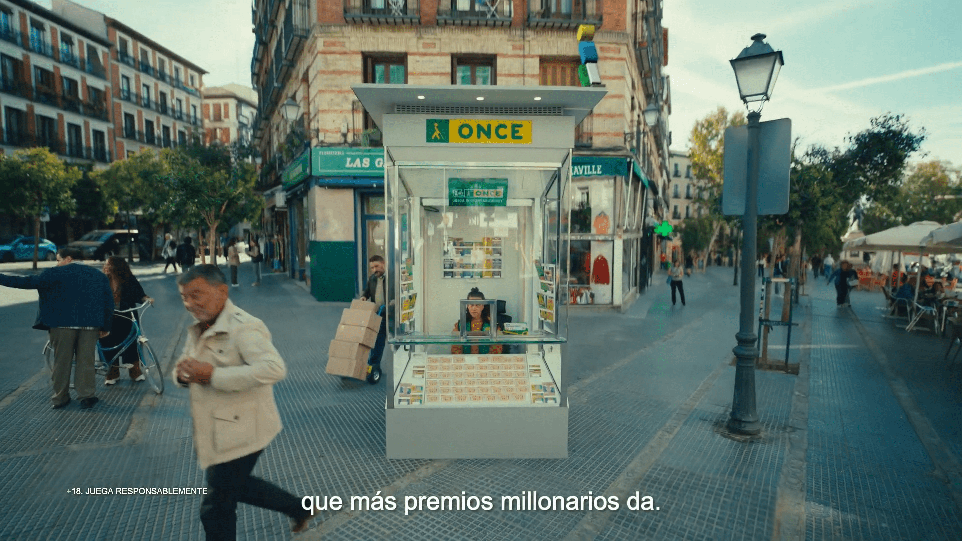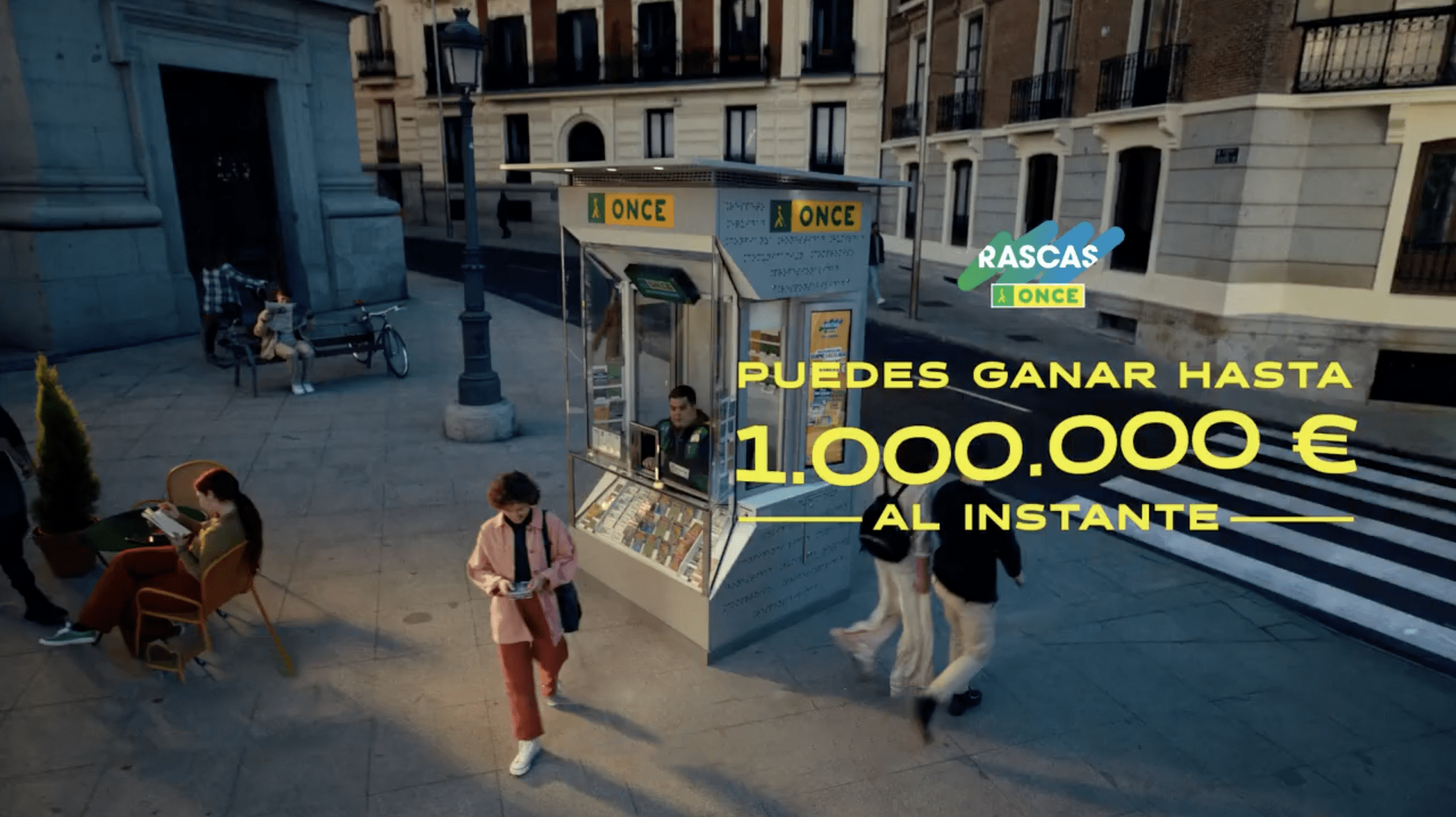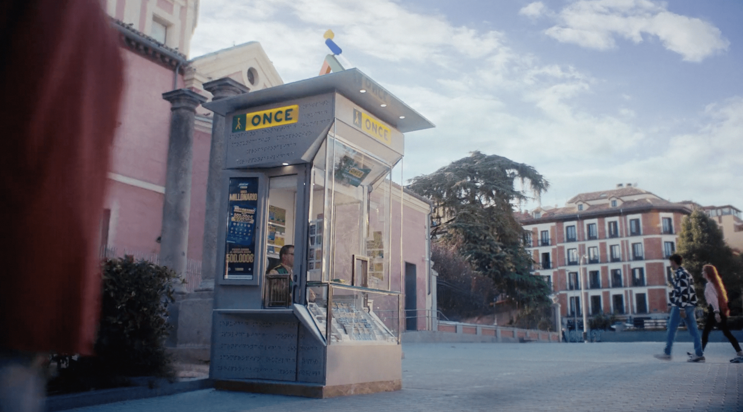 1- Comenzamos con un kiosko de la ONCE en medio de una plaza vivida. A su alrededor existen edificios de colores que dan vitalidad y frescura a la campaña que vamos a experimentar. De golpe, un zoom in nos presenta el kiosko. ¡ZAS! Al acercarnos, no solo vemos mejor el kiosco, sino que reconocemos a una persona que se acerca al mostrador para comprar su boleto.