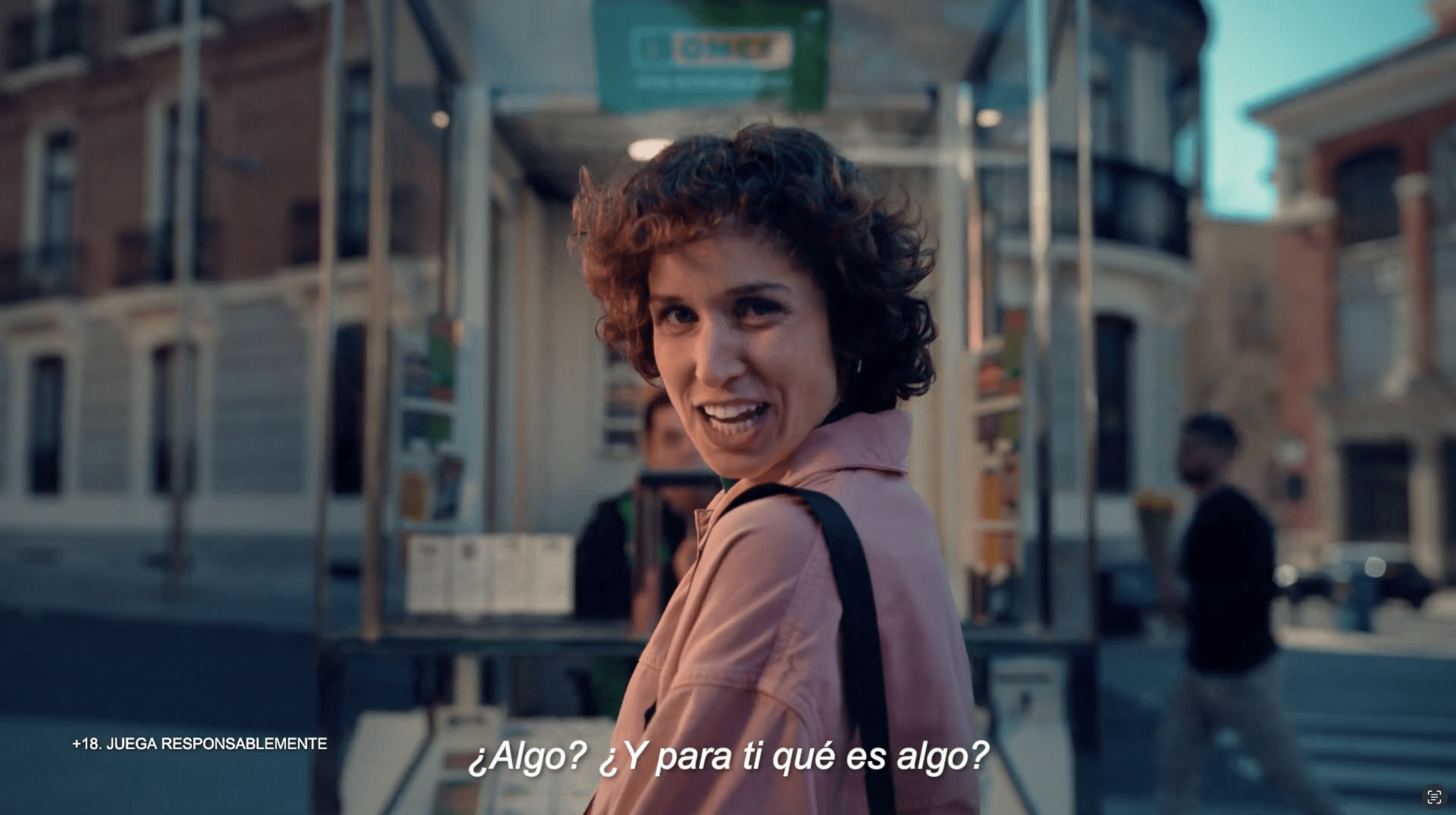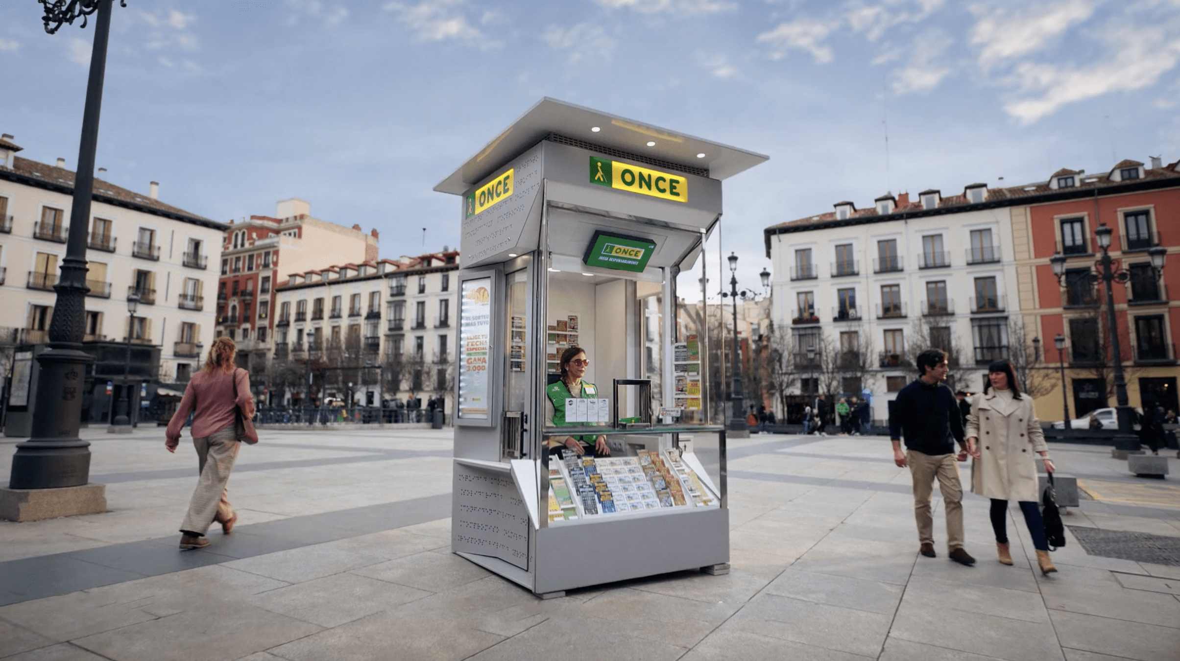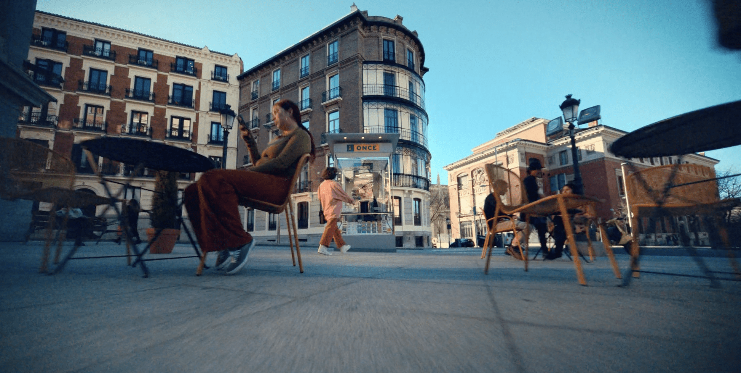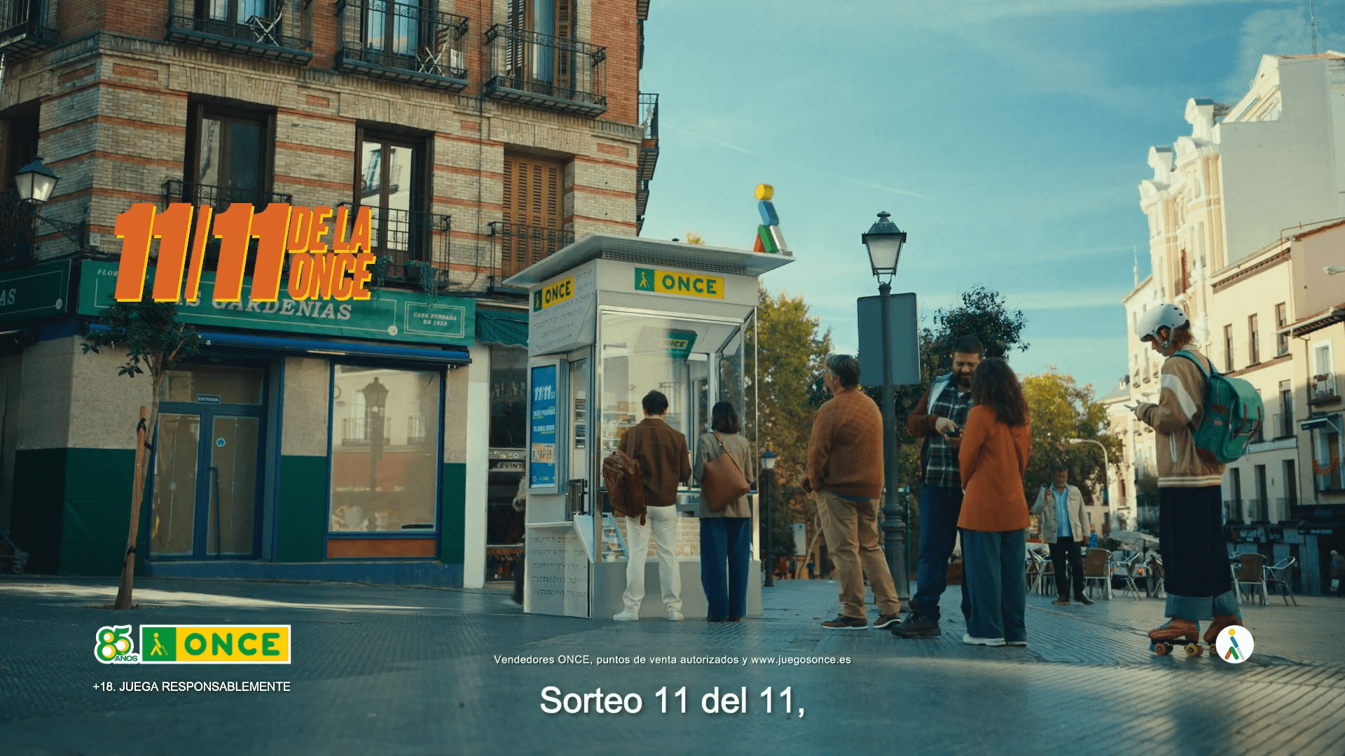 1- Comenzamos con un kiosko de la ONCE en medio de una plaza vivida. A su alrededor existen edificios de colores que dan vitalidad y frescura a la campaña que vamos a experimentar. De golpe, un zoom in nos presenta el kiosko. ¡ZAS! Al acercarnos, no solo vemos mejor el kiosco, sino que reconocemos a una persona que se acerca al mostrador para comprar su boleto.
