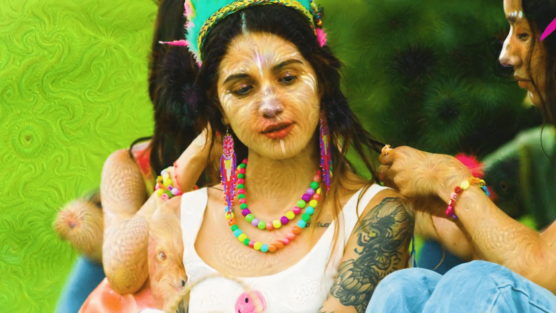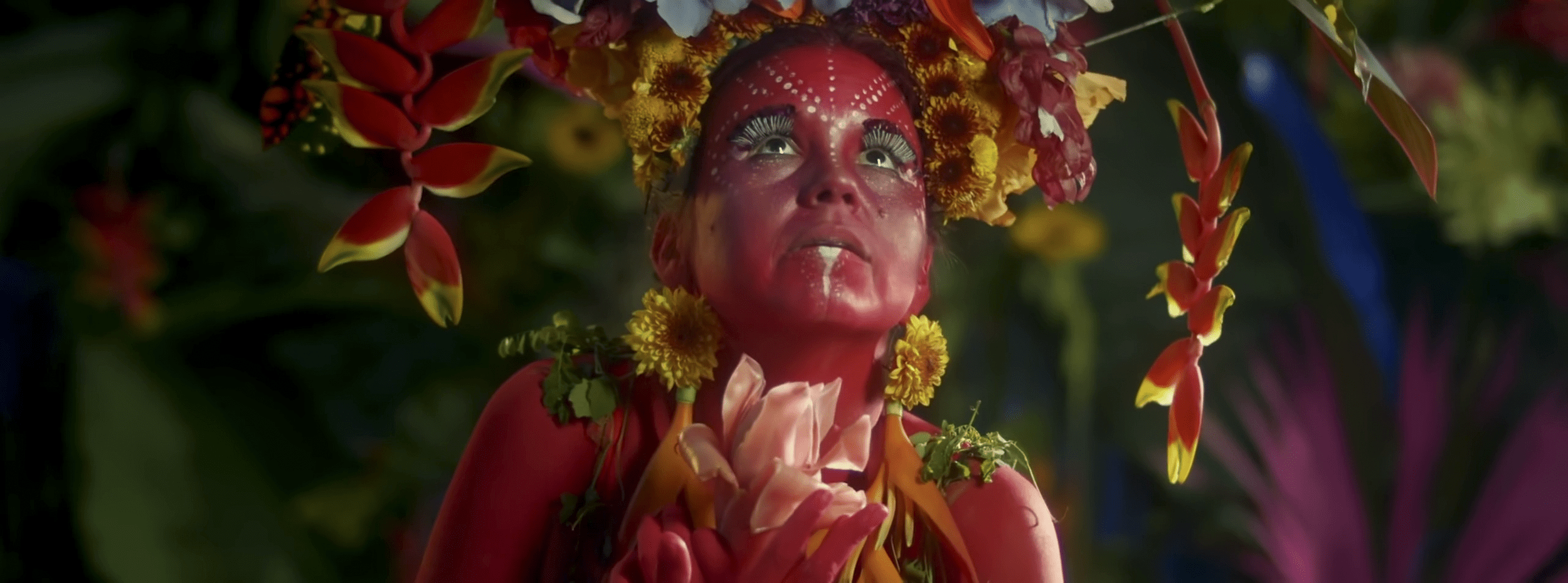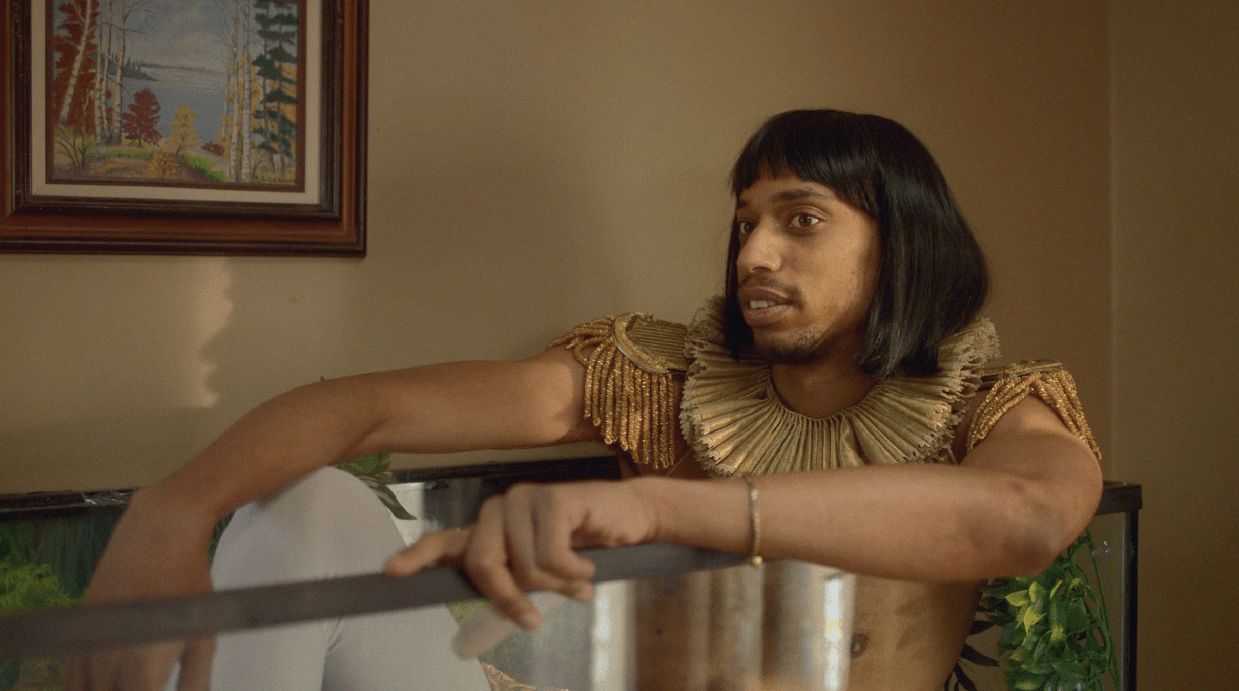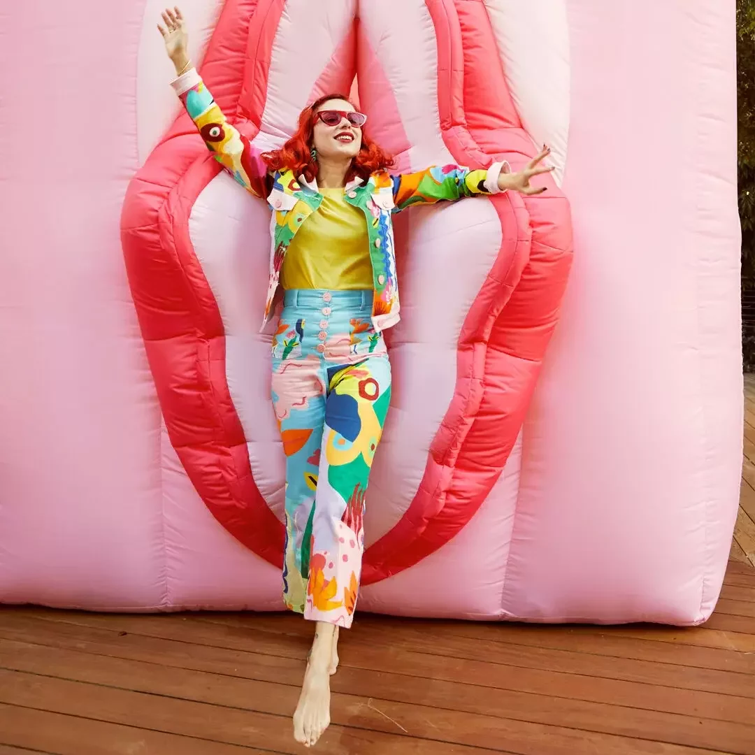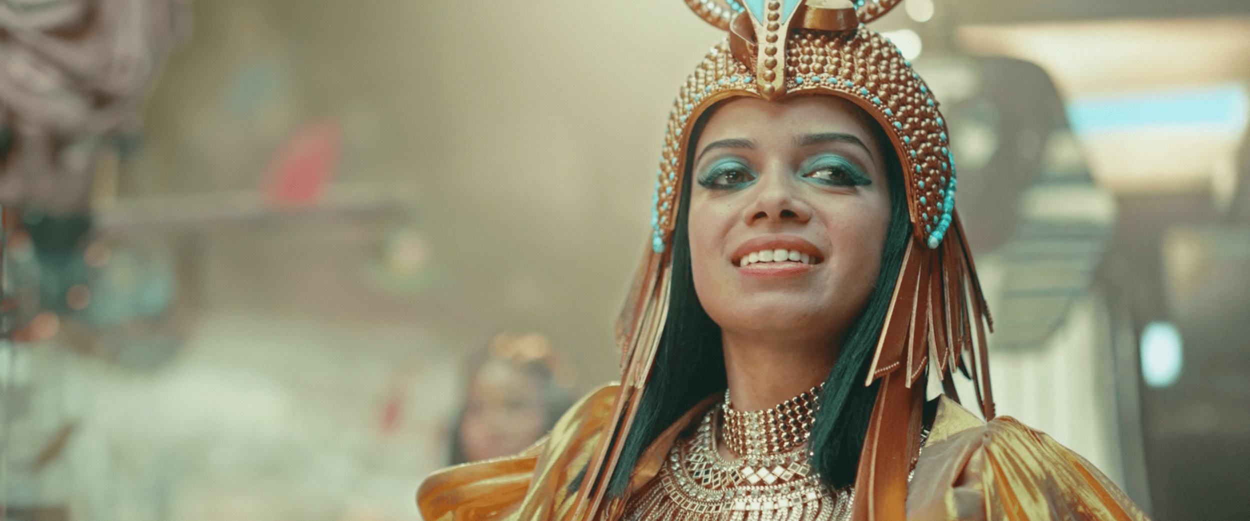 La clave de este tocado es llevarlo al humor, manteniéndolo conectado con la realidad en la que estamos viviendo y con la idea de que es un show de calle. Para lograrlo, sumaría un vestuario que complemente su actitud cotidiana, creando un look más atemporal. Mantendremos la línea de colorido, pero el vestuario debe ser una extensión de su profesión o acción como personaje. Es como si ella hubiera intentado vestirse parcialmente de Cleopatra para el show, pero solo hubiera logrado ponerse el gorro y el maquillaje.