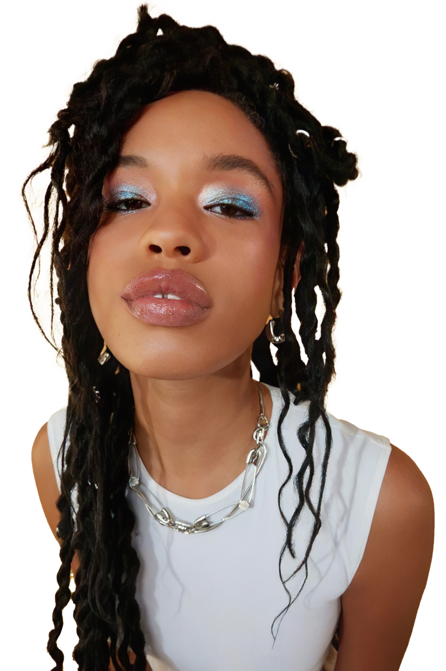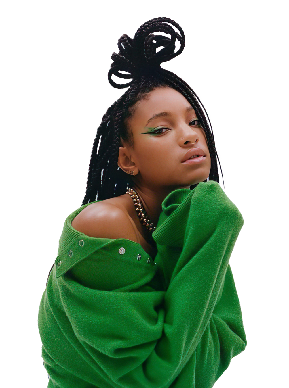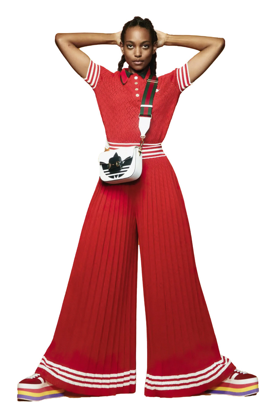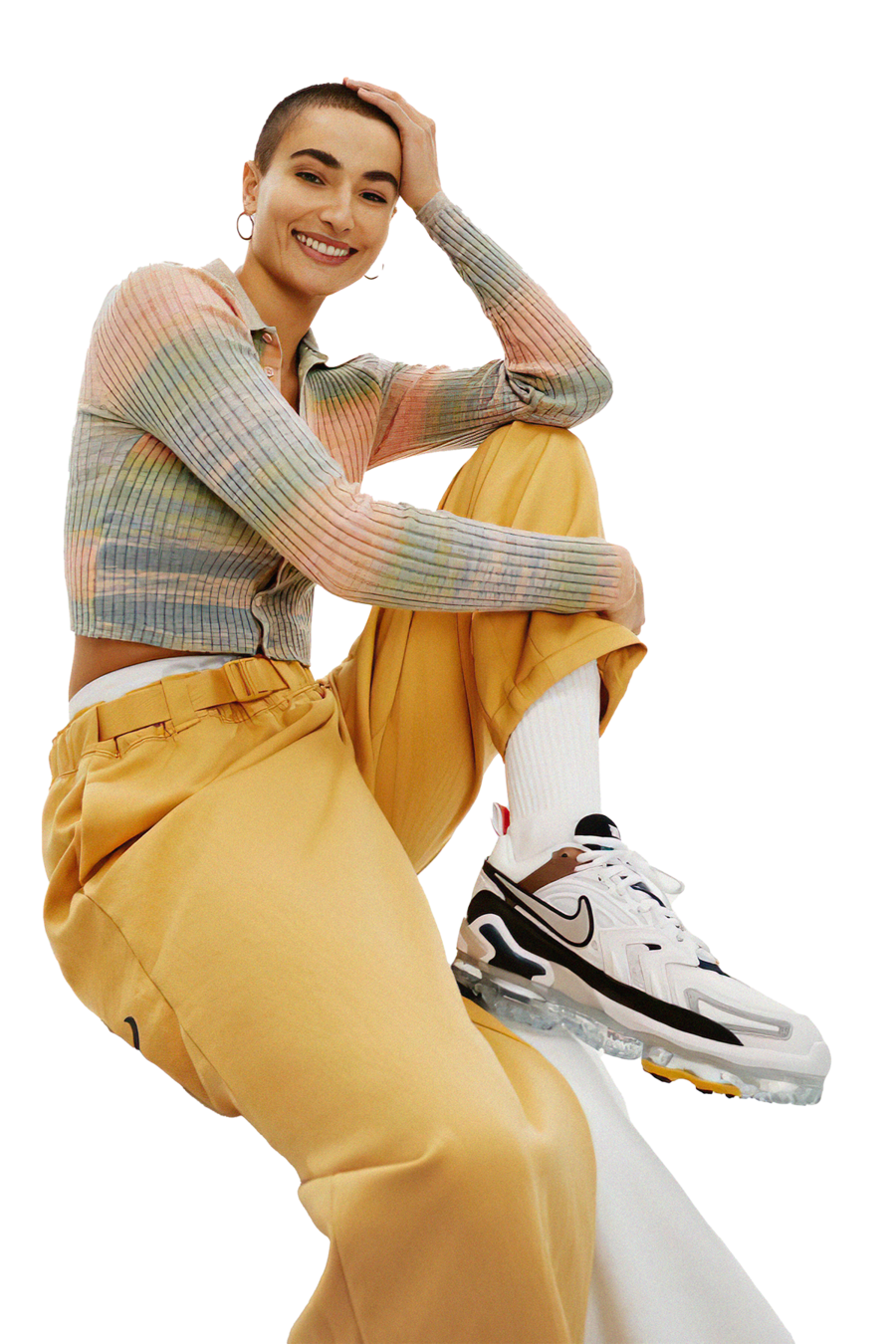La clave de este tocado es llevarlo al humor, manteniéndolo conectado con la realidad en la que estamos viviendo y con la idea de que es un show de calle. Para lograrlo, sumaría un vestuario que complemente su actitud cotidiana, creando un look más atemporal. Mantendremos la línea de colorido, pero el vestuario debe ser una extensión de su profesión o acción como personaje. Es como si ella hubiera intentado vestirse parcialmente de Cleopatra para el show, pero solo hubiera logrado ponerse el gorro y el maquillaje.