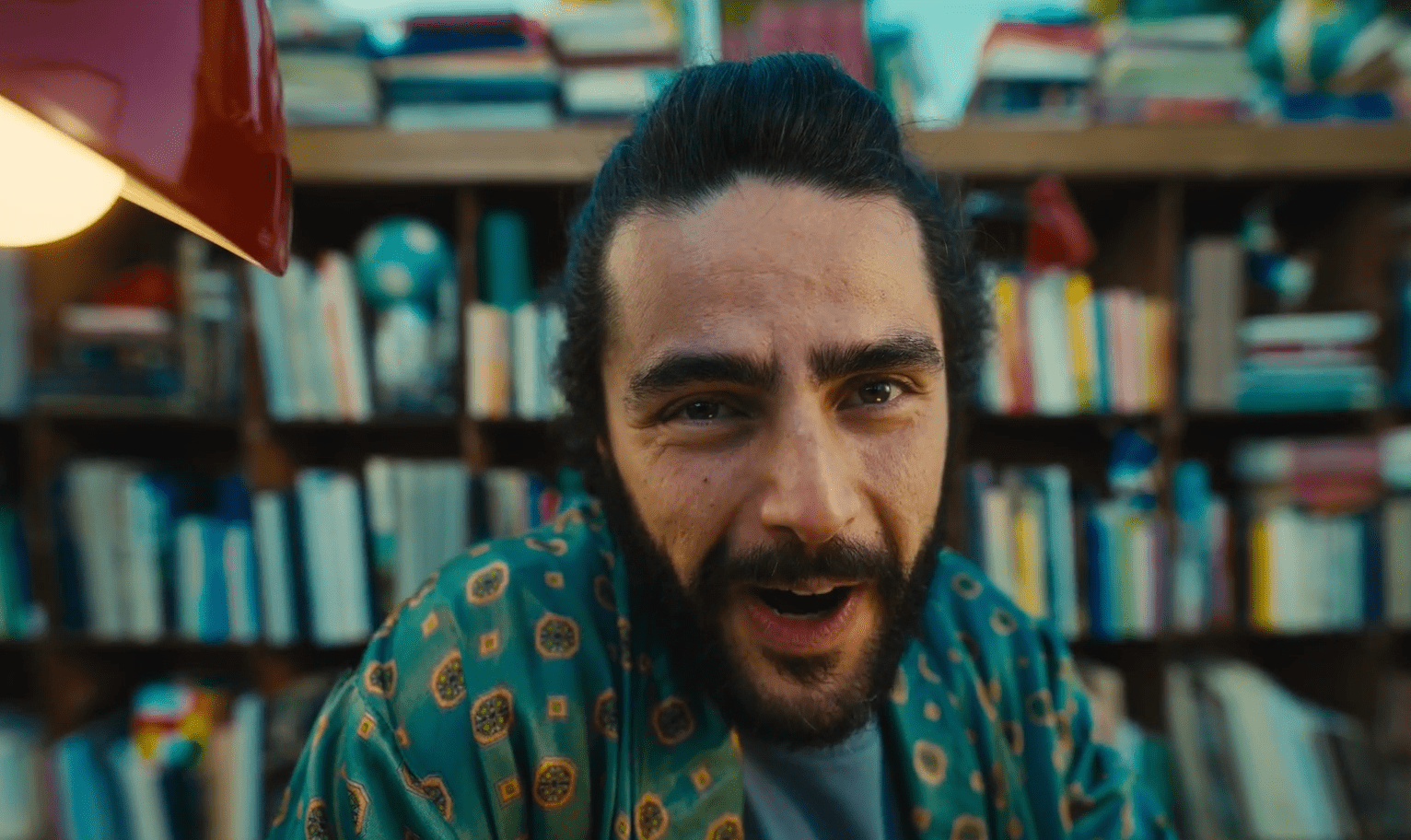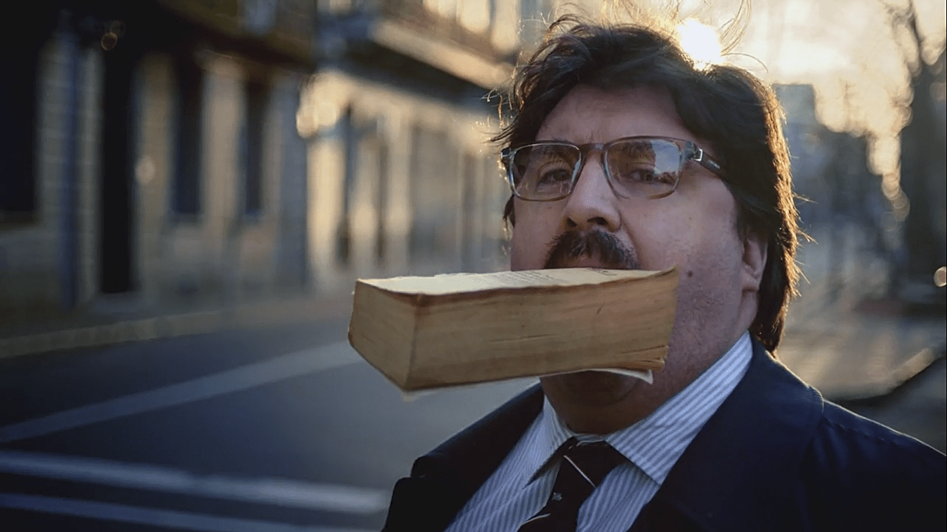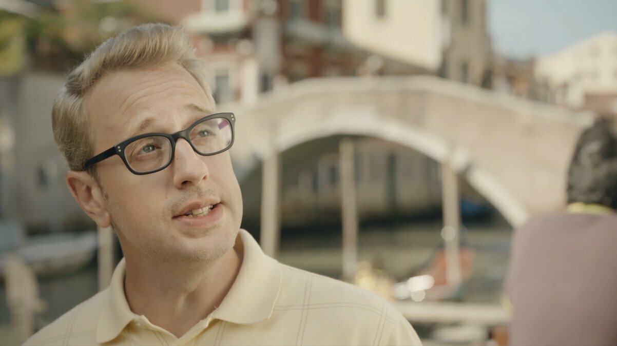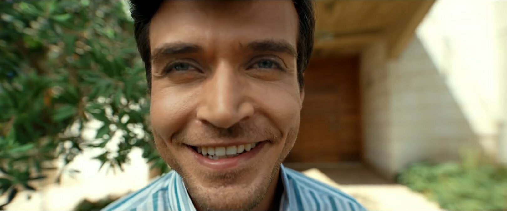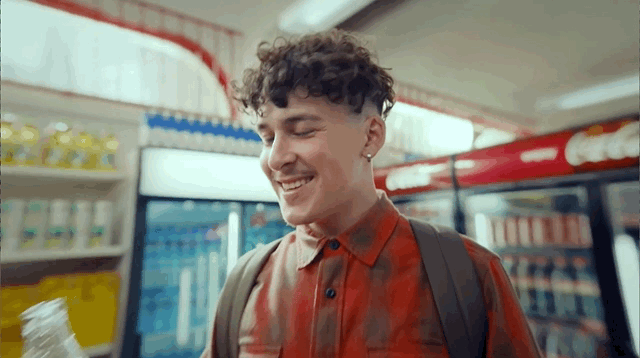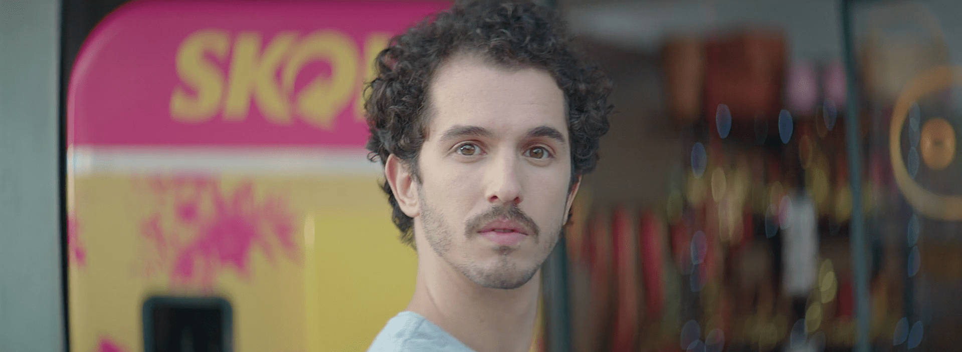 10- La imagen de Raúl pasa de un plano medio de él con su rasca premiado en la mano a de golpe abrirse a ver una visión más general. Con un movimiento exagerado de zoom out, vemos que Raúl está en una plaza cerca del Kiosko de la ONCE. Se está sacando un selfie sonriendo muchísimo. Justo el que acabamos de ver hace unos segundos.