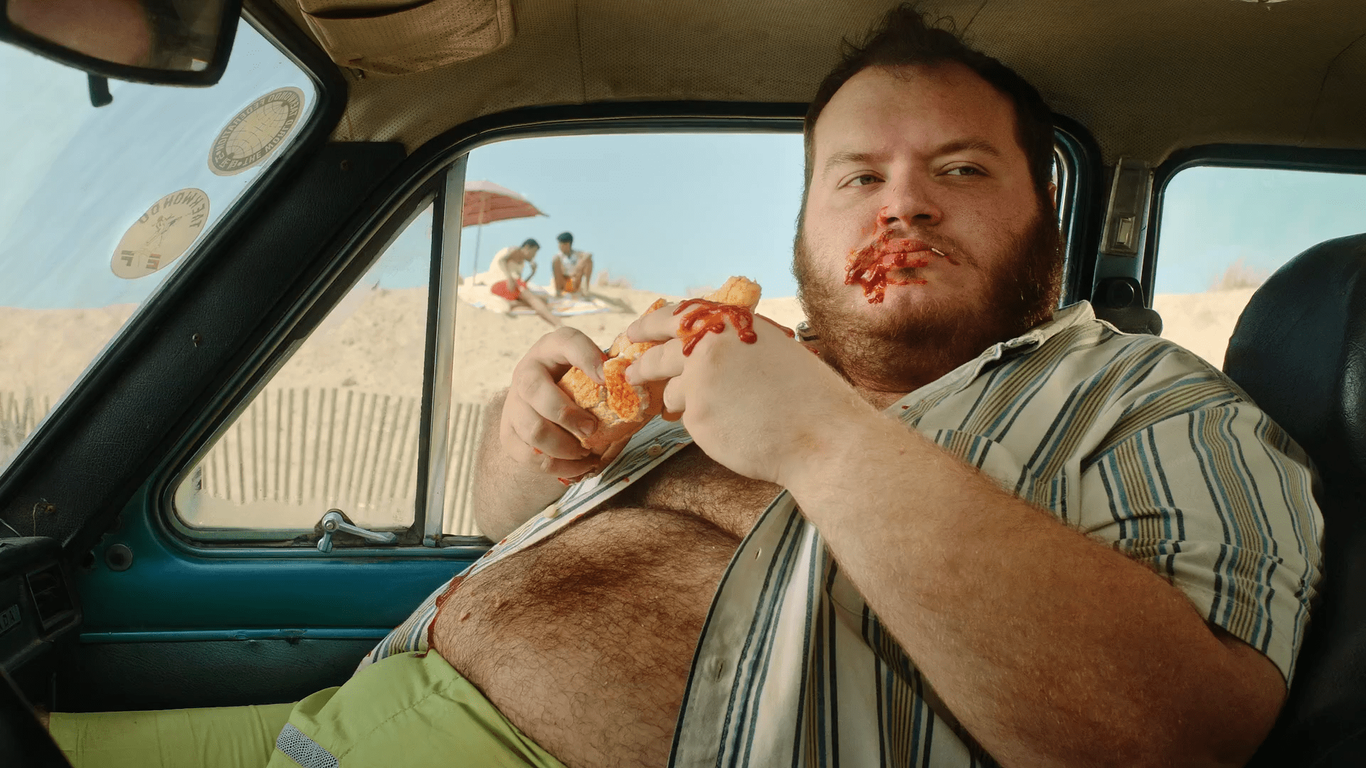 8- Una serie de fotos aparece en un montaje más picado, una casi sobre la otra. Retratan esos rostros mega ILUSIONADOS junto a sus rascas ganadores. Son el resto de personajes de la película. Los tenemos muy de cerca, casi como si fuera una presentación de cada uno de sus rascas, pero siempre junto a ellos, iluminados con flash como si hubieran tenido una noche larga de celebraciones.