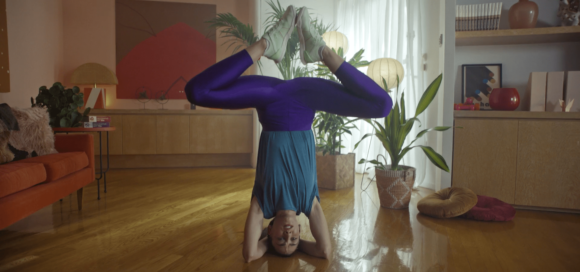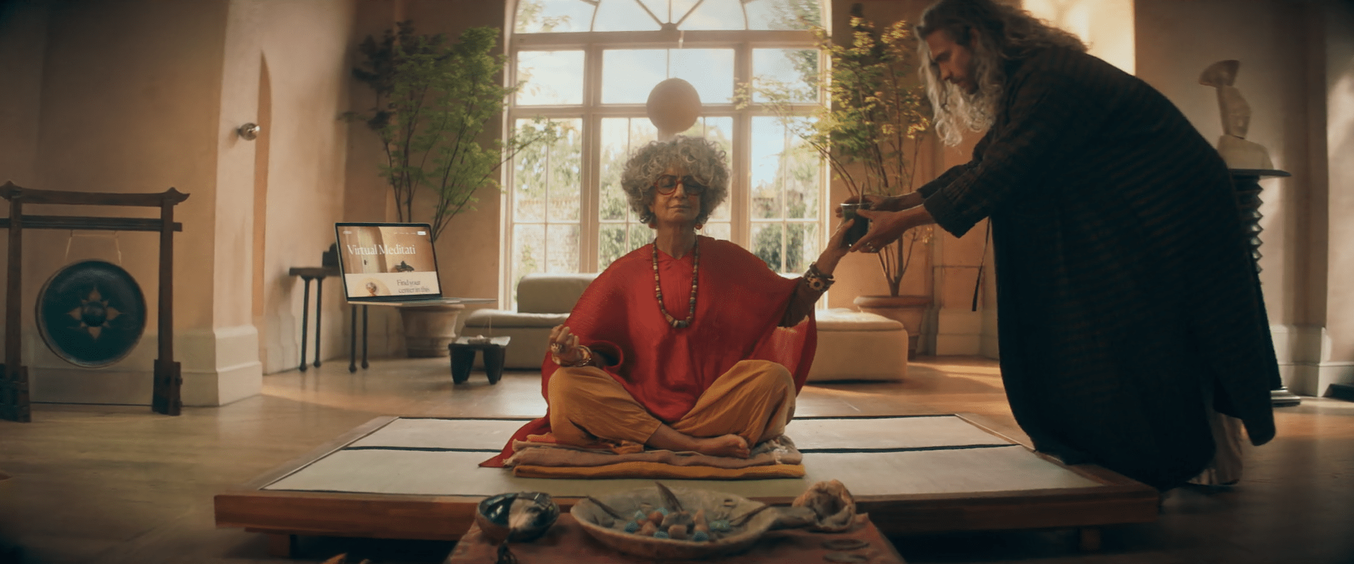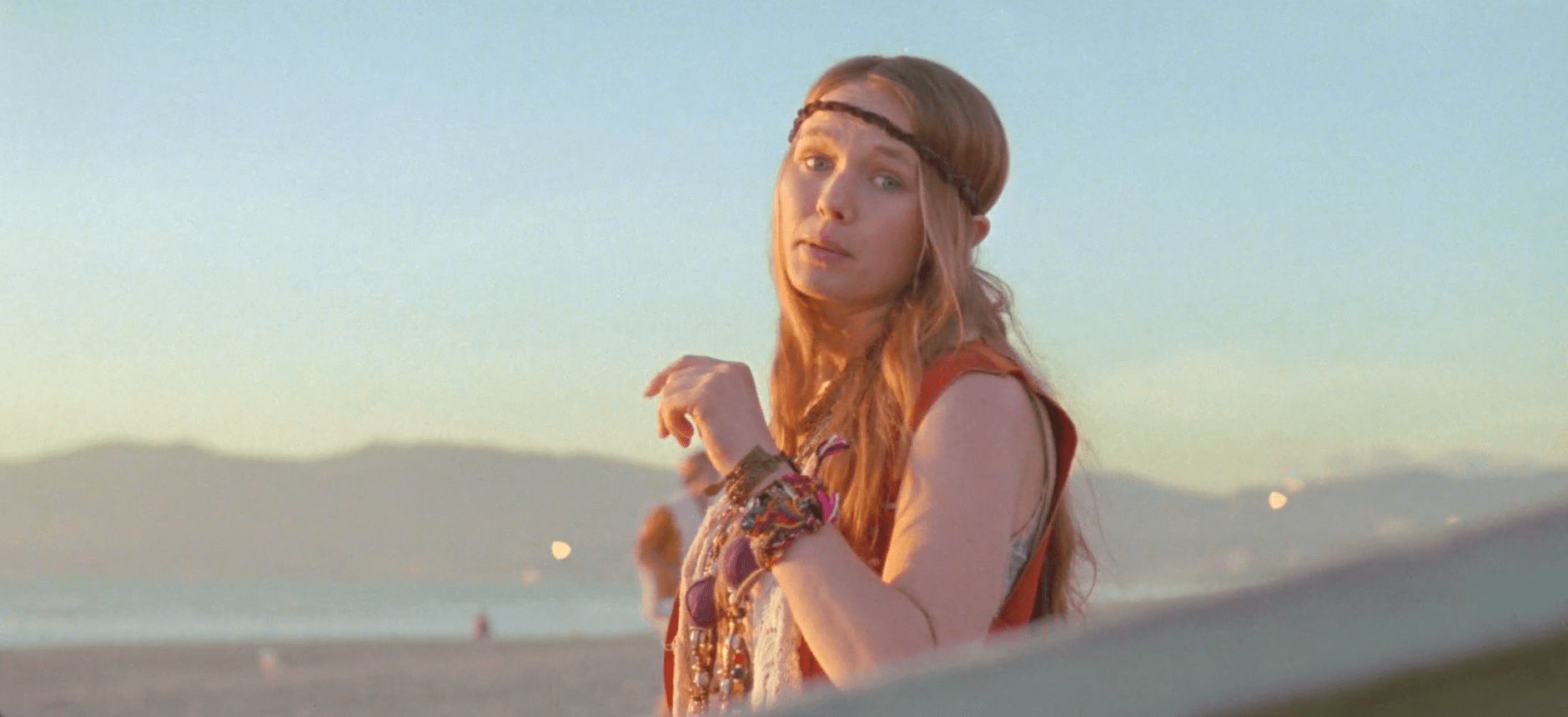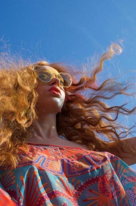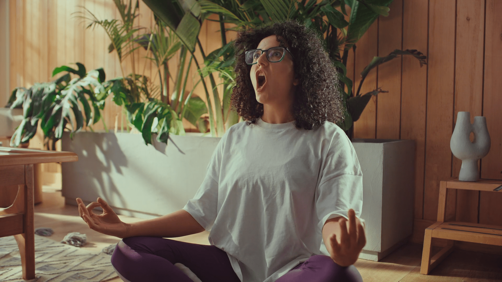 5-De golpe, en un plano medio rodeamos a la hippie de los 70. De forma contrapicada, la vemos empoderarse. Está agustisimo meditando sobre el Rasca Flower power. Que lo tiene sobre su cabeza.