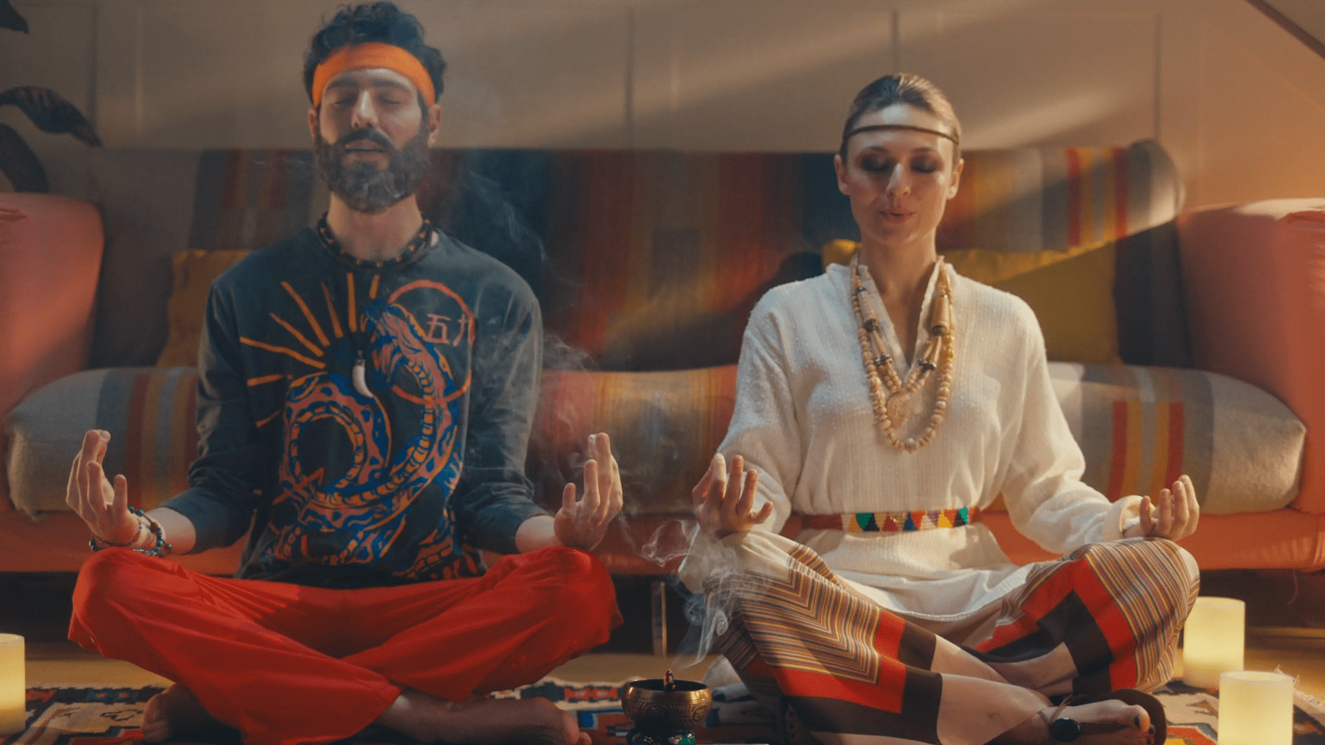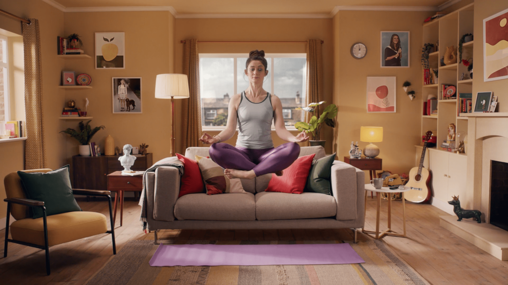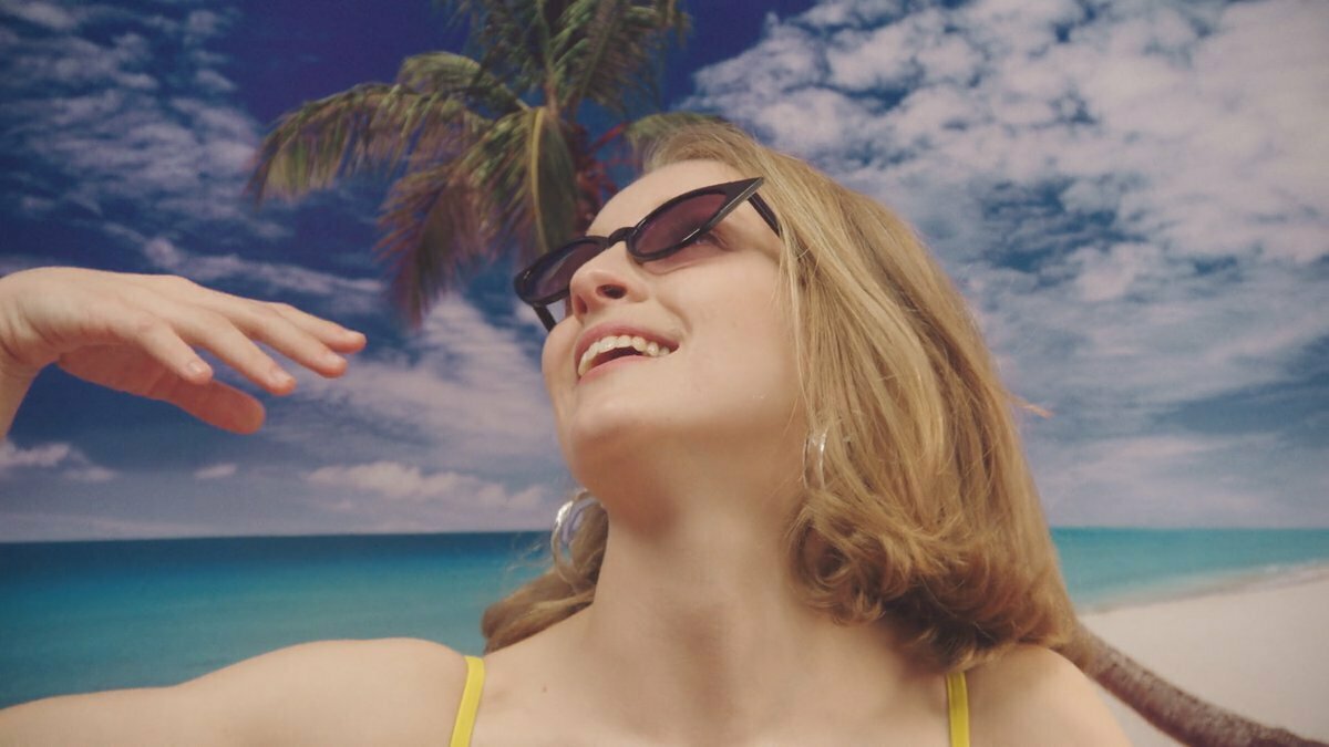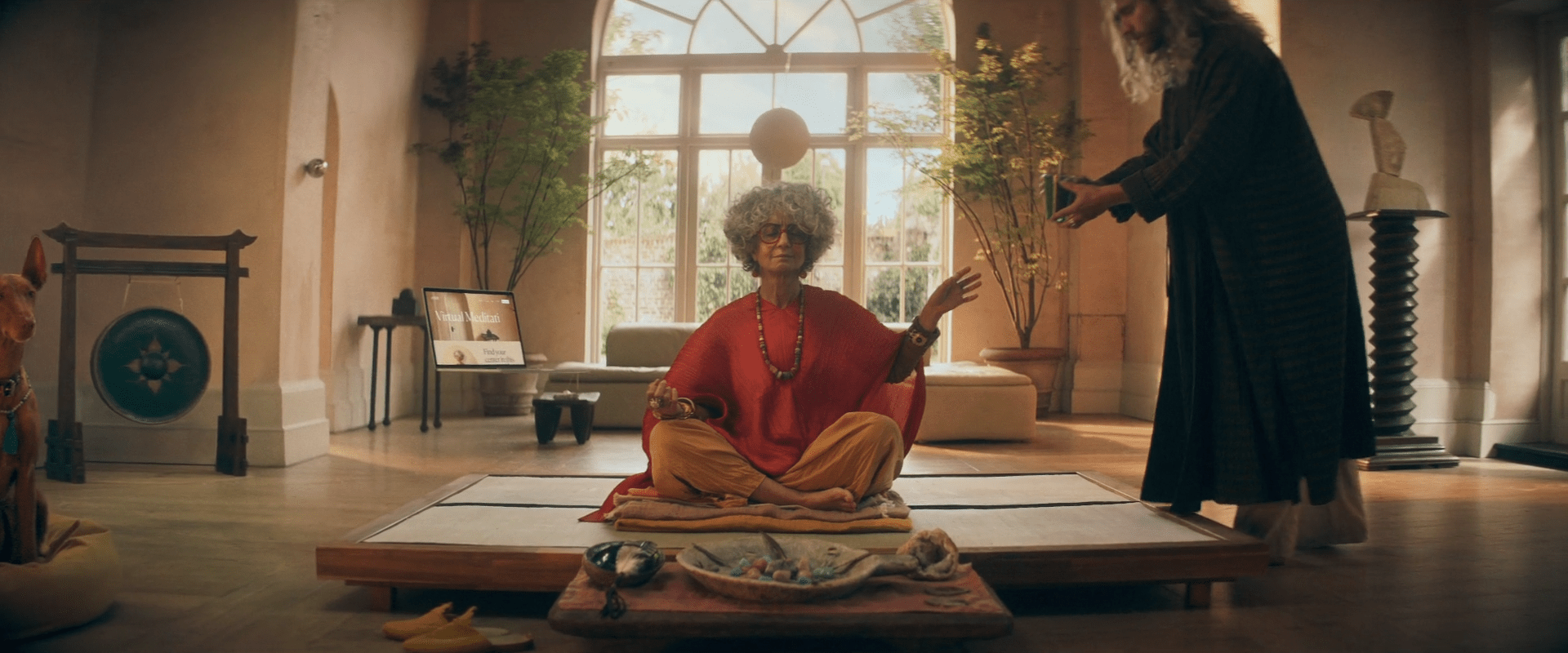 5-De golpe, en un plano medio rodeamos a la hippie de los 70. De forma contrapicada, la vemos empoderarse. Está agustisimo meditando sobre el Rasca Flower power. Que lo tiene sobre su cabeza.