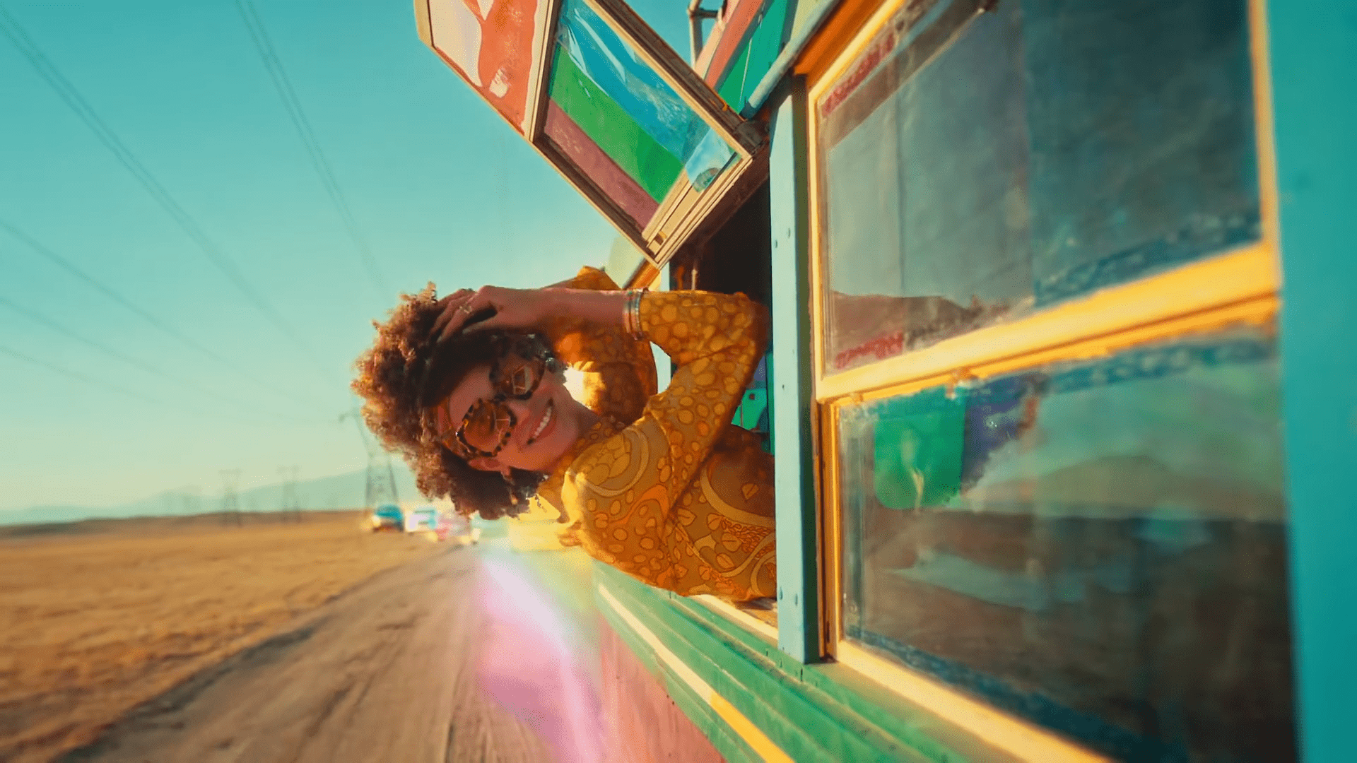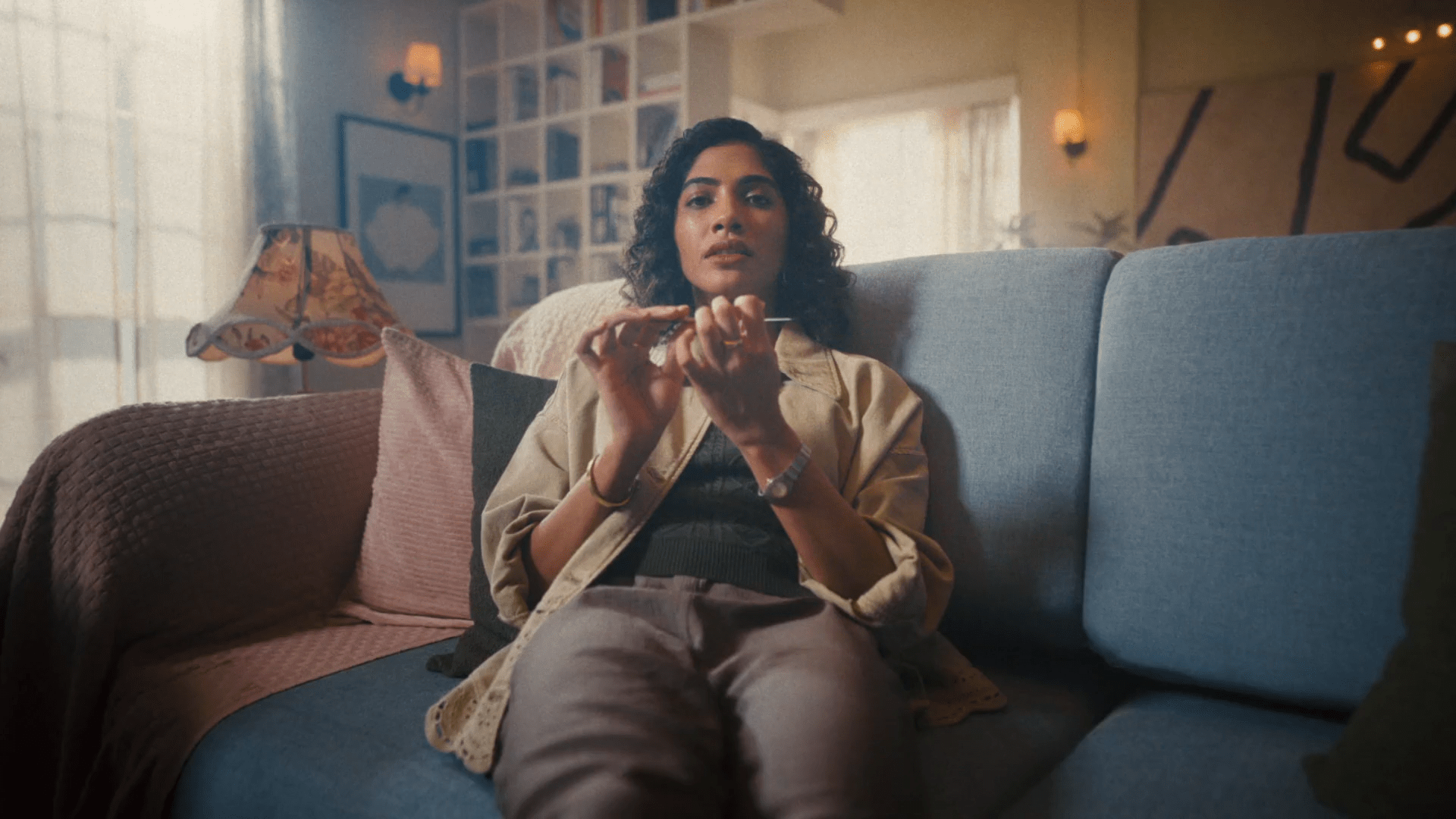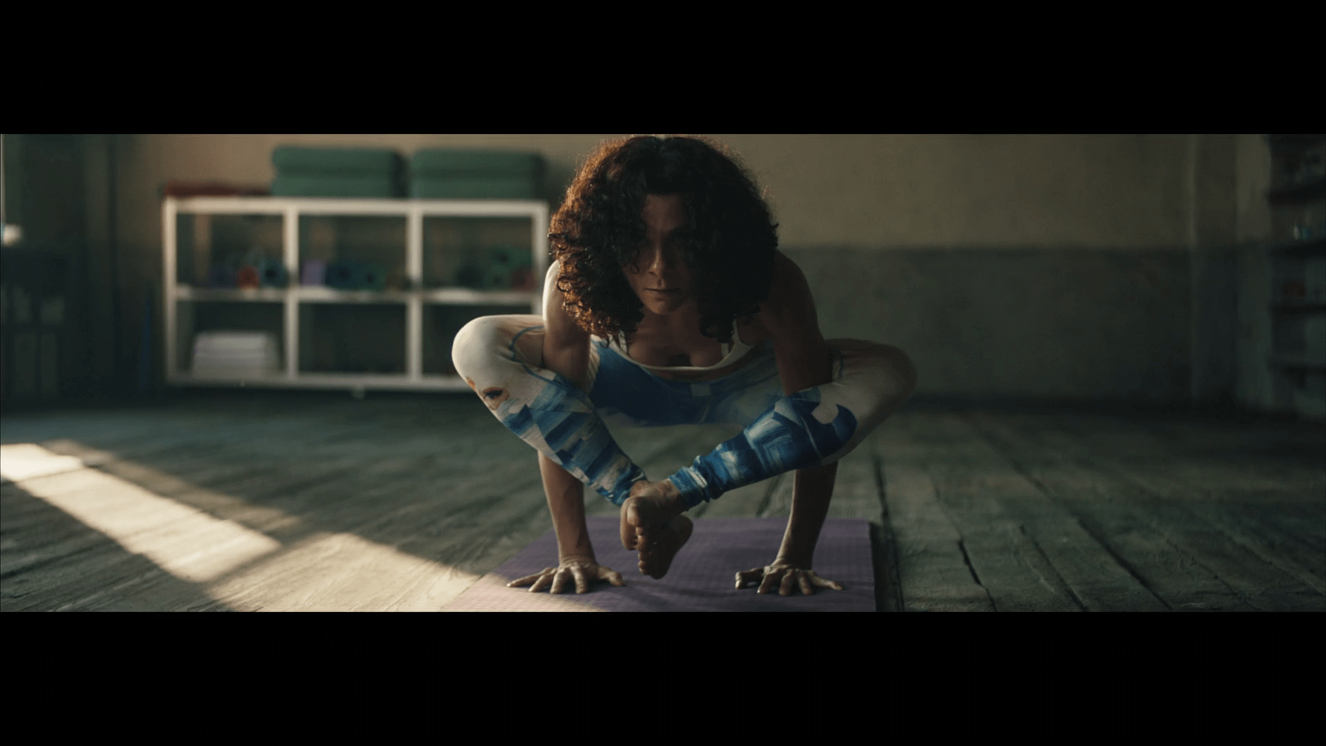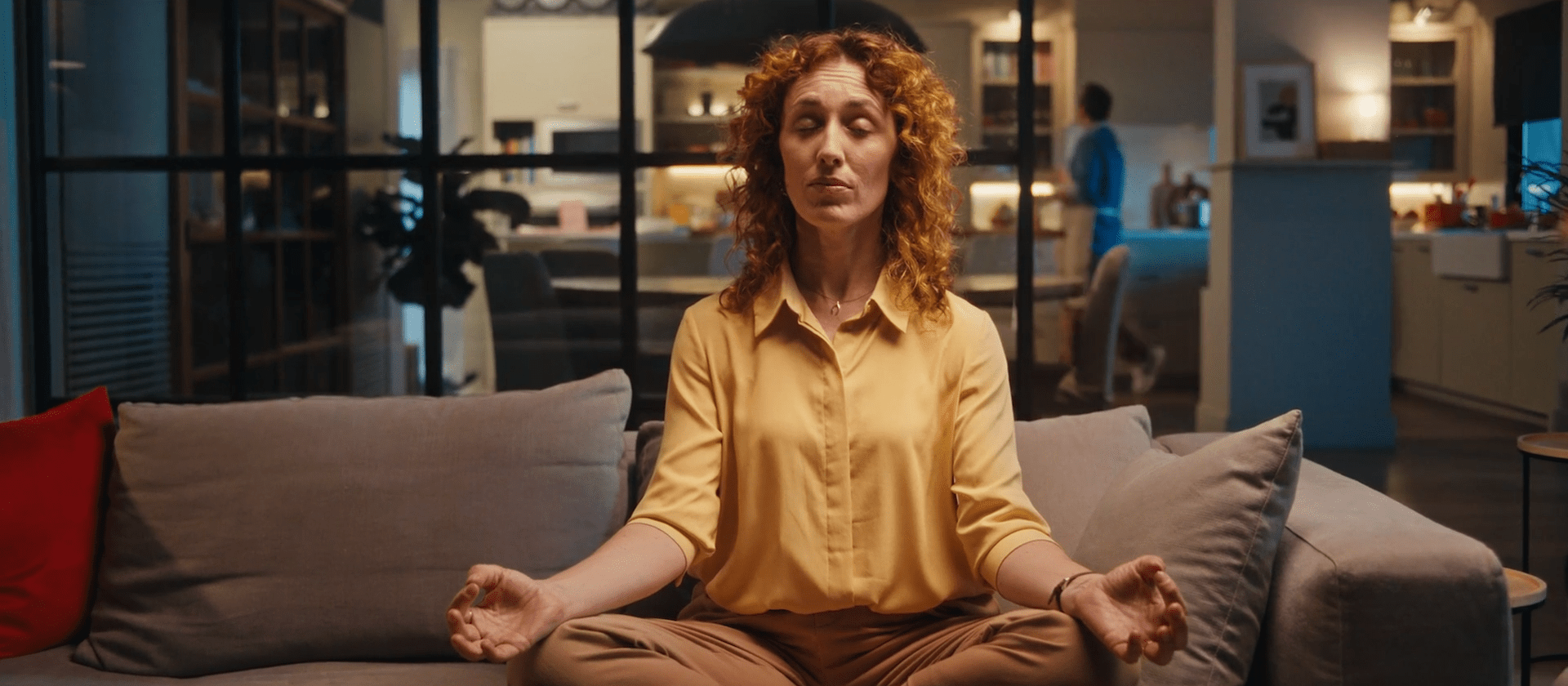 5-De golpe, en un plano medio rodeamos a la hippie de los 70. De forma contrapicada, la vemos empoderarse. Está agustisimo meditando sobre el Rasca Flower power. Que lo tiene sobre su cabeza.