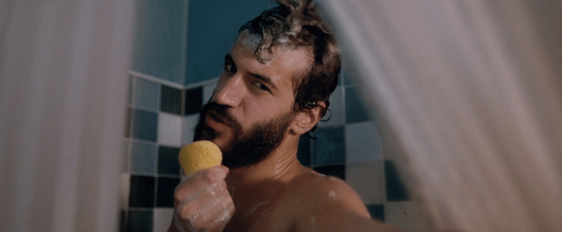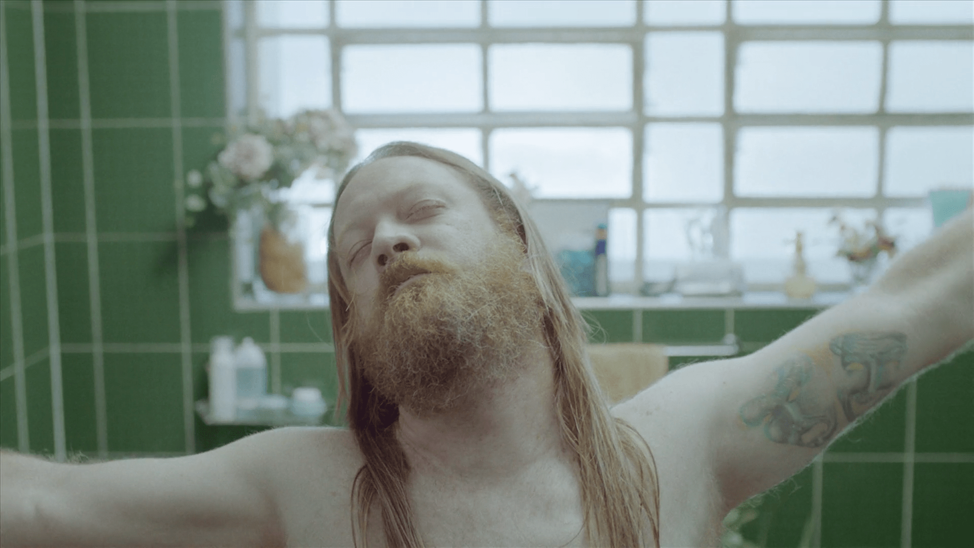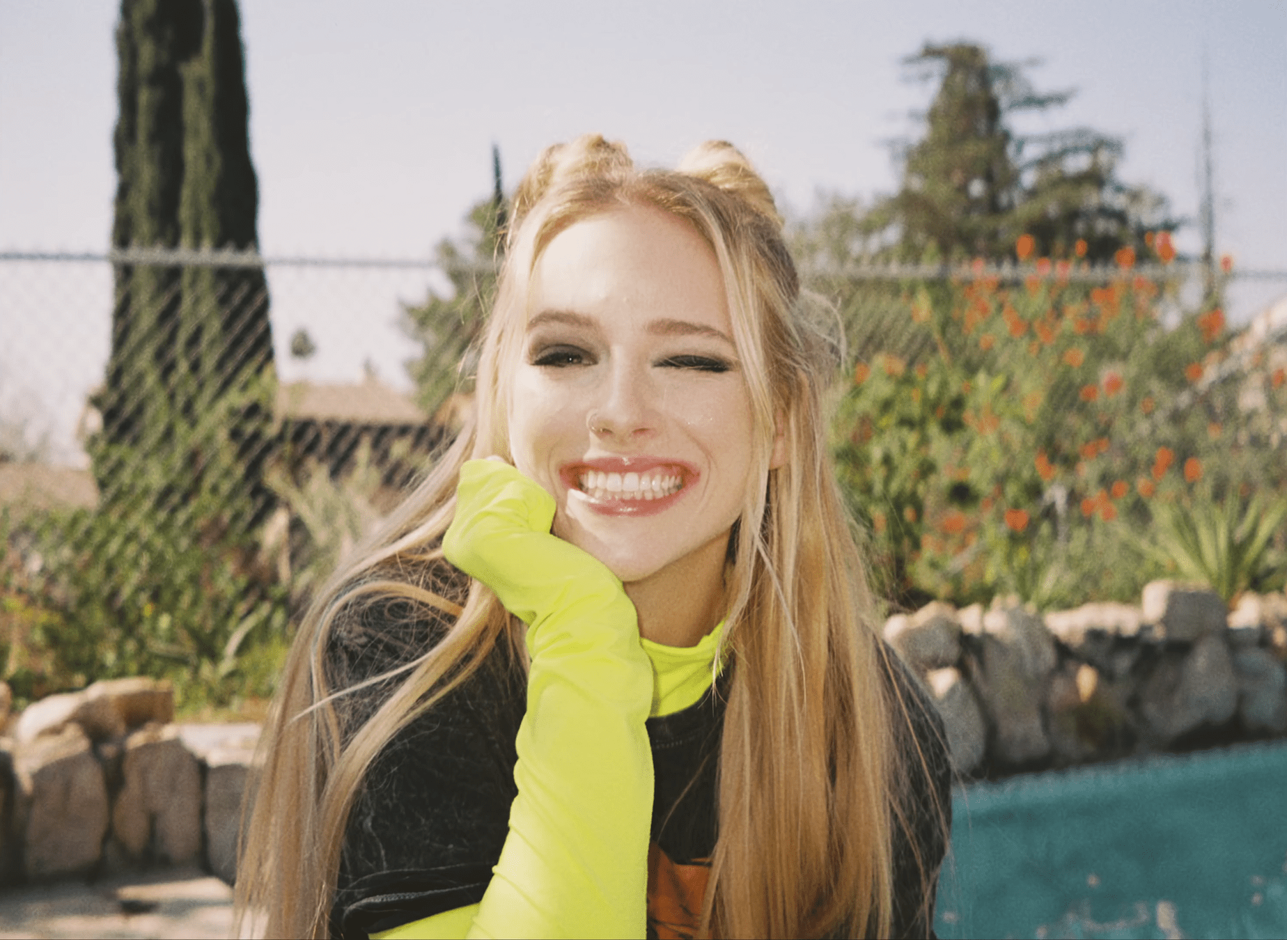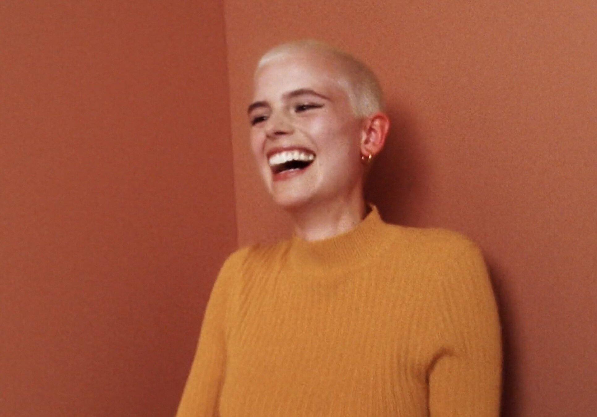 5-De golpe, en un plano medio rodeamos a la hippie de los 70. De forma contrapicada, la vemos empoderarse. Está agustisimo meditando sobre el Rasca Flower power. Que lo tiene sobre su cabeza.