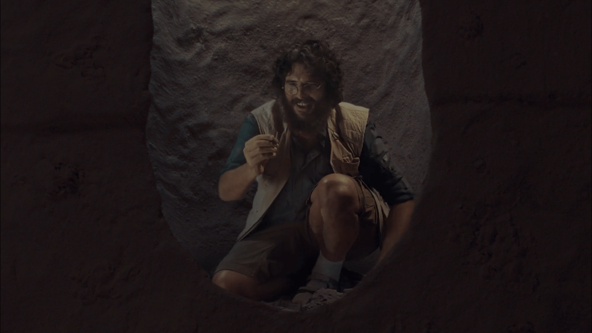 4- Desde arriba, en un plano picado y un zoom out, vemos cómo se le va de las manos y salta a la excavación, bailando sobre un esqueleto de dinosaurio. El dinosaurio tiene una postura de celebración, con los brazos bien arriba (mirar dinosaurio)*. Con leves movimientos, parecerá que el esqueleto esté bailando con él.