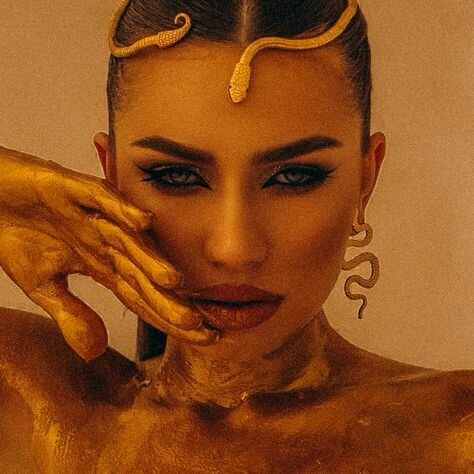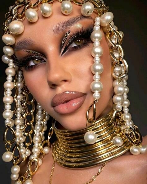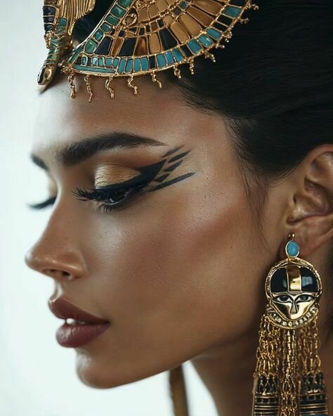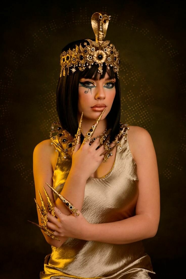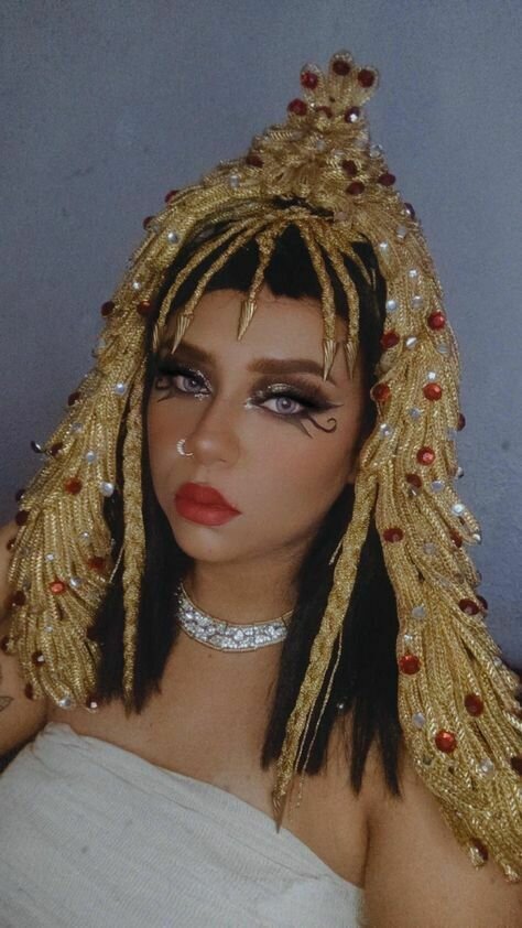 El estilo de la gran Cleopatra debe enfocarse especialmente en el diseño de su peinado, el casco y la diadema o corona, elementos que evocan los grandes momentos históricos que se asocian con ella. Debe ser algo absolutamente icónico. Sin embargo, necesitamos hacerlo original y propio, ya que, por derechos, no podemos imitar los tocados de la película original ni de otras películas clásicas. A pesar de eso, podemos tomar como referencia esa estética.
