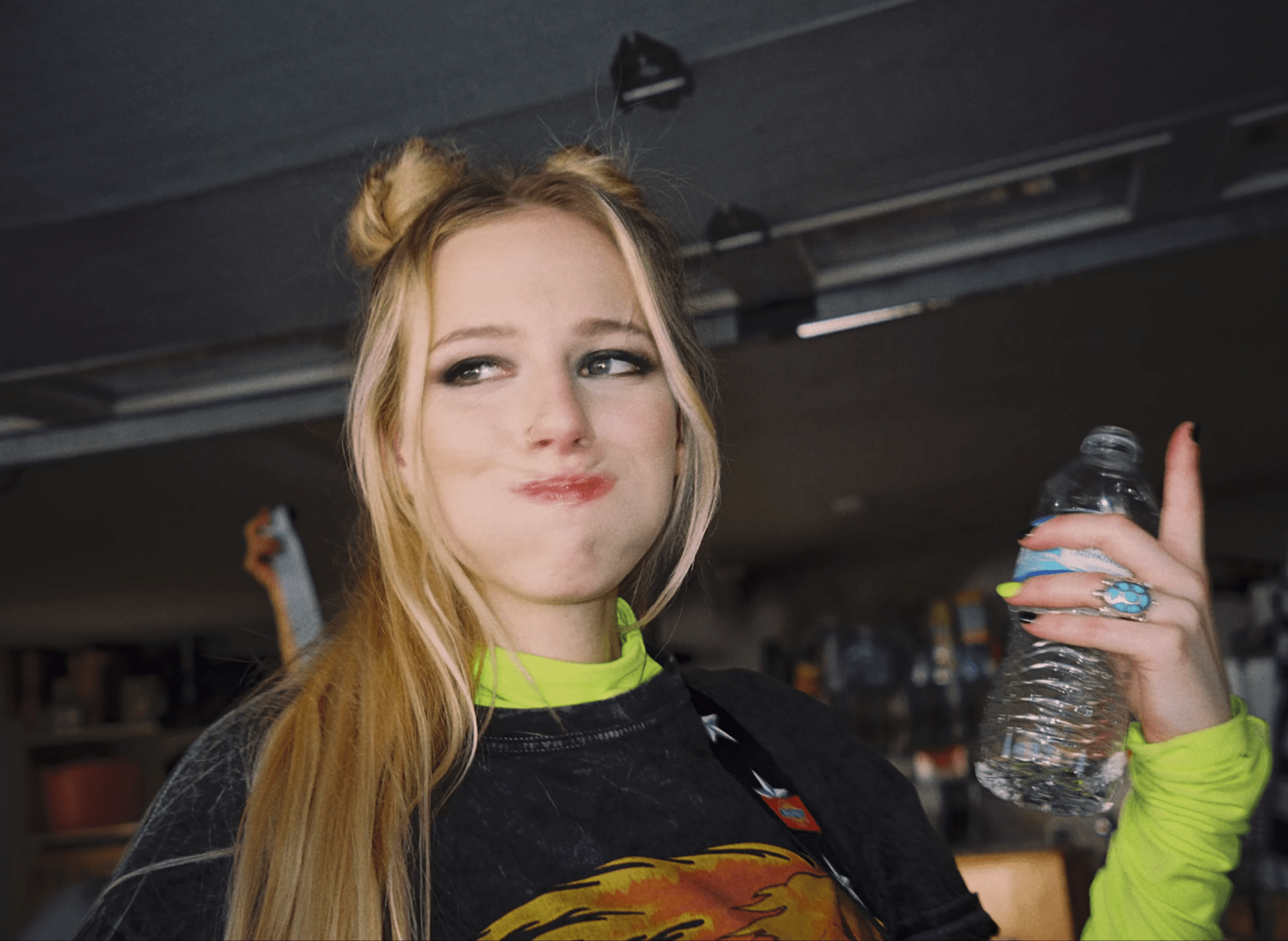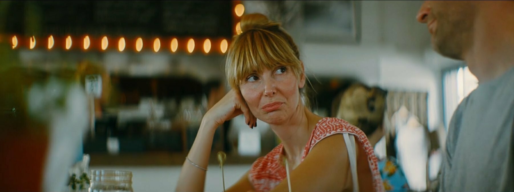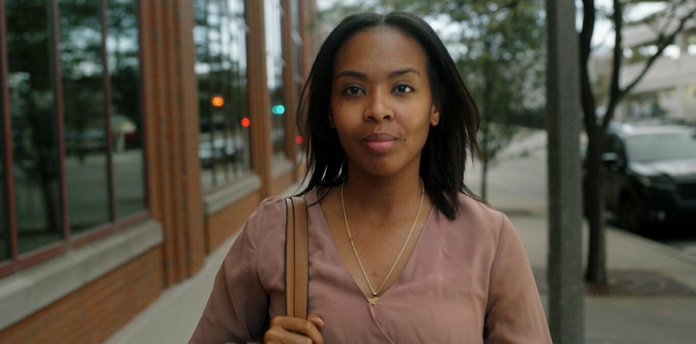 8- Nos cerramos en un momento íntimo entre ella y la bola de bolos. Le da un beso y comienza a dar vueltas como si estuvieran sobre un giratorio, pero ¡nada de efectos! Son ellas dos juntas, girando como en un paso de baile, como si estuvieran en un momento musical. La cámara también las rodea en un circular, acercándose cada vez más, hasta que la espalda de María nos ayuda a generar un corte que nos traslada a la espalda de un personaje nuevo.