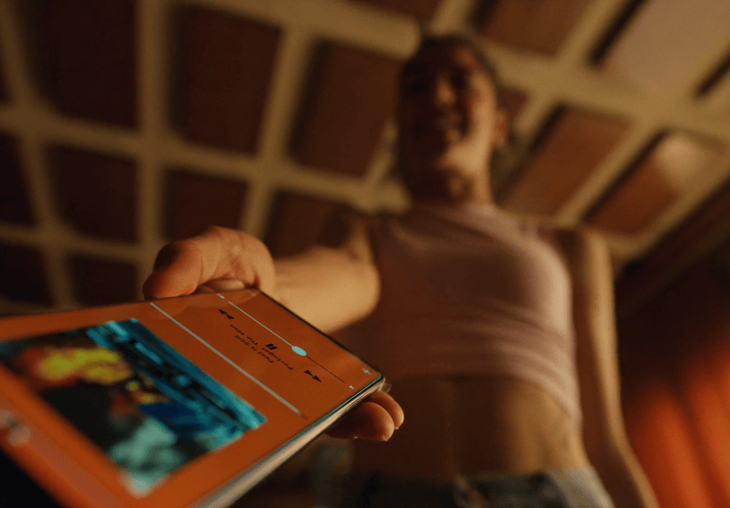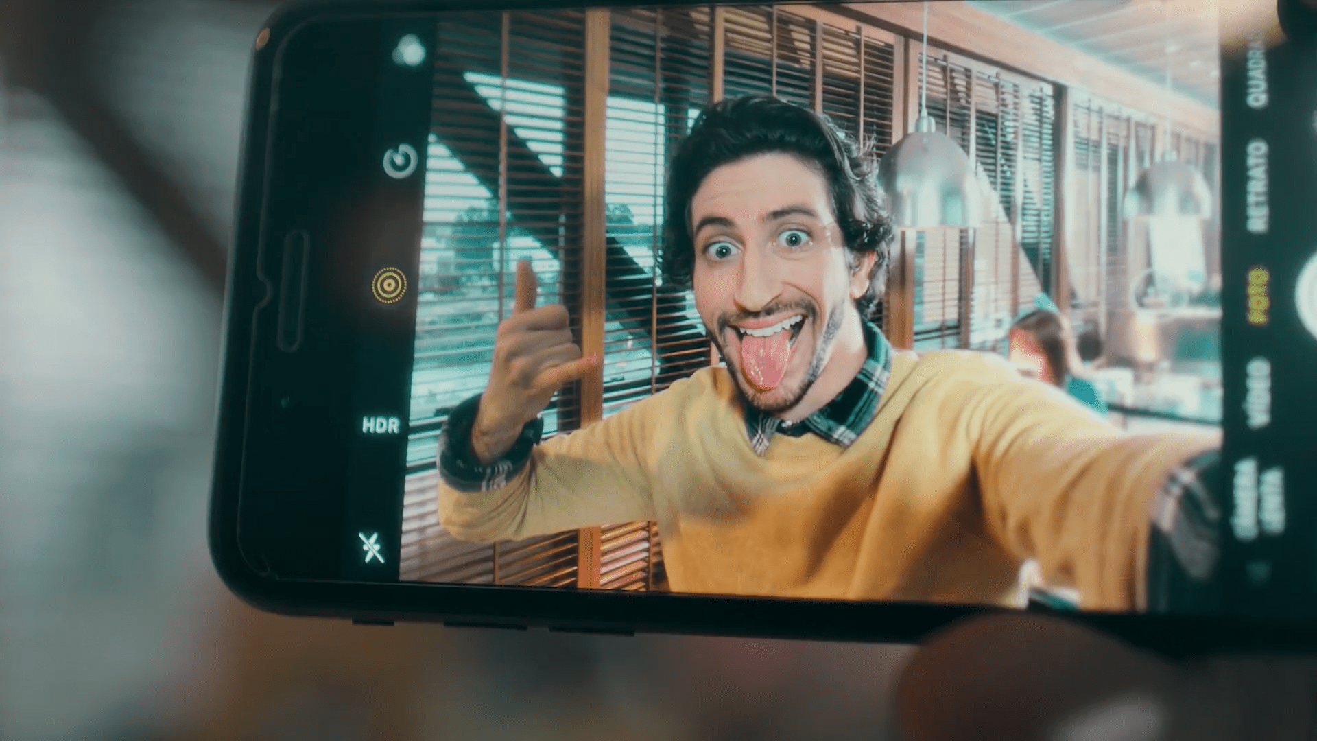La última es la de Raúl, con su boleto ganador. Esa imagen se acaba agrandando hasta ocupar el frame y convertirse en una imagen que tiene vida. Salimos de un detalle de un móvil, parece que vemos ese mismo selfie en directo. Click. La cámara se aleja en un plano más abierto, es raúl haciéndose una foto.