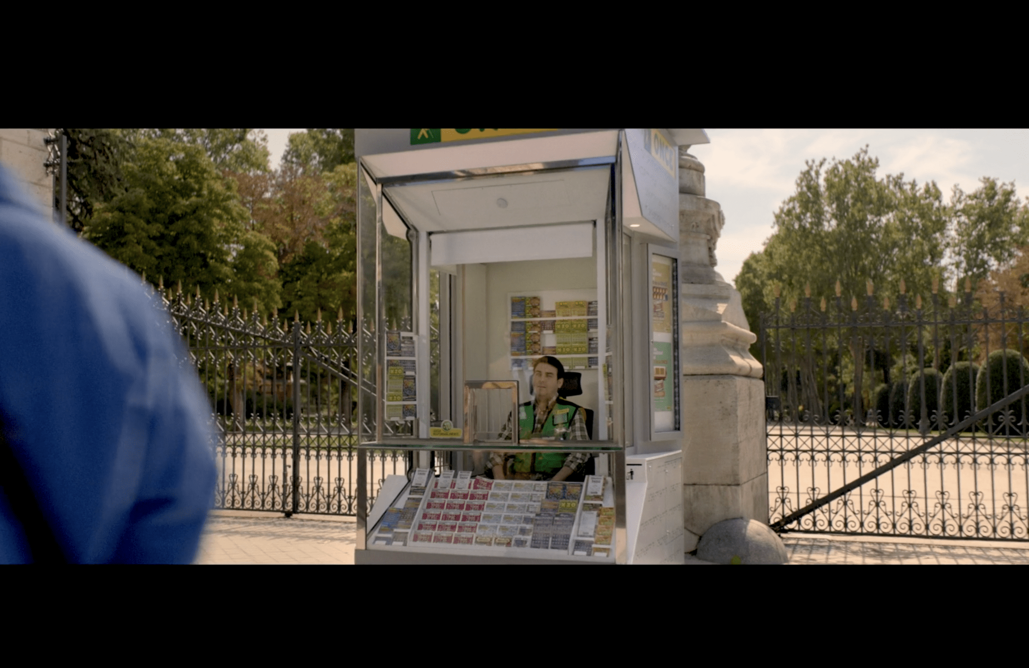 9 - Ahora vemos a Raúl atraves del cristal del Kiosko, acaba de coger su boleto y lo rasca ante nosotros. La cámara primero muestra el boleto y después nos encuadra a Raúl.