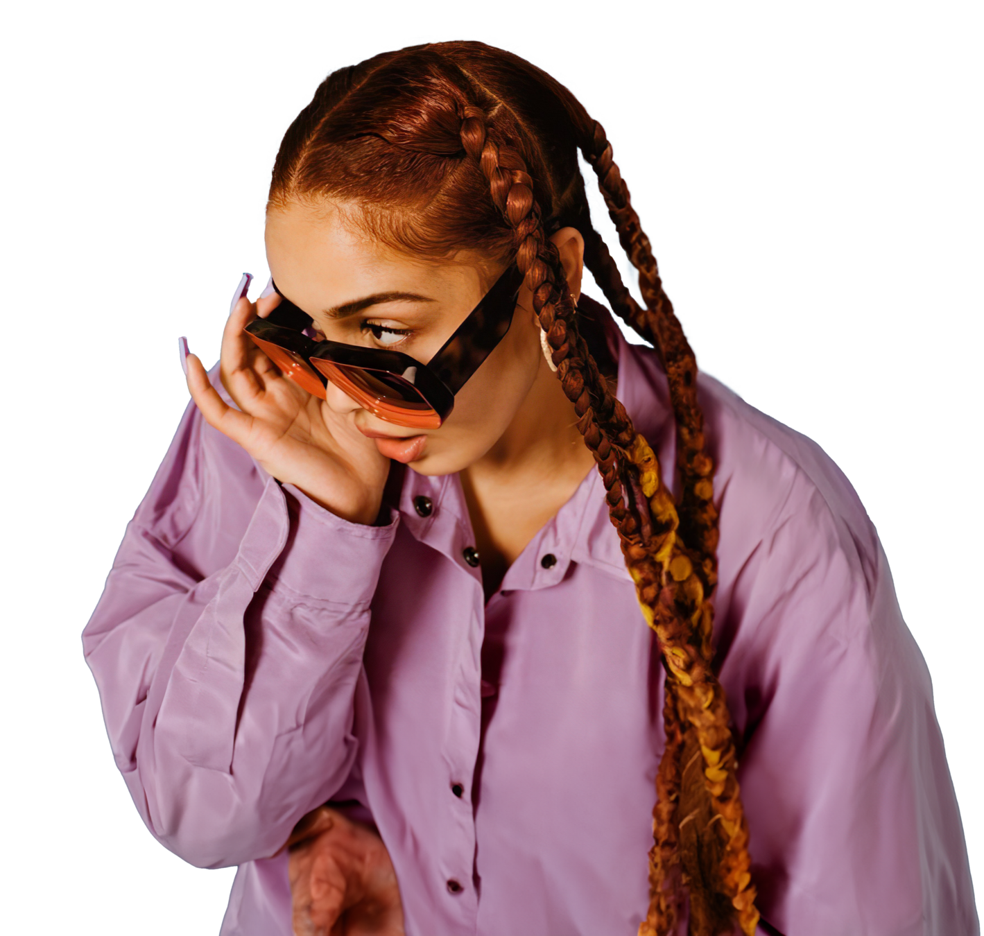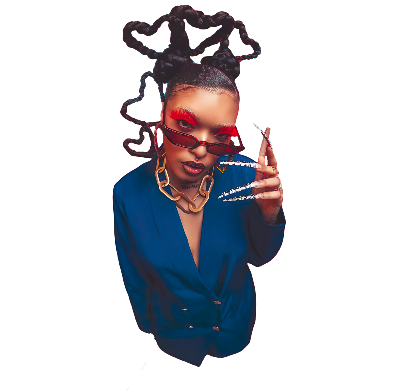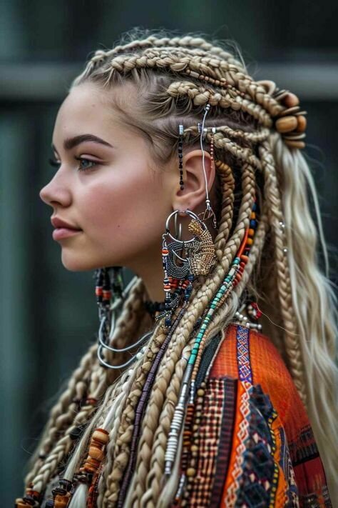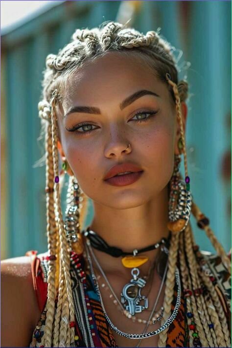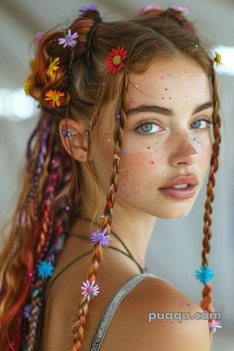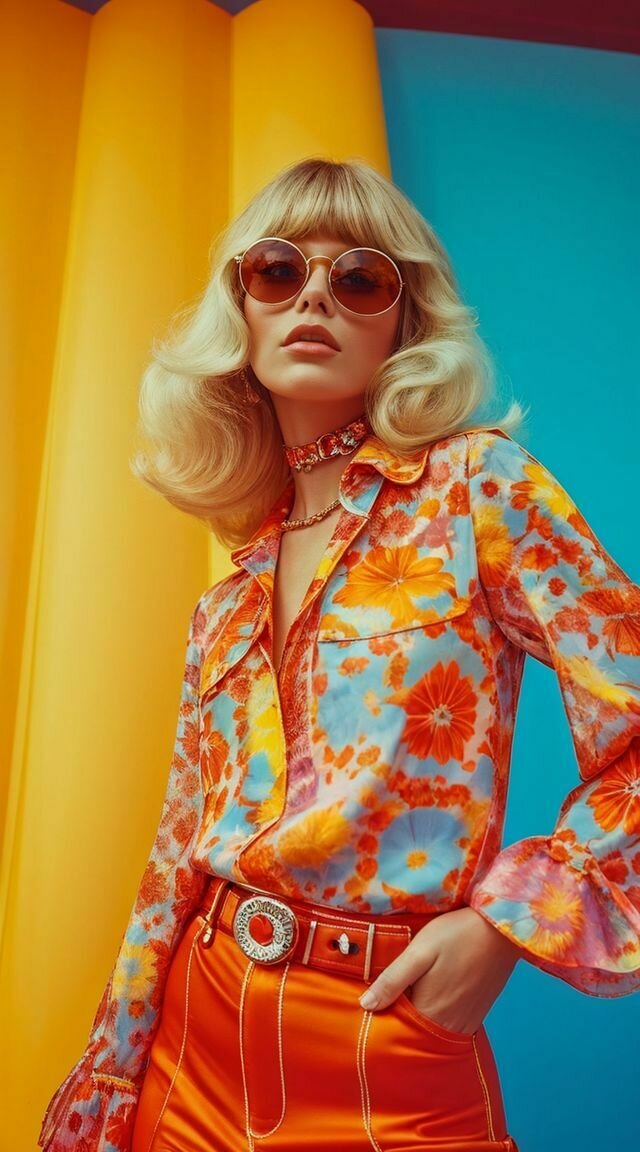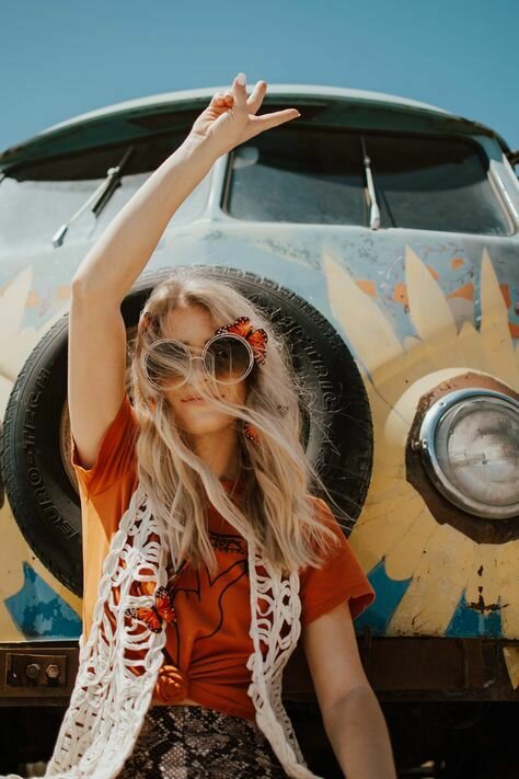 En cuanto a la hippie, optaría por una versión un poco más moderna y contemporánea. Le daría el toque característico de los 70, utilizando los mismos colores que estamos aplicando a los otros personajes, pero con un giro. Para ella, jugaría con la idea de tener la cabeza llena de trenzas, algo que, aunque parece de otra época, sigue siendo muy actual y se lleva hoy en día. Las trenzas estarían adornadas con pequeñas florecitas, y también incluiría unas gafas de sol, para darle ese aire más moderno. De esta forma, mantendremos la esencia de la hippie, pero con un toque actual y fresco.