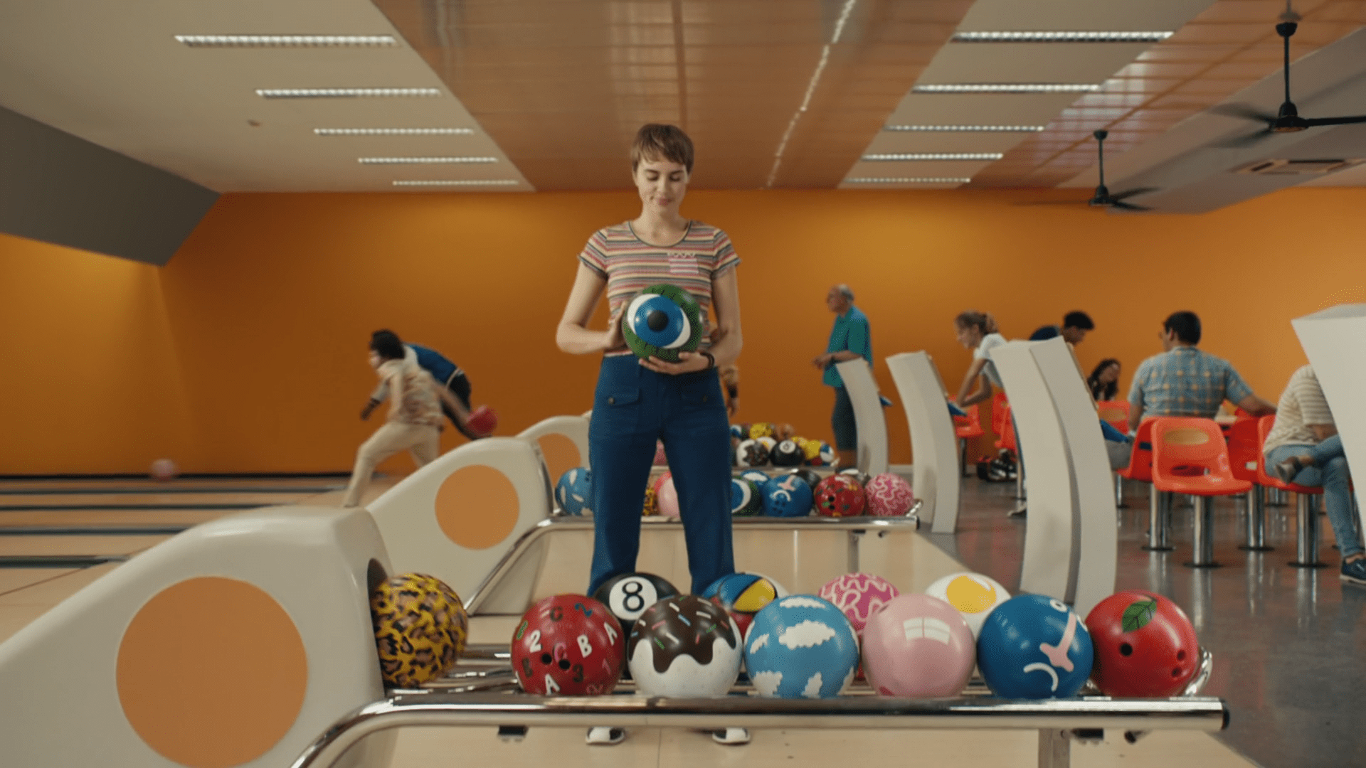 Pero para diferenciarla, podemos darle un toque distintivo y actual con luces de colores en los fondos, jugando con estos elementos especialmente en la bolera o en la competición de ajedrez. En este último caso, la iluminación puede sugerir una sala de gamers, usando toques de color que puedan relacionarse con la actualidad de una manera sutil pero efectiva.