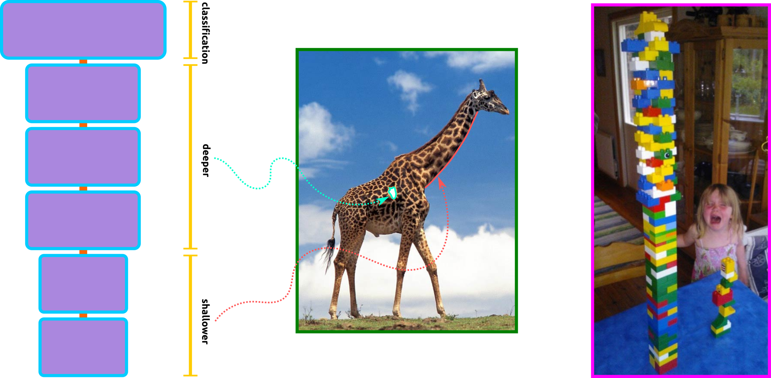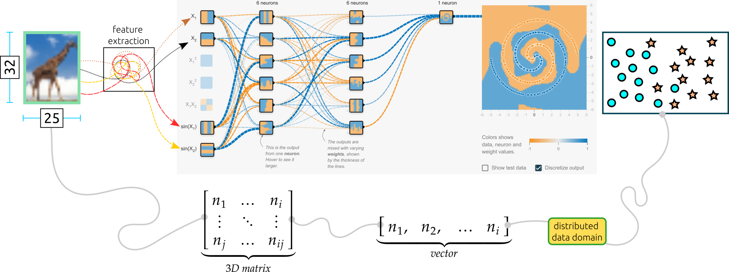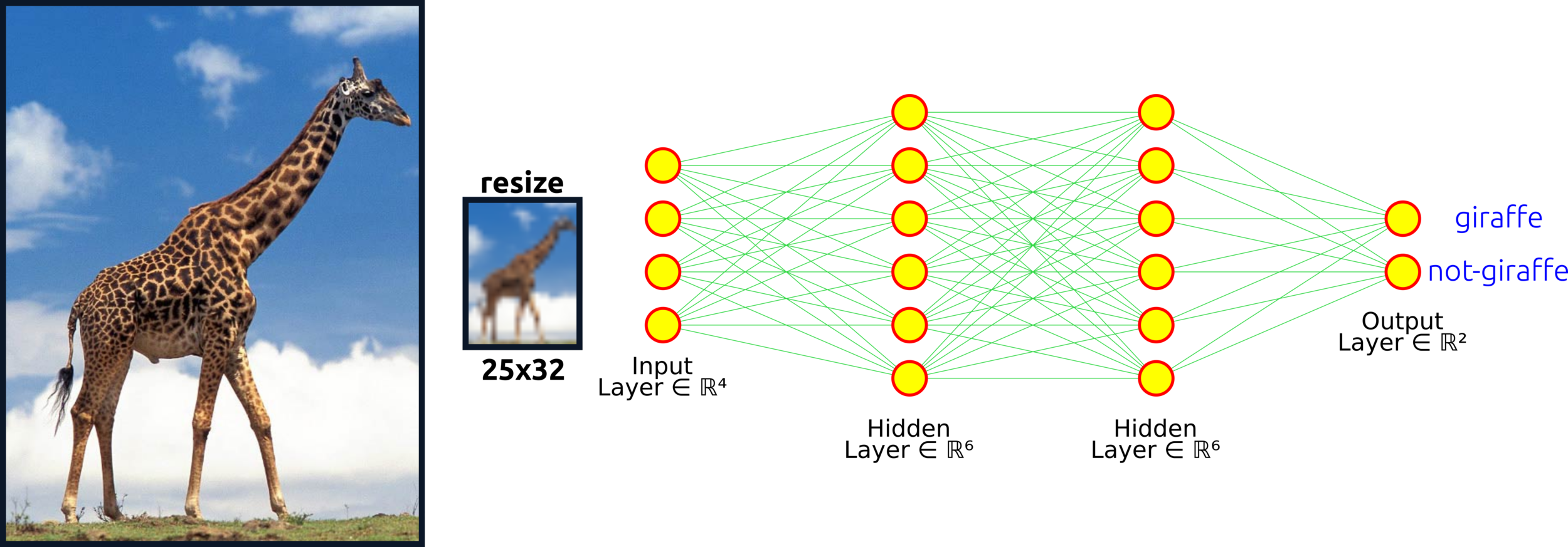 Hidden layer: the first learning process starts from this layer. Increasing nodes and layers here can help the algorithm classify data better. For example, the eye of the giraffe might be extracted from some node in the layer. Keep in mind that adding more nodes and layers will in crease computational cost.