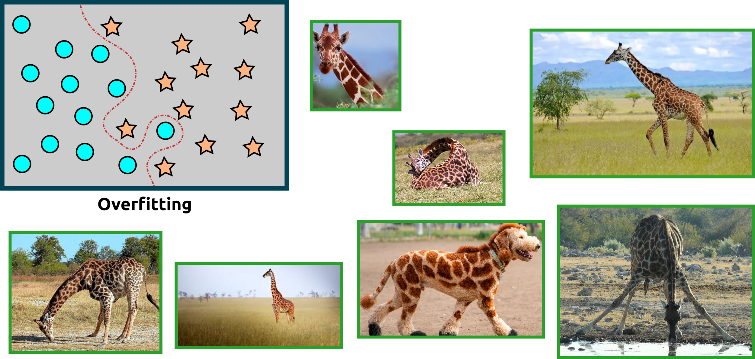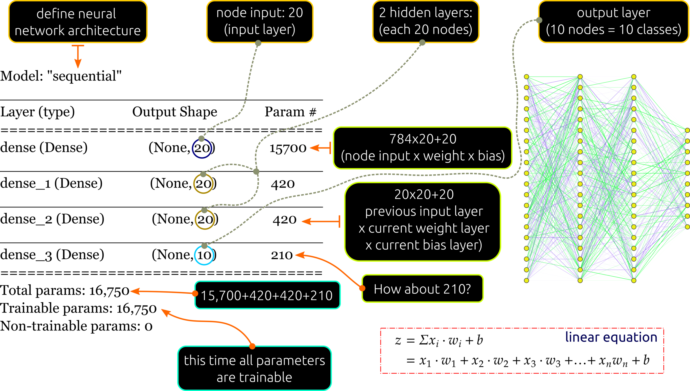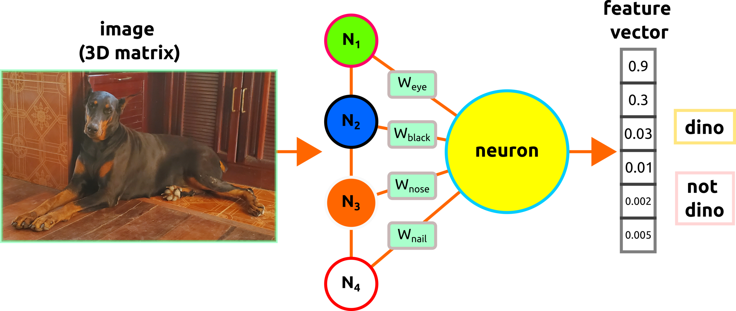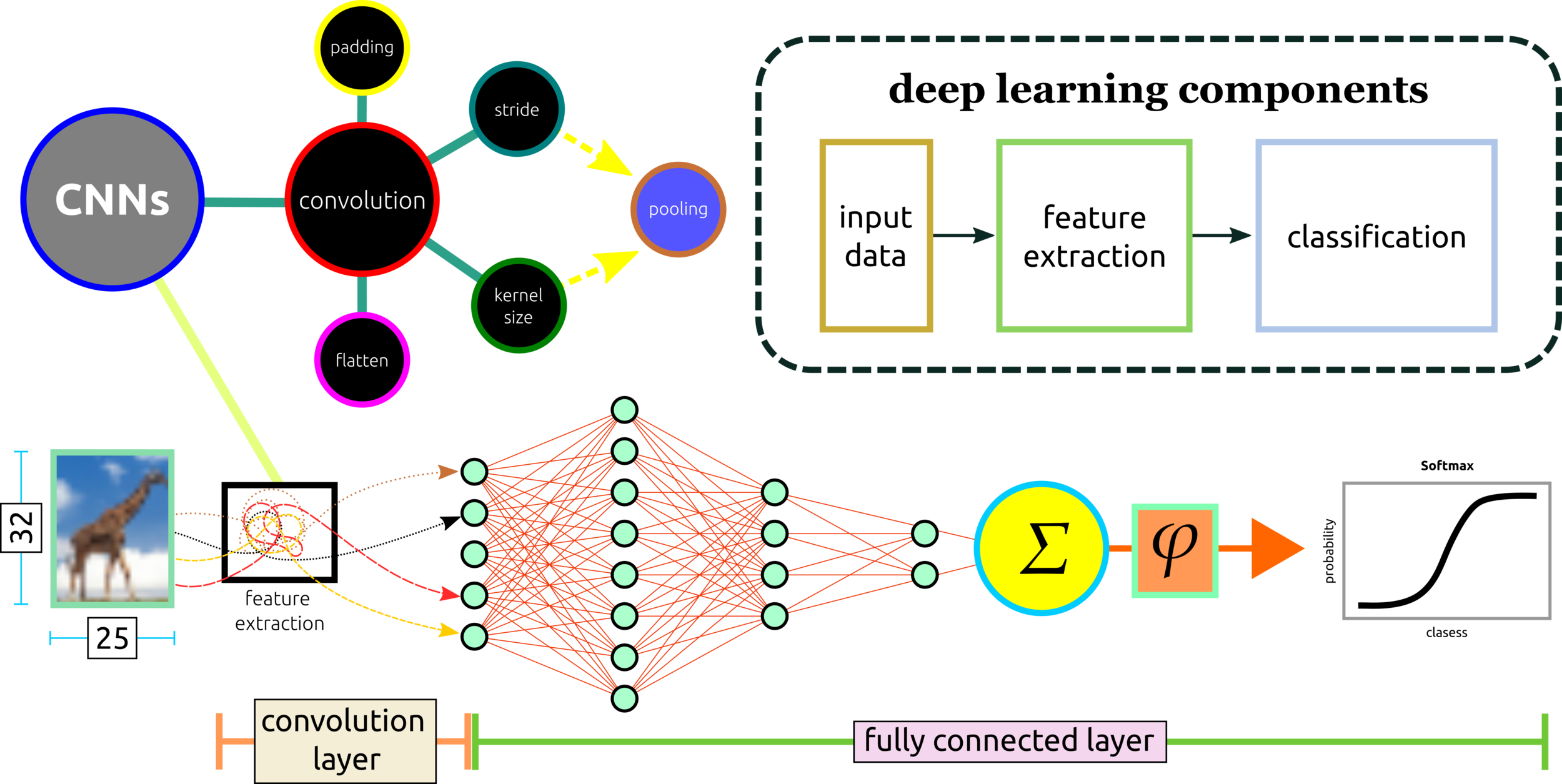 Hidden layer: the first learning process starts from this layer. Increasing nodes and layers here can help the algorithm classify data better. For example, the eye of the giraffe might be extracted from some node in the layer. Keep in mind that adding more nodes and layers will in crease computational cost.