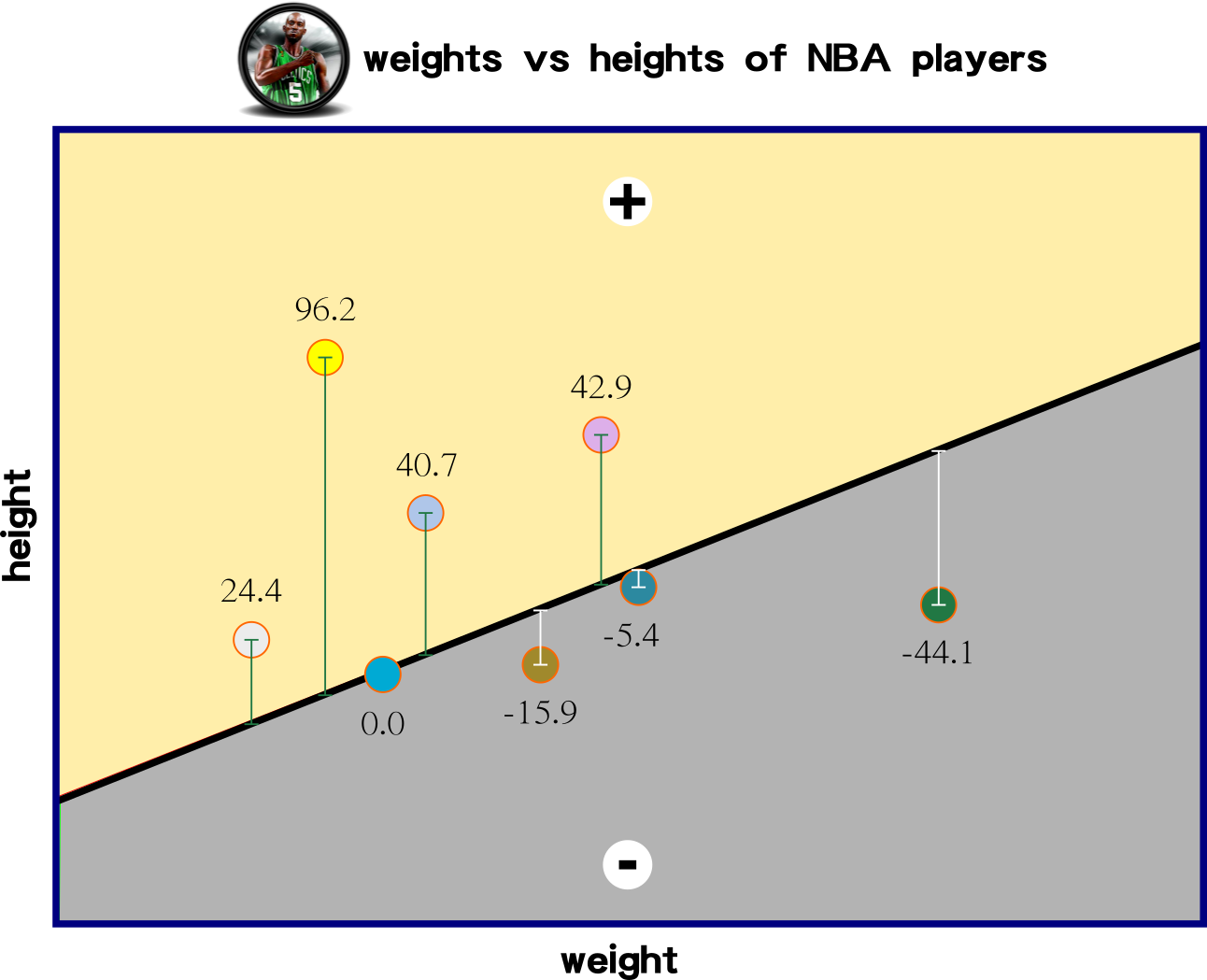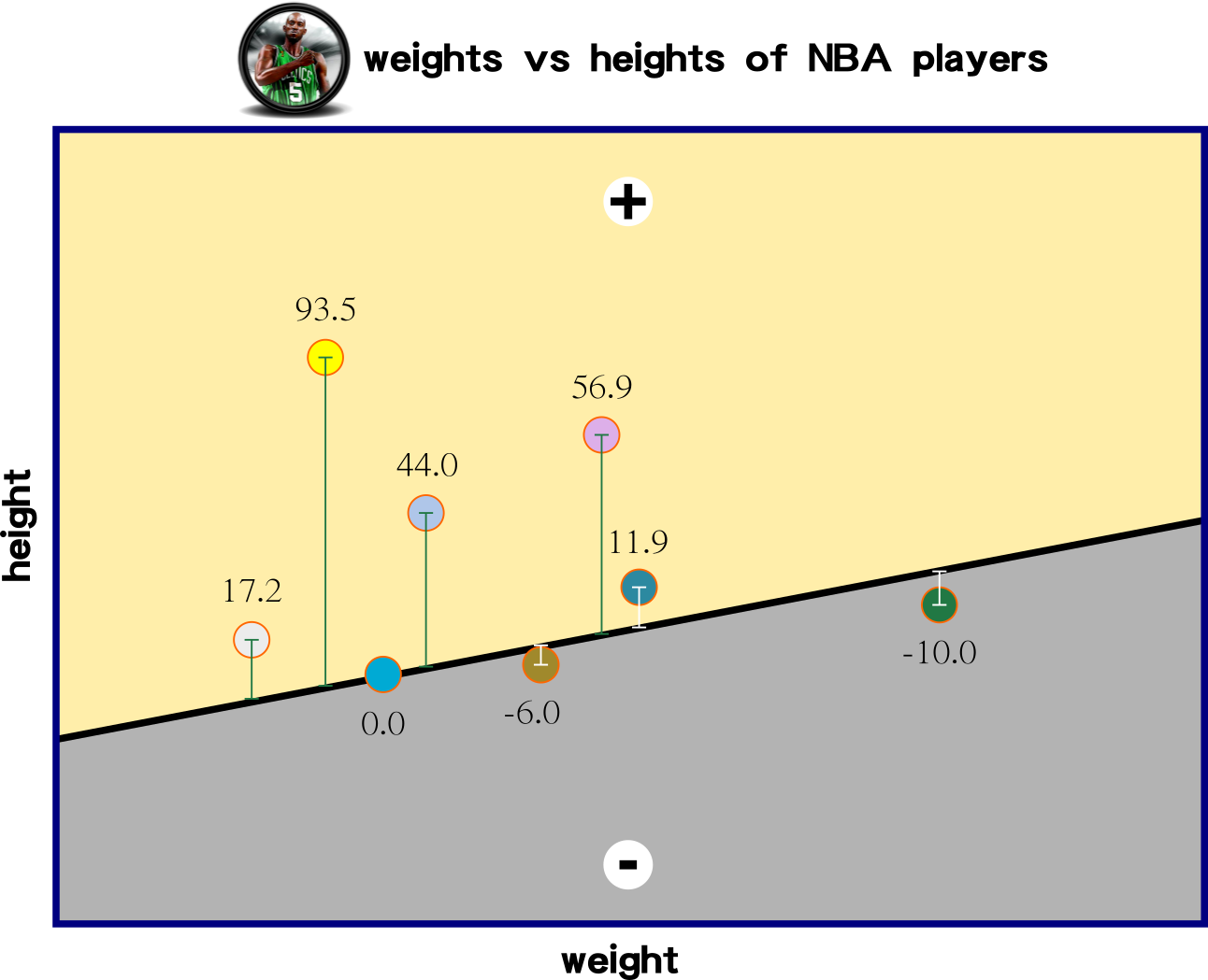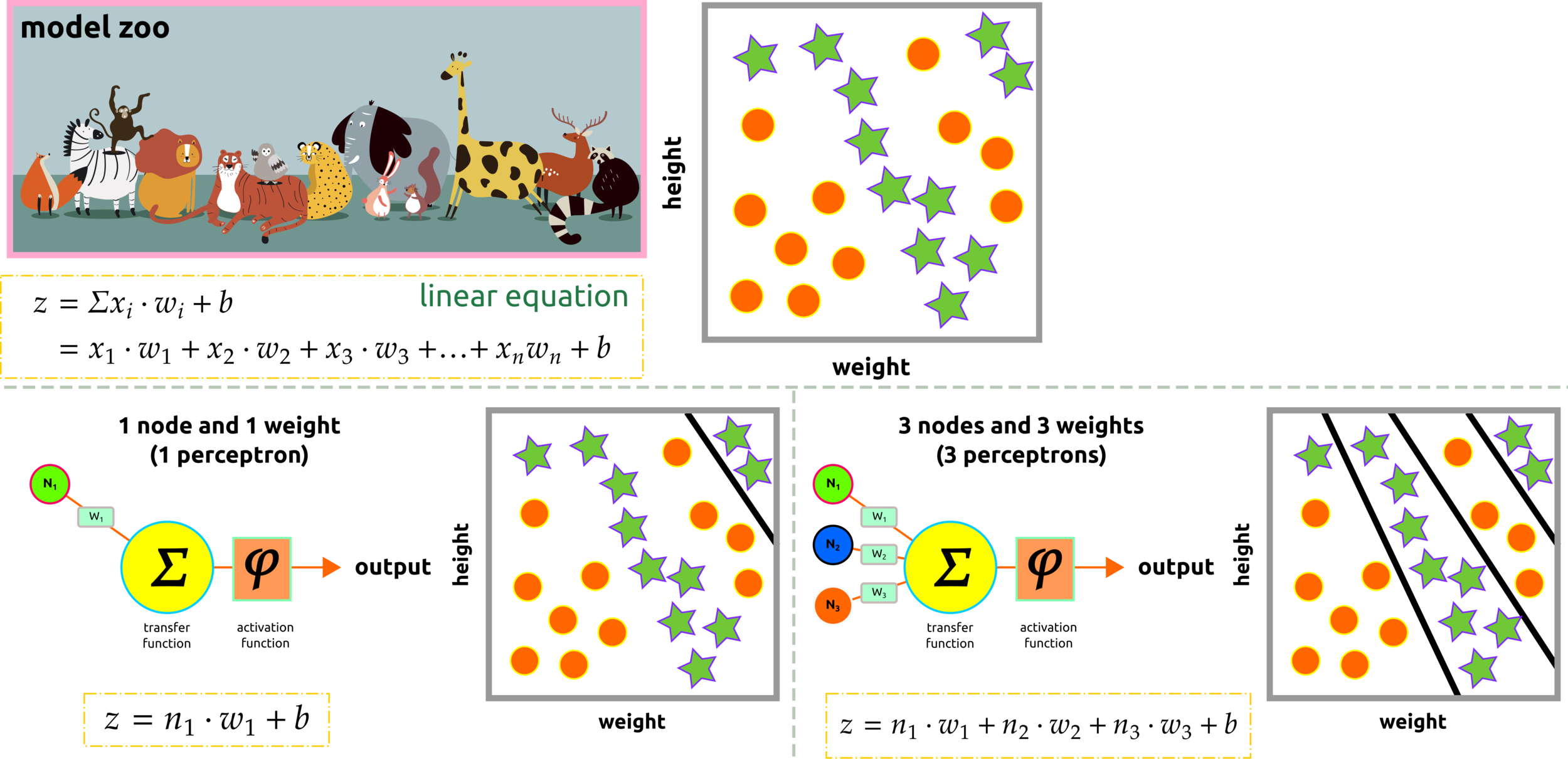Perceptron uses linear classification to classify a dataset. Model zoo represents animal classification based on two input features, namely height and weight. Clustering the data requires more than one perception; perhaps non-linear classification should implement here.