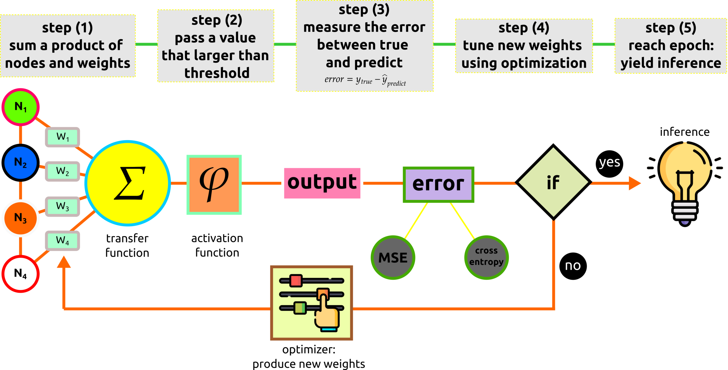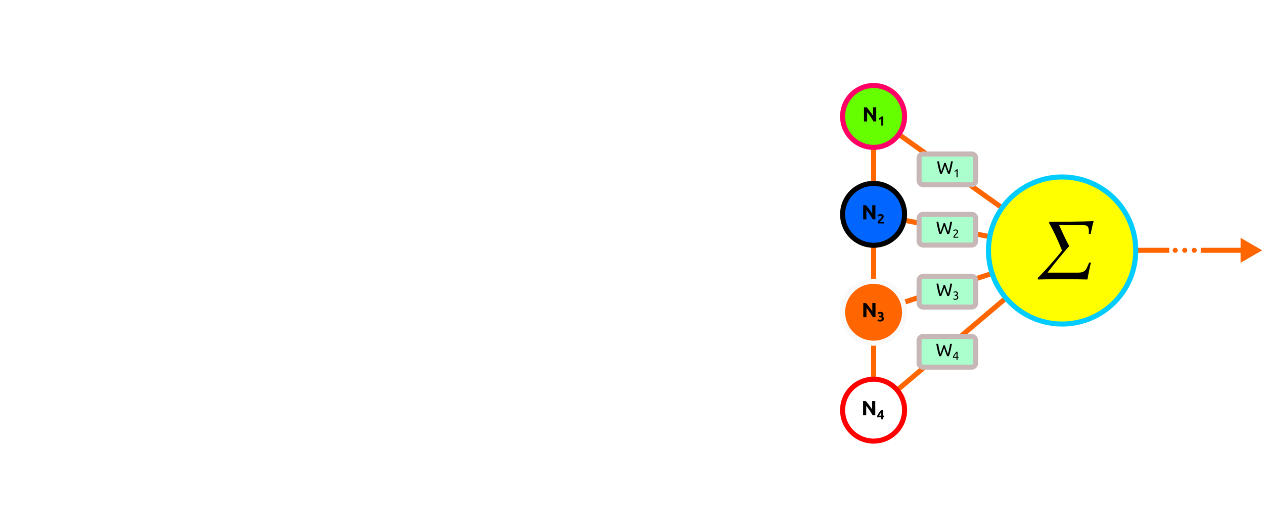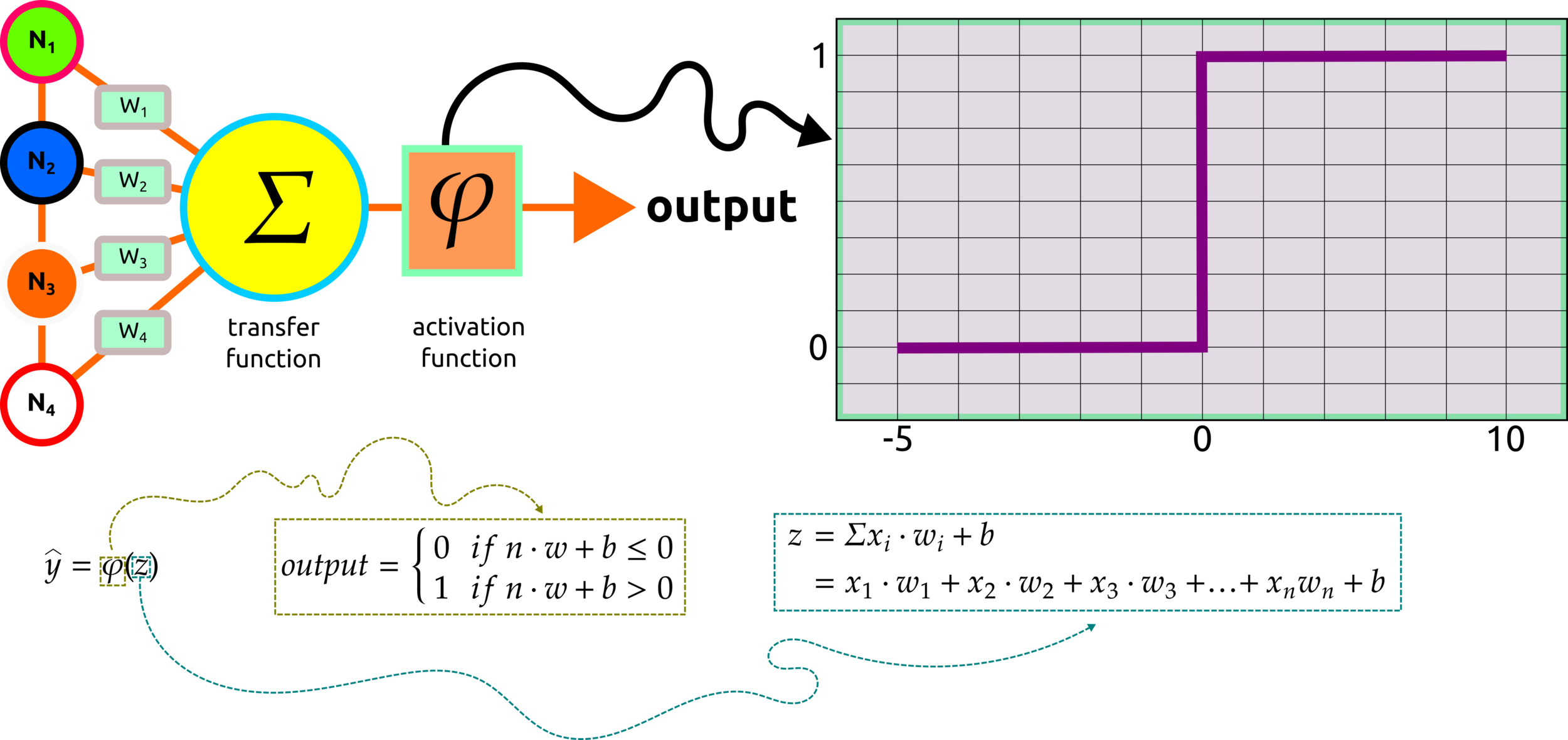 After the transfer function, the summed product of nodes and weights, the activation function will be applied, and the outcome from this process will remain only positive values.