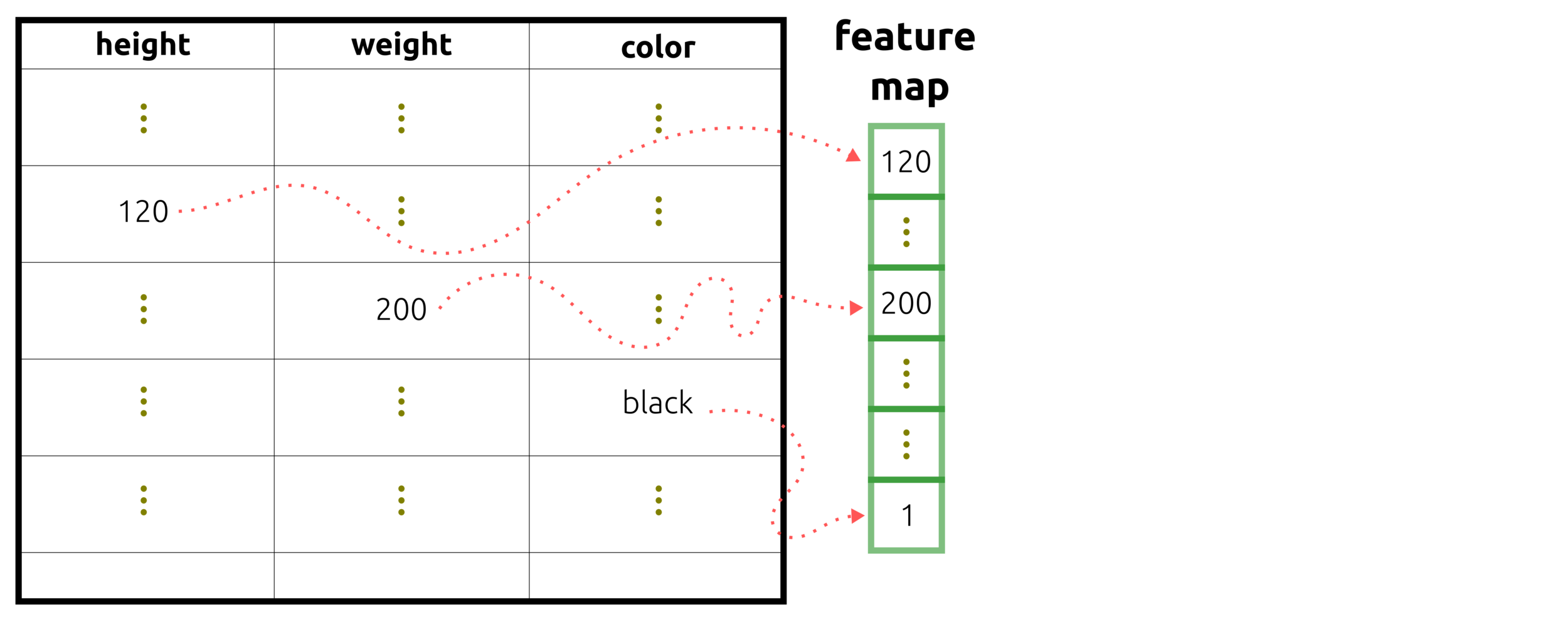 The input data passing to a feature map or multi-nodes can be a vector and matrix. Before this process, hot-encoder or feature extraction is required.