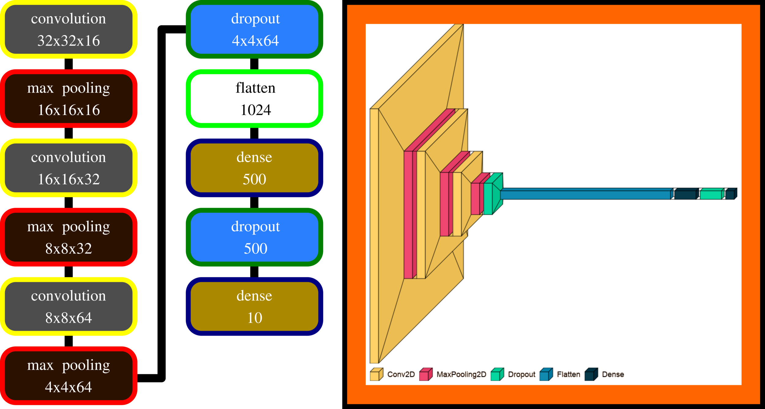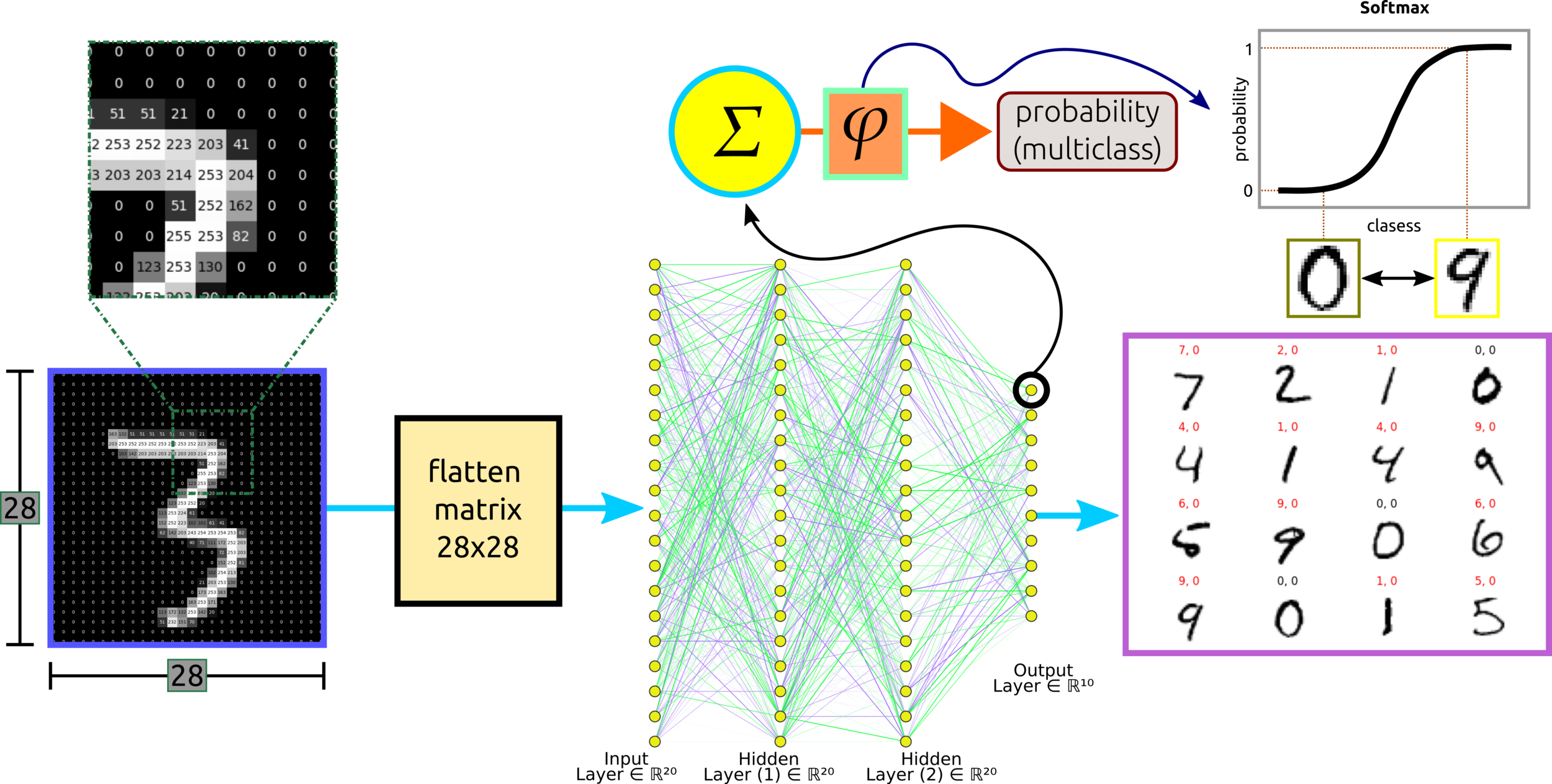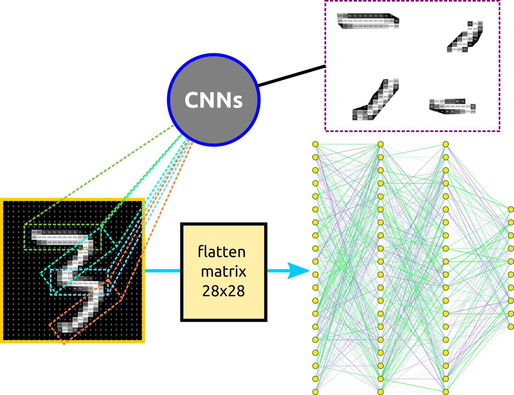 Input layer: one node contains one pixel, so the first layer has 25x32 = 800 pixels. In the case of a complex network, the input layer might be an extracted feature (3D matrix).