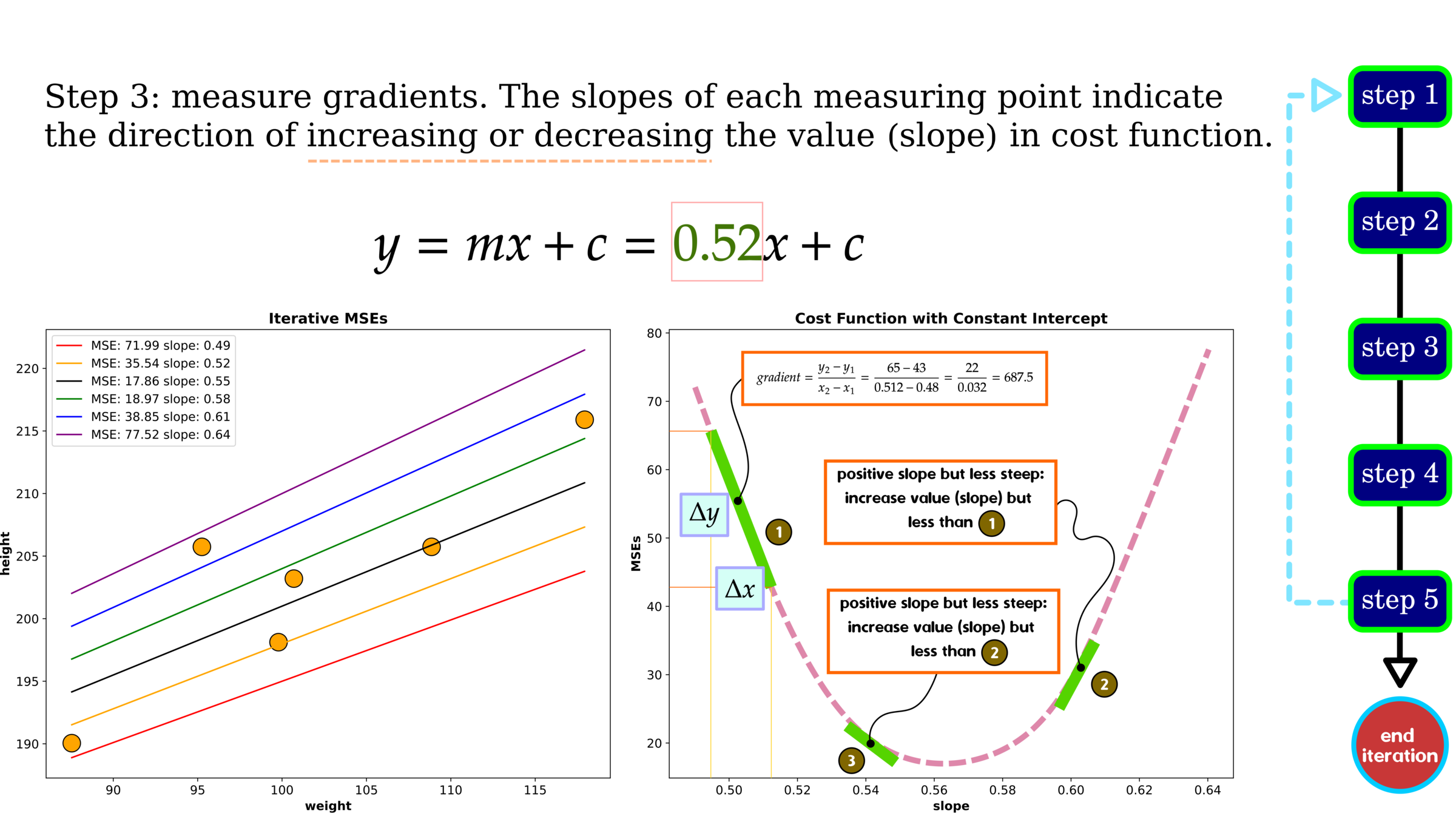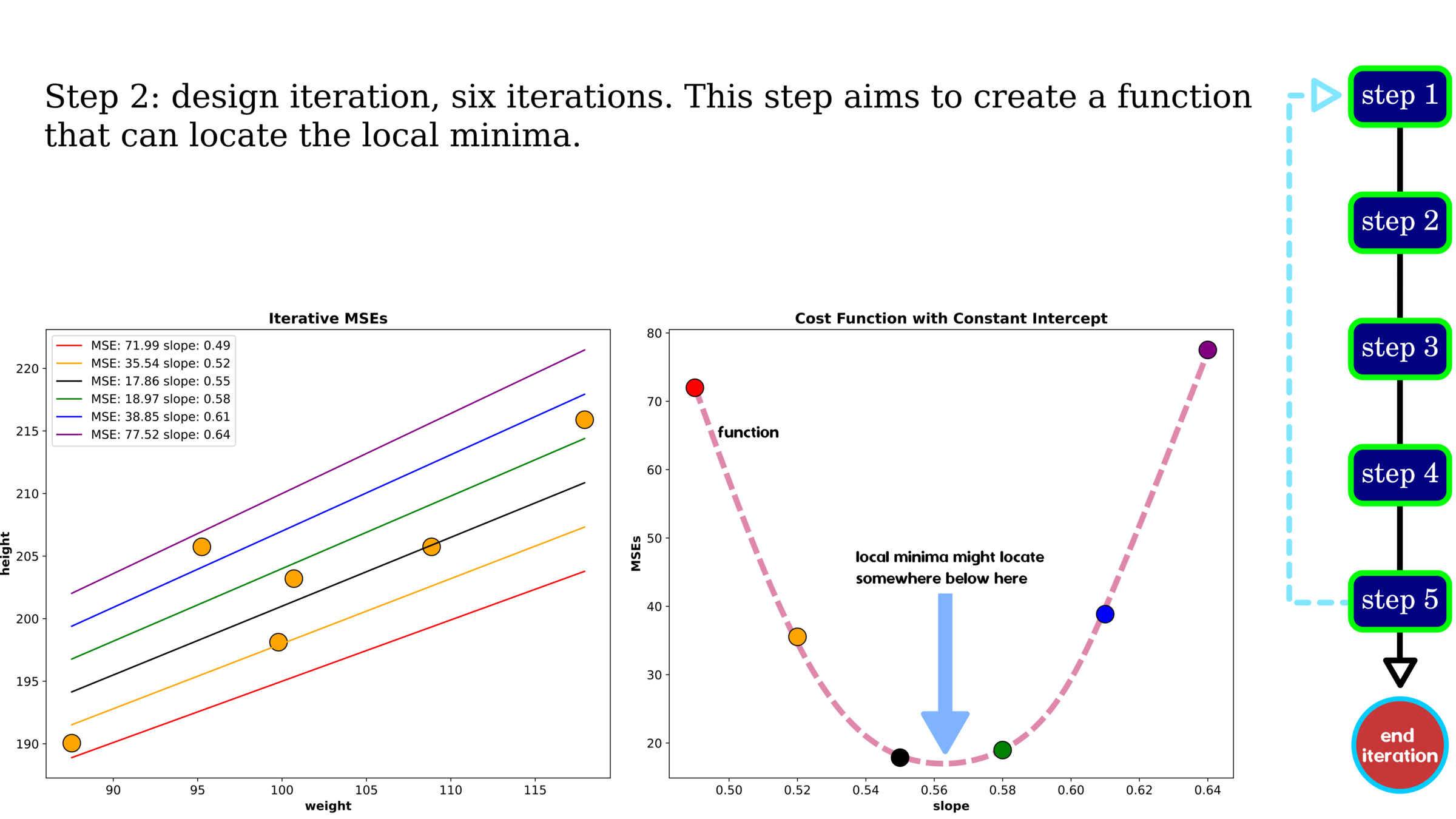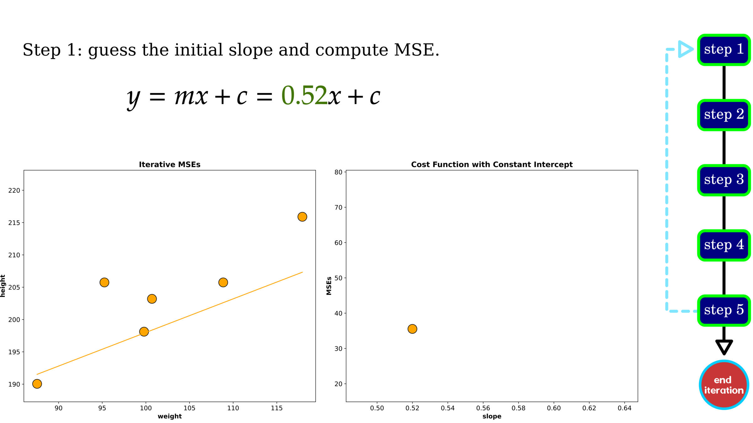 Rather than trying one pair of slope and intercept, we tested 400 values for each parameter, yielding the result on LHS. On RHS is an example of a selected pair of slope and intercept.