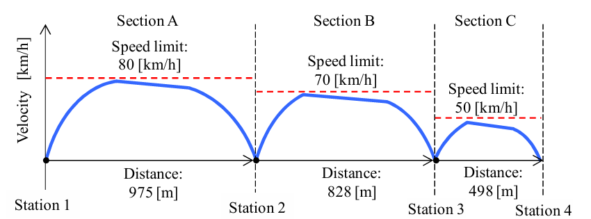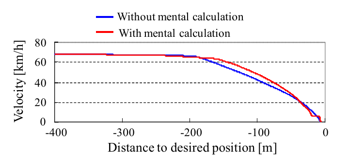 利用平均加(減)速度的概念。若平均加速度大於期望加速度,則列車會在指定位置前停下;反之,則會在指定位置後停下
