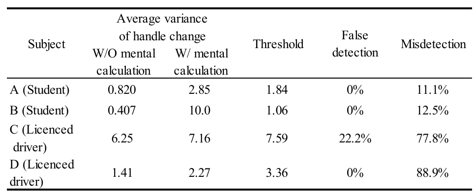 實習駕駛在正常狀況下展現出良好操作行為,且面對異常時的行為變化非常明顯,故分析準確率高;反觀職業駕駛不管有沒有次要任務在身都展現類似行為,故分析準確率低